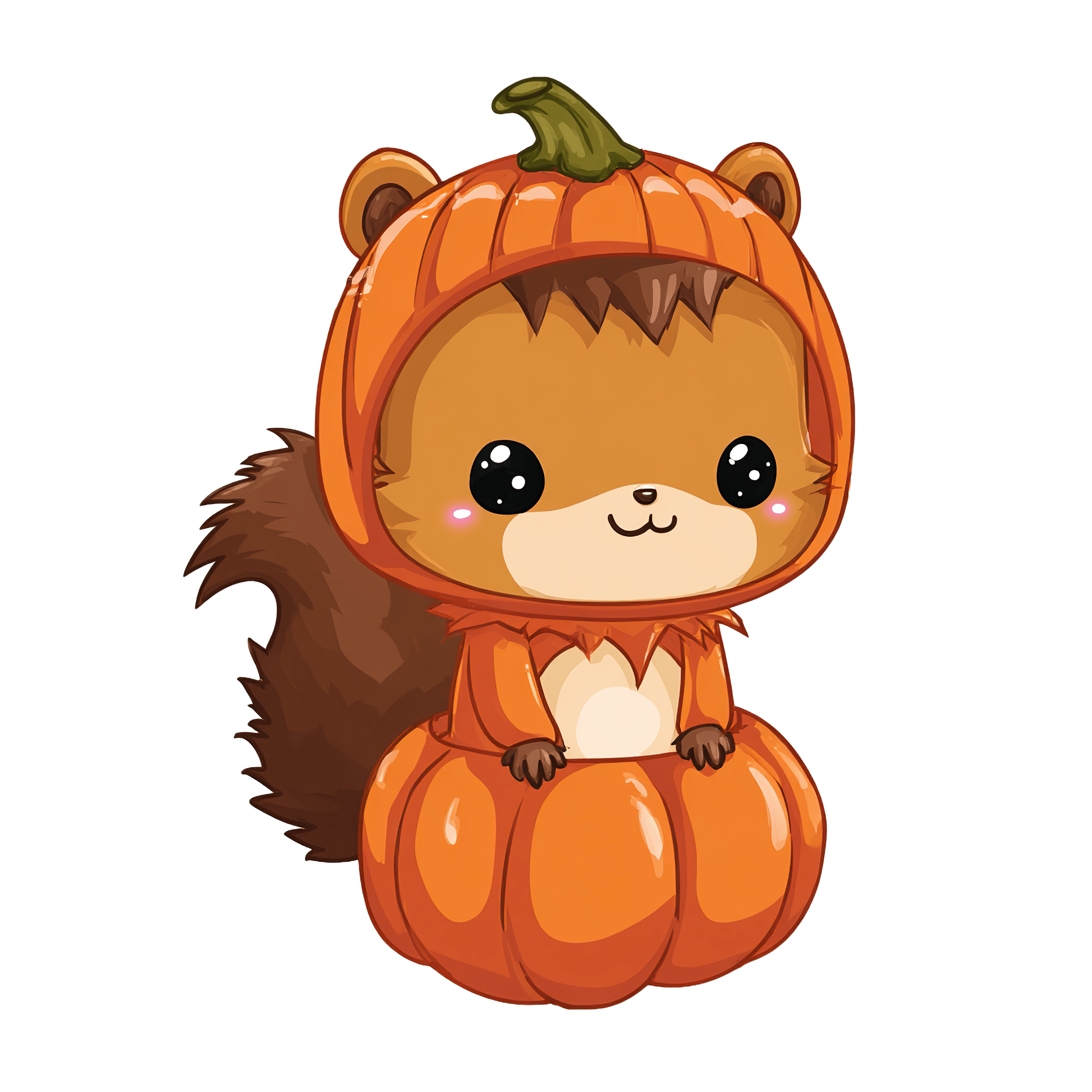 Squirrel dressed in a pumpkin-themed costume, highlighting a brown tail and light brown fur. Its outfit resembles a pumpkin with a green stem on top, blending Halloween and autumn themes. The character sits inside a large pumpkin section, adding a quirky seasonal touch.