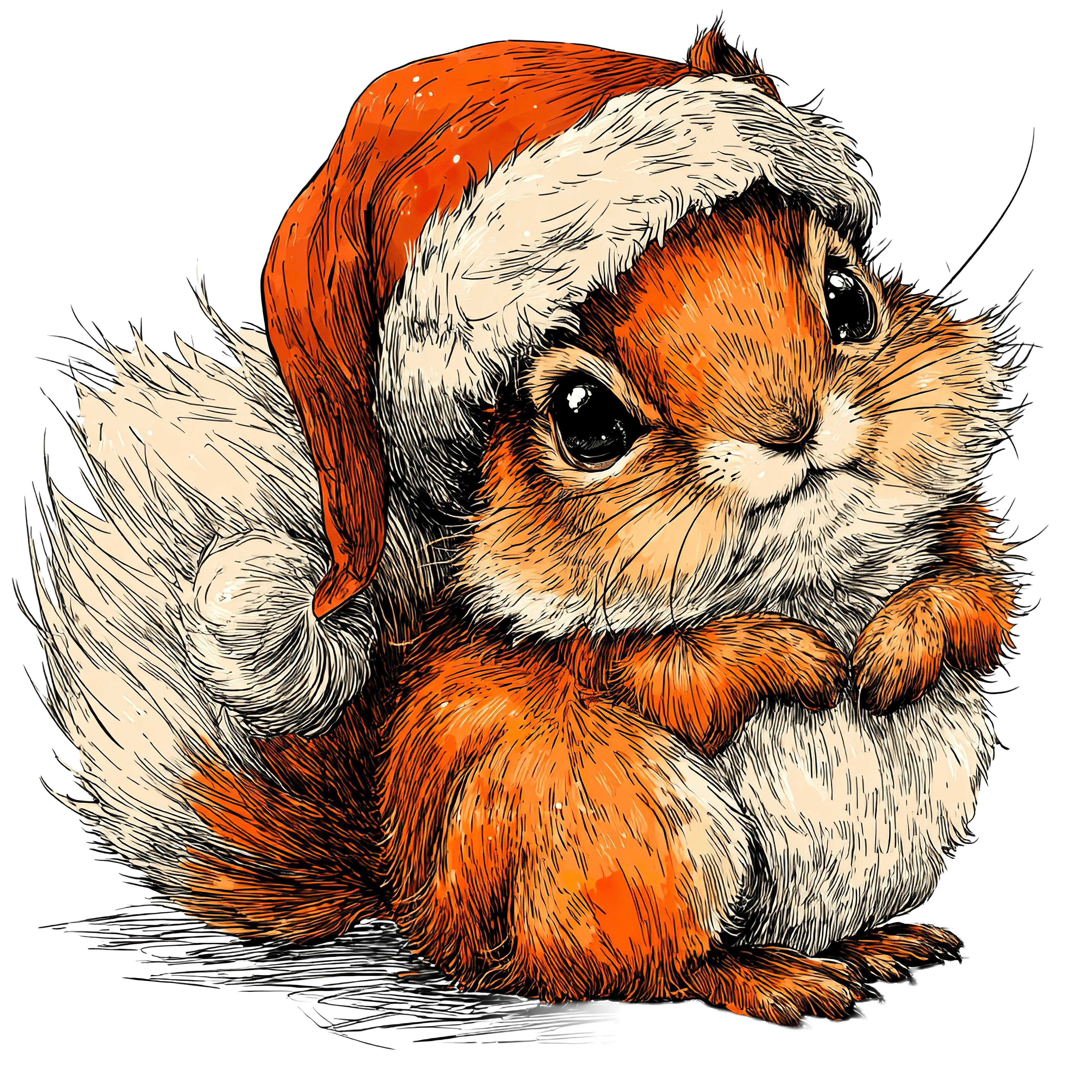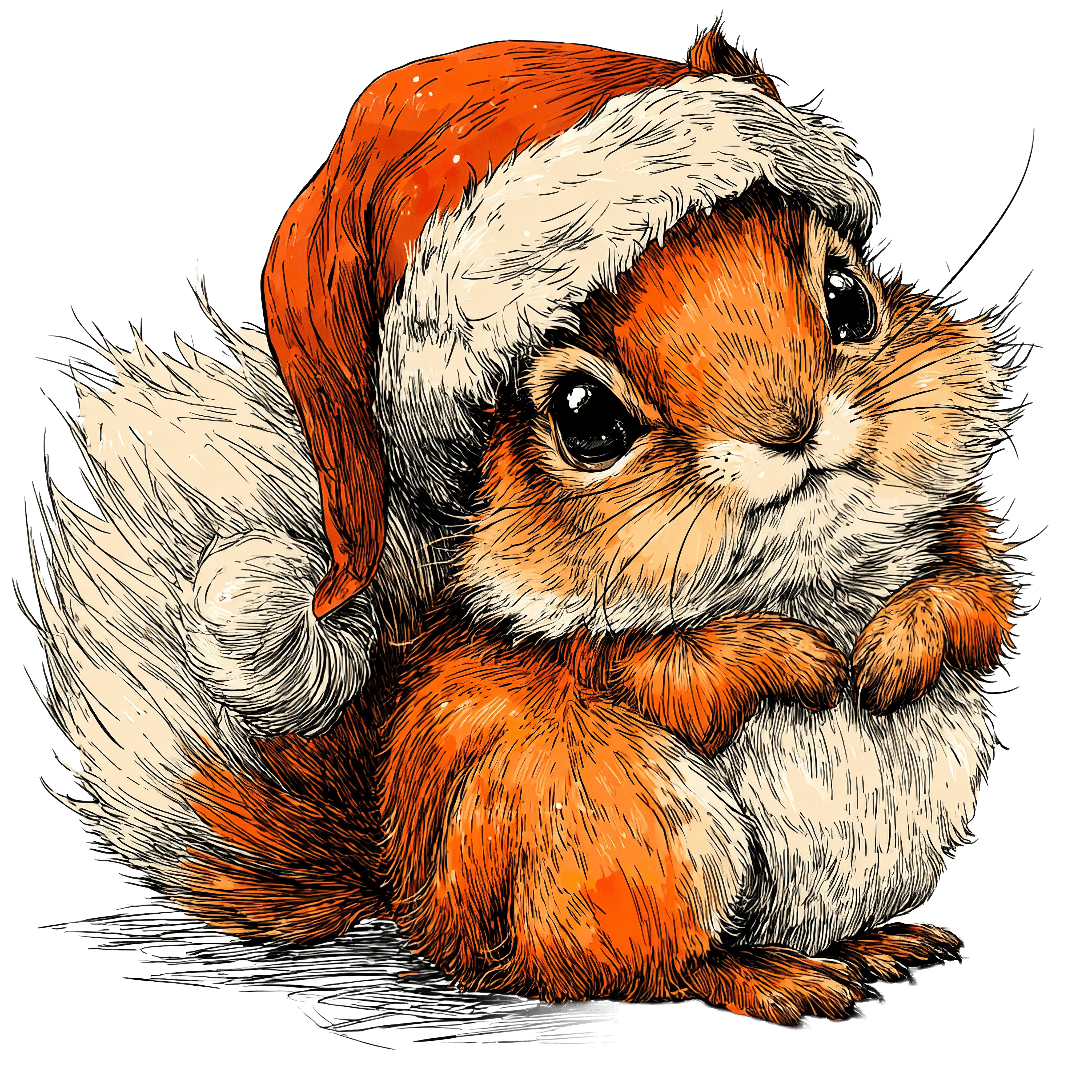 Squirrel with detailed orange and white fur, wearing a classic red Santa hat. The illustration captures the furry texture distinctively, highlighting the expressive eyes and bushy tail. The combination of festive elements and realistic fur textures brings a unique contrast, making it suitable for holiday designs.