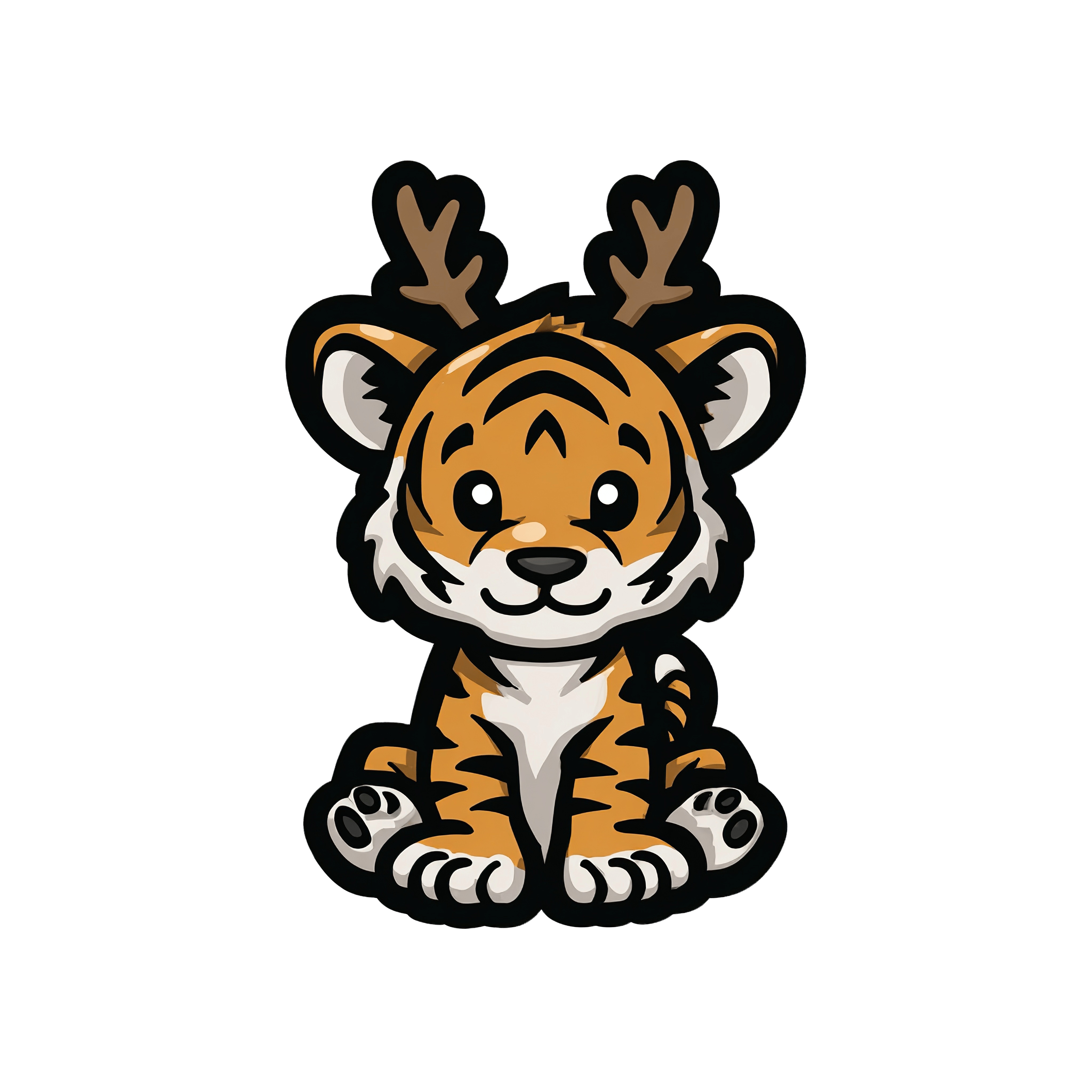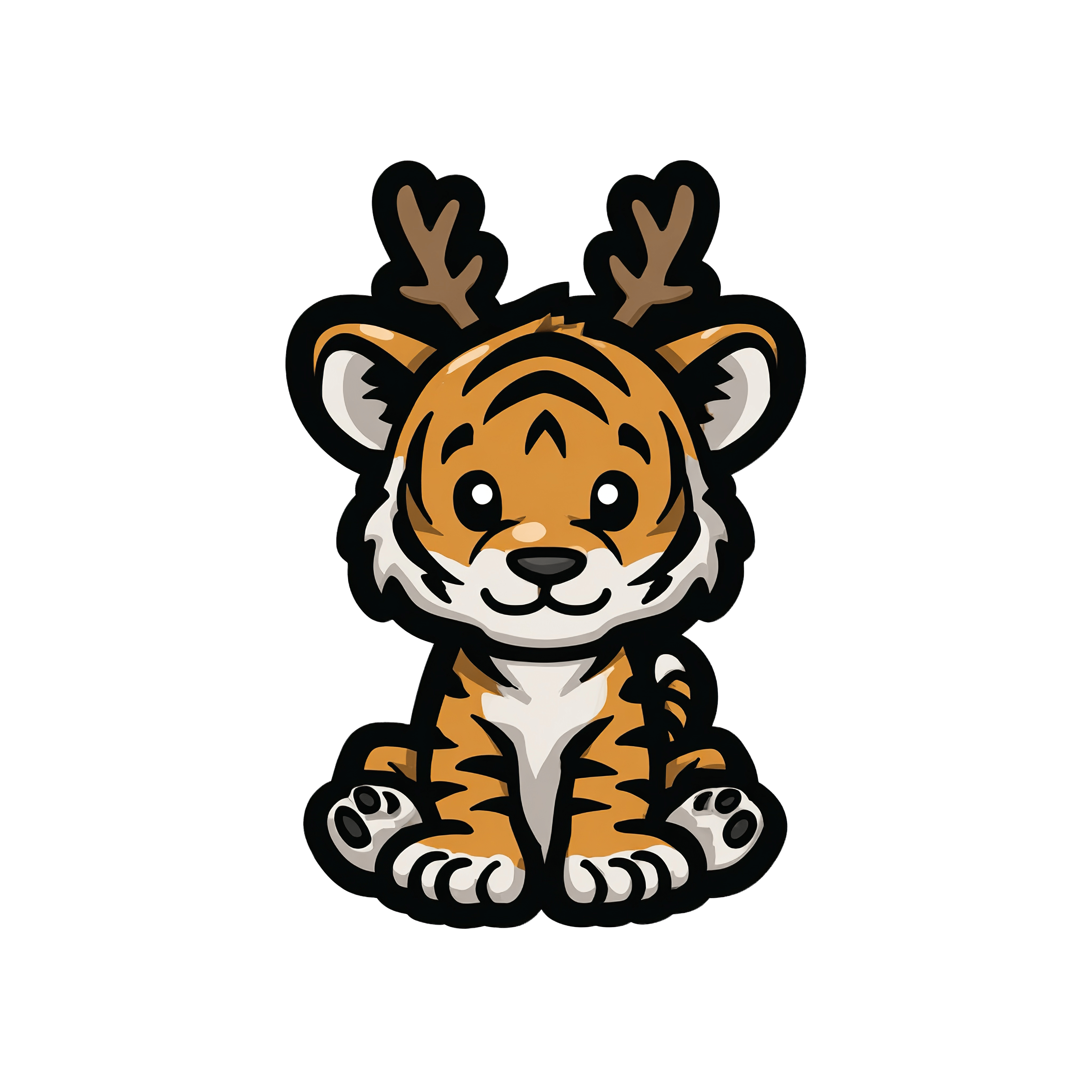 Tiger sitting with antlered head, presenting a blend of wild and whimsical. The body features classic orange and black stripes, while the antlers add an unexpected element. Black outlines accentuate features, creating a bold appearance against a simple silhouette. The design maintains a balanced look, suitable for a variety of themes and uses.