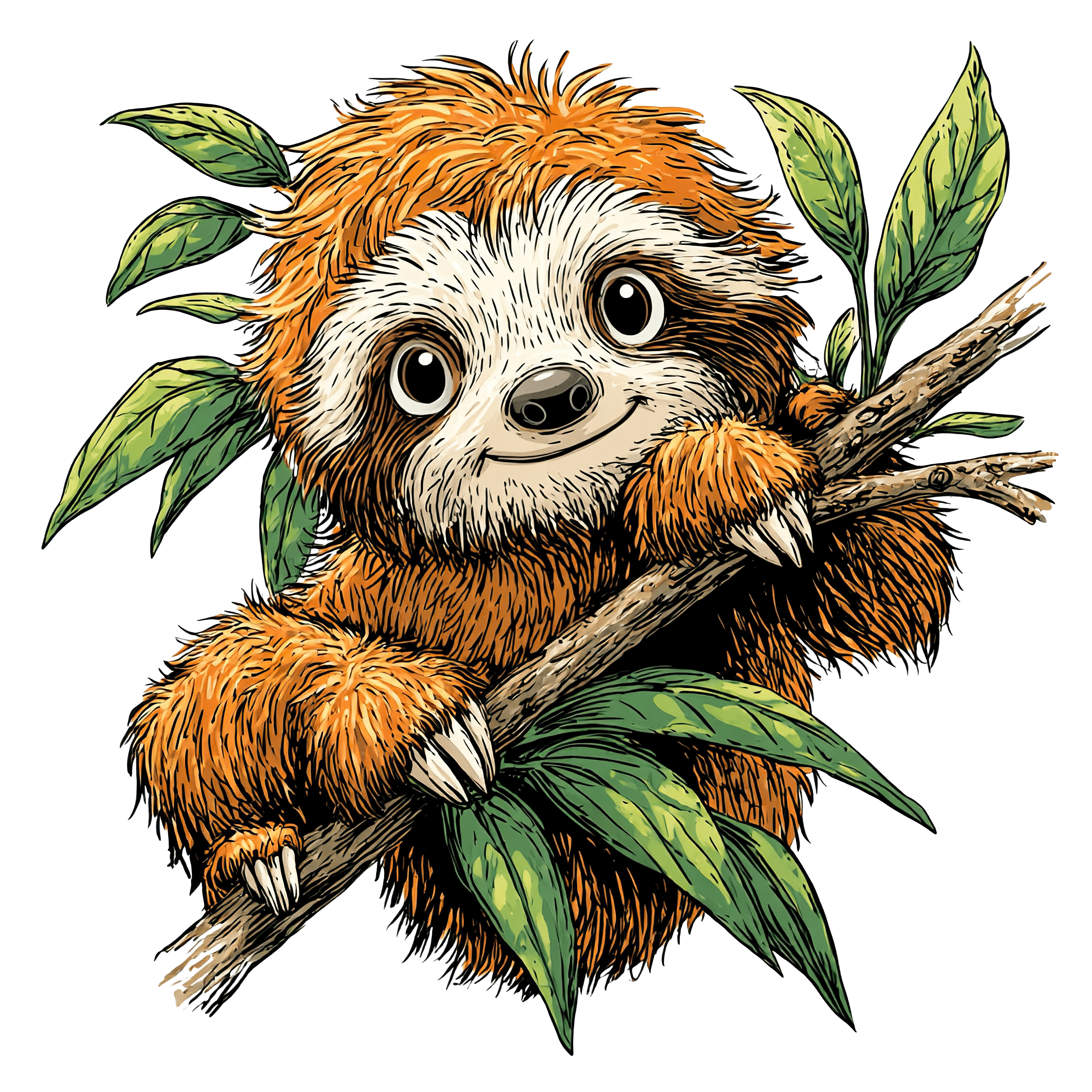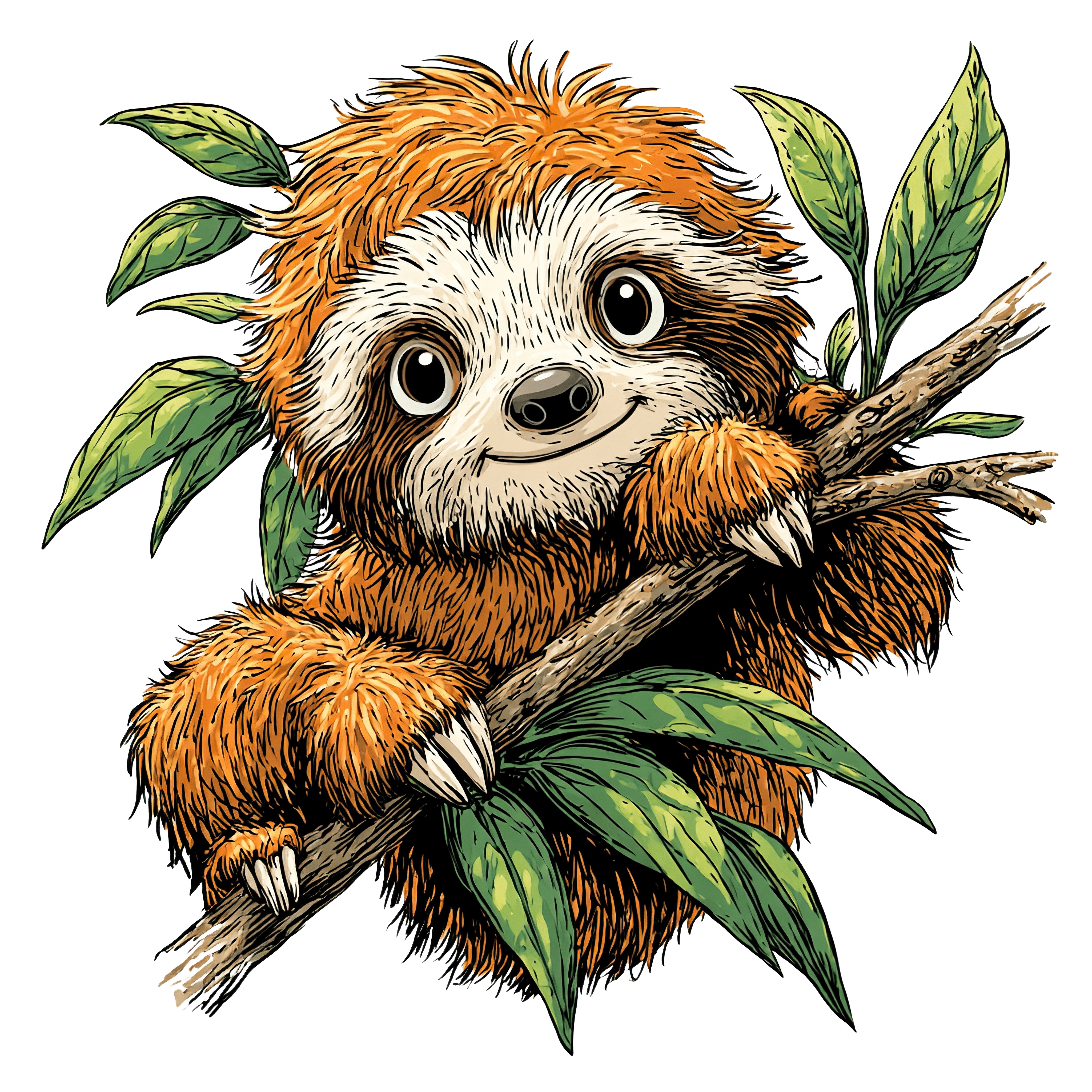 Sloth with orange-brown fur rests on a branch, surrounded by green leaves. The illustration captures the sloth’s distinct facial markings and large eyes, emphasizing its gentle expression. Detailed fur texture and natural leaf shades provide a realistic touch.