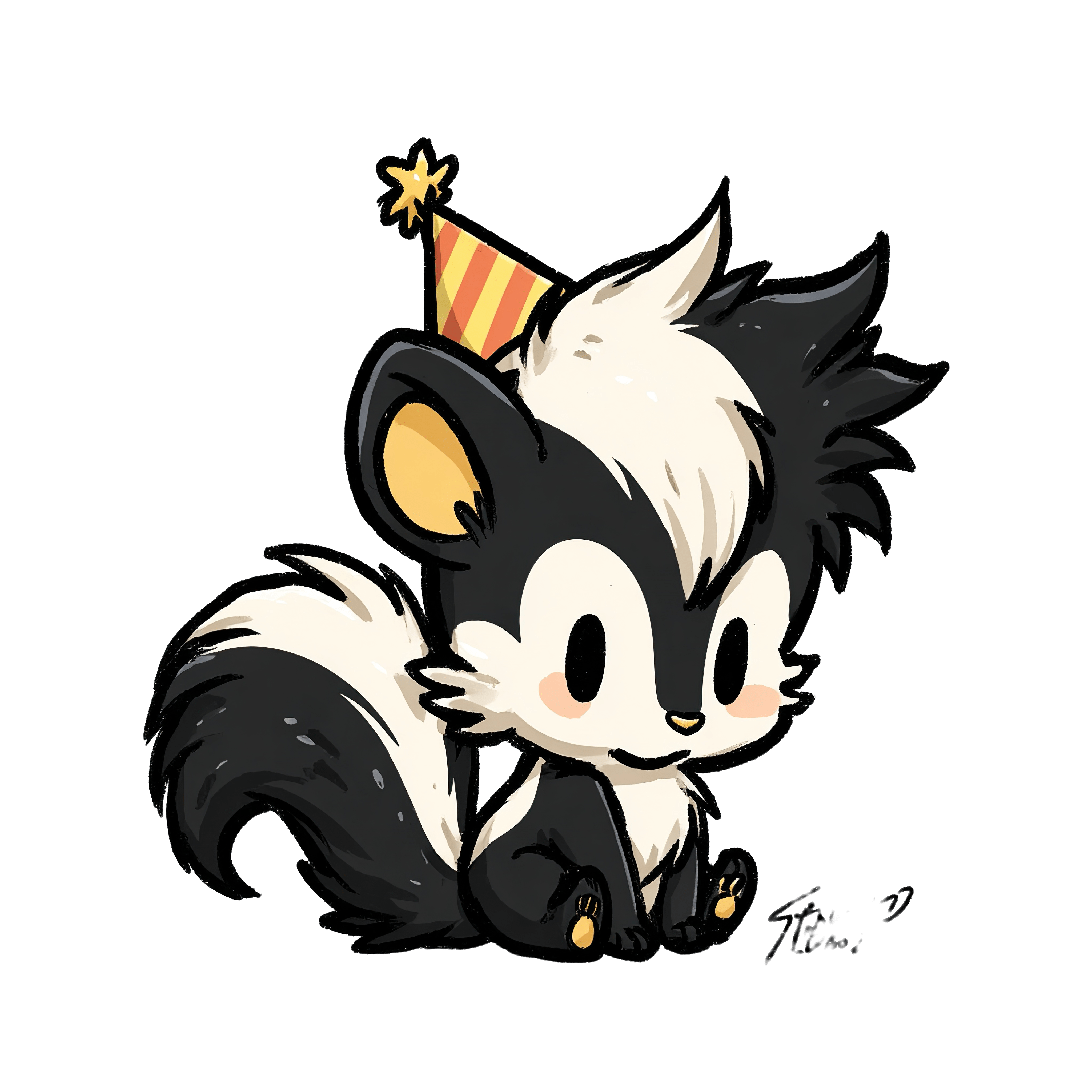 Skunk sitting with a striped party hat, showing its distinctive black and white fur pattern with perked ears. The skunk’s bushy tail and calm pose form the central elements, highlighted by simple, bold black outlines enhancing the graphic style. The hat adds a touch of celebration, suggesting a festive occasion or theme for the character.