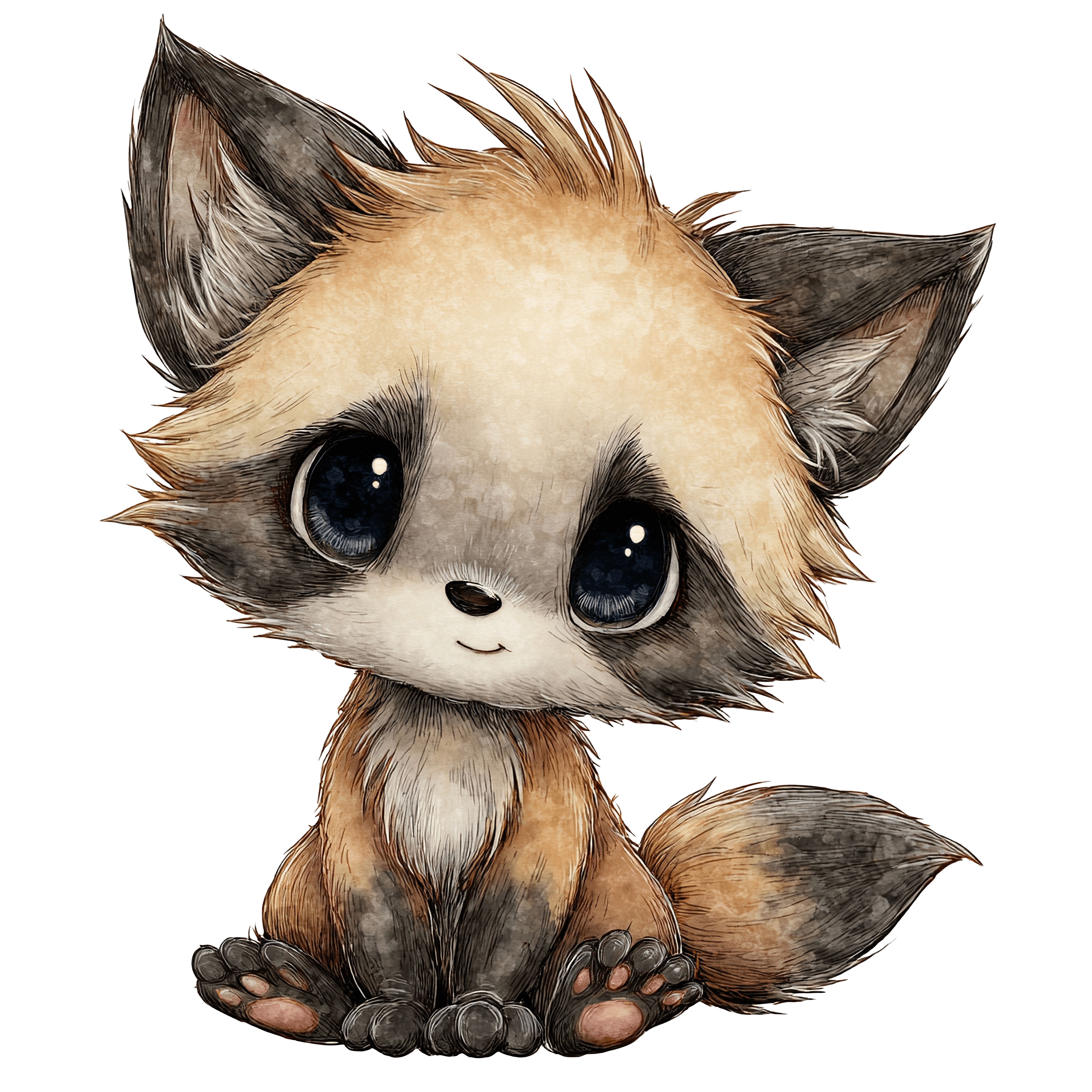 Watercolor illustration of a raccoon, showcasing its fluffy tail and large, observant eyes. The raccoon displays detailed fur patterning in shades of grey, black, and cream. The creature's paws and ears are prominently visible, adding to the intricate detailing. This artistic rendering suits various creative projects and educational materials.