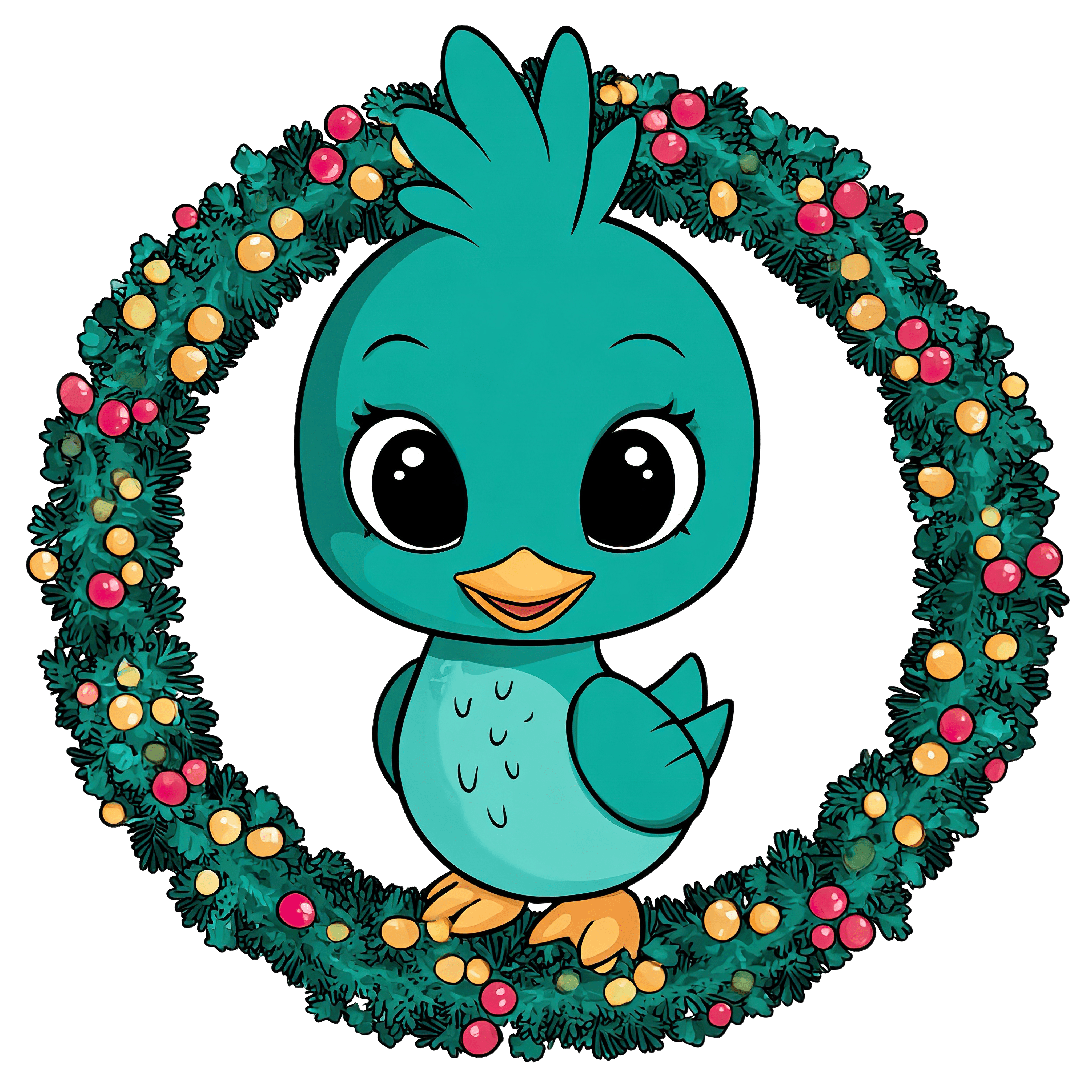 Teal bird stands at the center of a decorative holiday wreath. The bird features prominent eyes, a yellow beak, and small wings. The wreath is adorned with colorful orbs, including red, yellow, and orange elements, giving a festive appearance. The bird's simple design and the bright, ornamental wreath highlight a cheerful seasonal theme suitable for various applications.