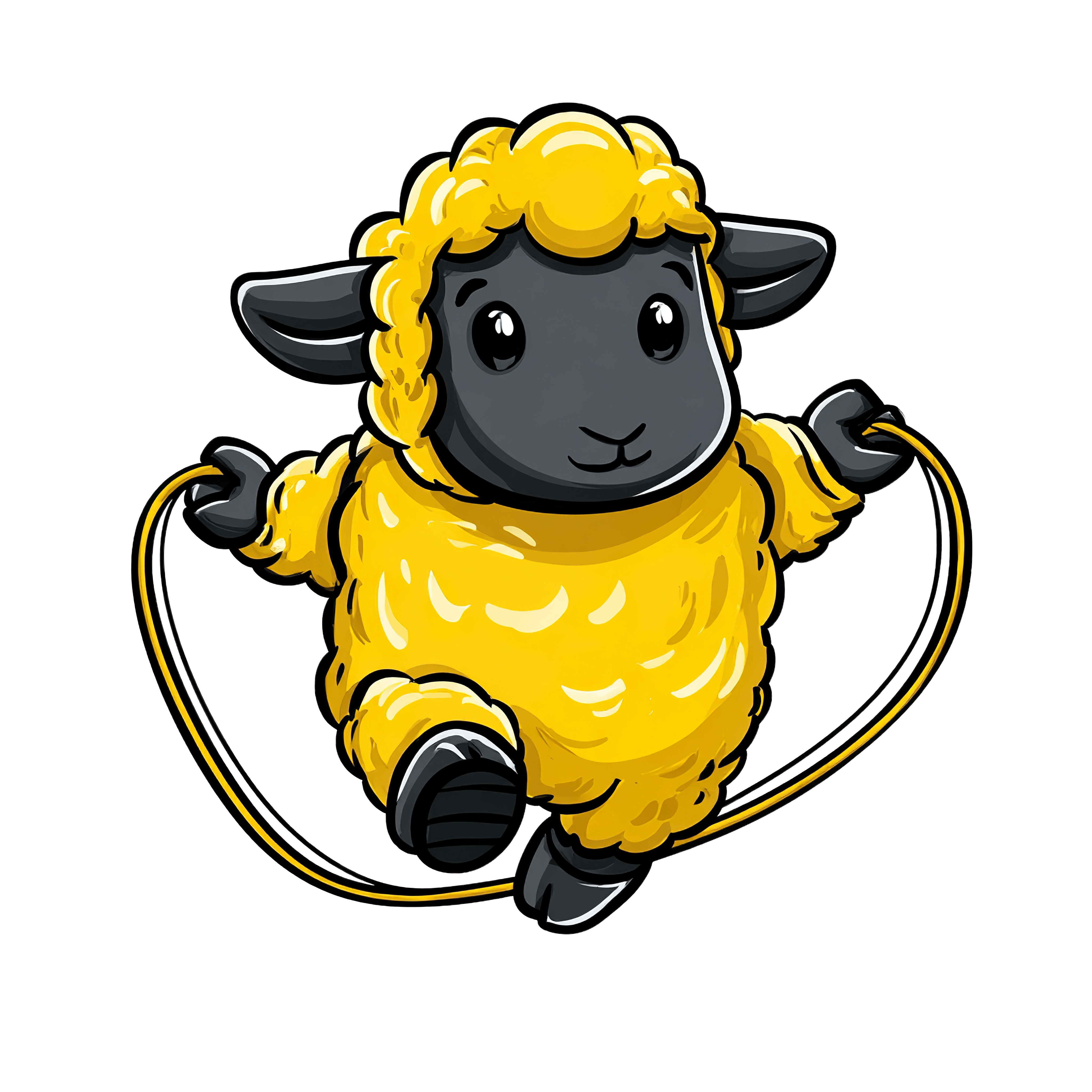 Yellow fluffy sheep cartoon actively jumping rope, with a contrasting black face and ears. The sheep is mid-jump, holding the rope handles securely in its hooves, creating a dynamic and playful scene. The bright yellow wool stands out against the dark features, enhancing the cheerful and lively appearance typical of playful cartoon designs. Perfect for use in children's activities or educational materials.