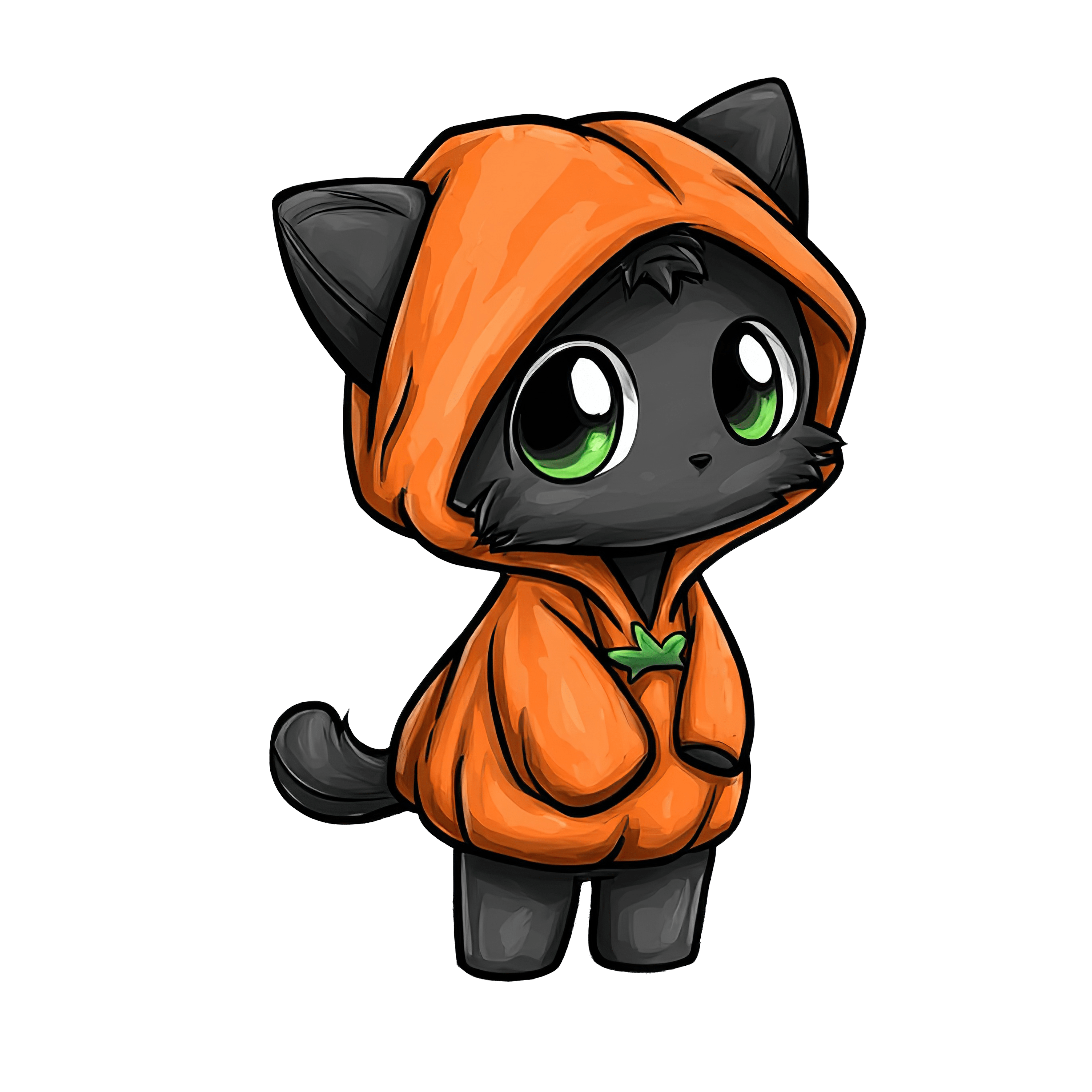 Black cat with green eyes dressed in an orange hooded outfit. The hood features a small stem detail, adding a whimsical touch. The simplistic cartoon style enhances its character, and the lush black fur contrasts sharply with the bright orange costume.