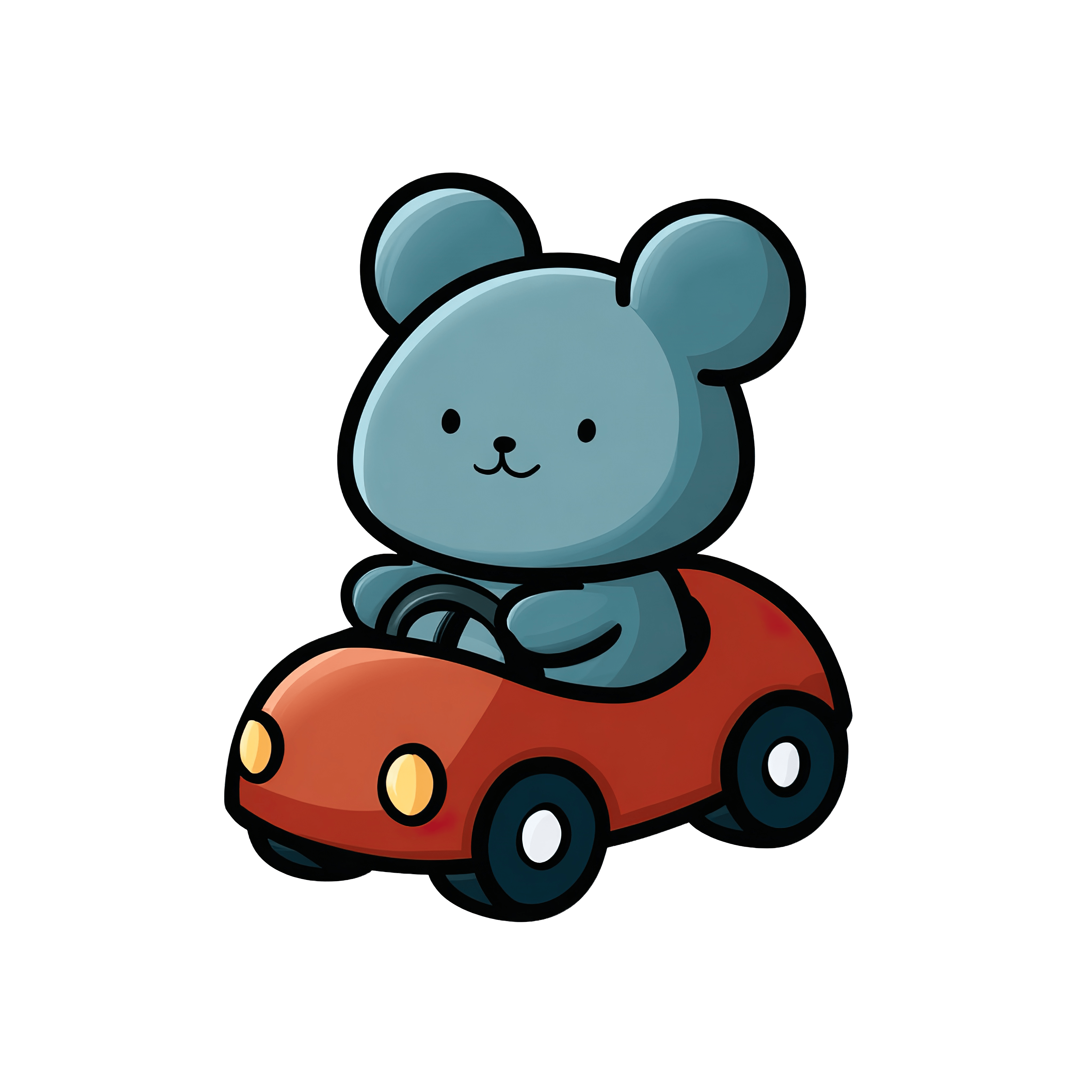 Bear driving a small, red cartoon car. The bear is depicted in a minimalist style with blue tones, seated inside the car with round headlights and simple detailing. The illustration captures the character in a playful position, providing a versatile design element for various uses.