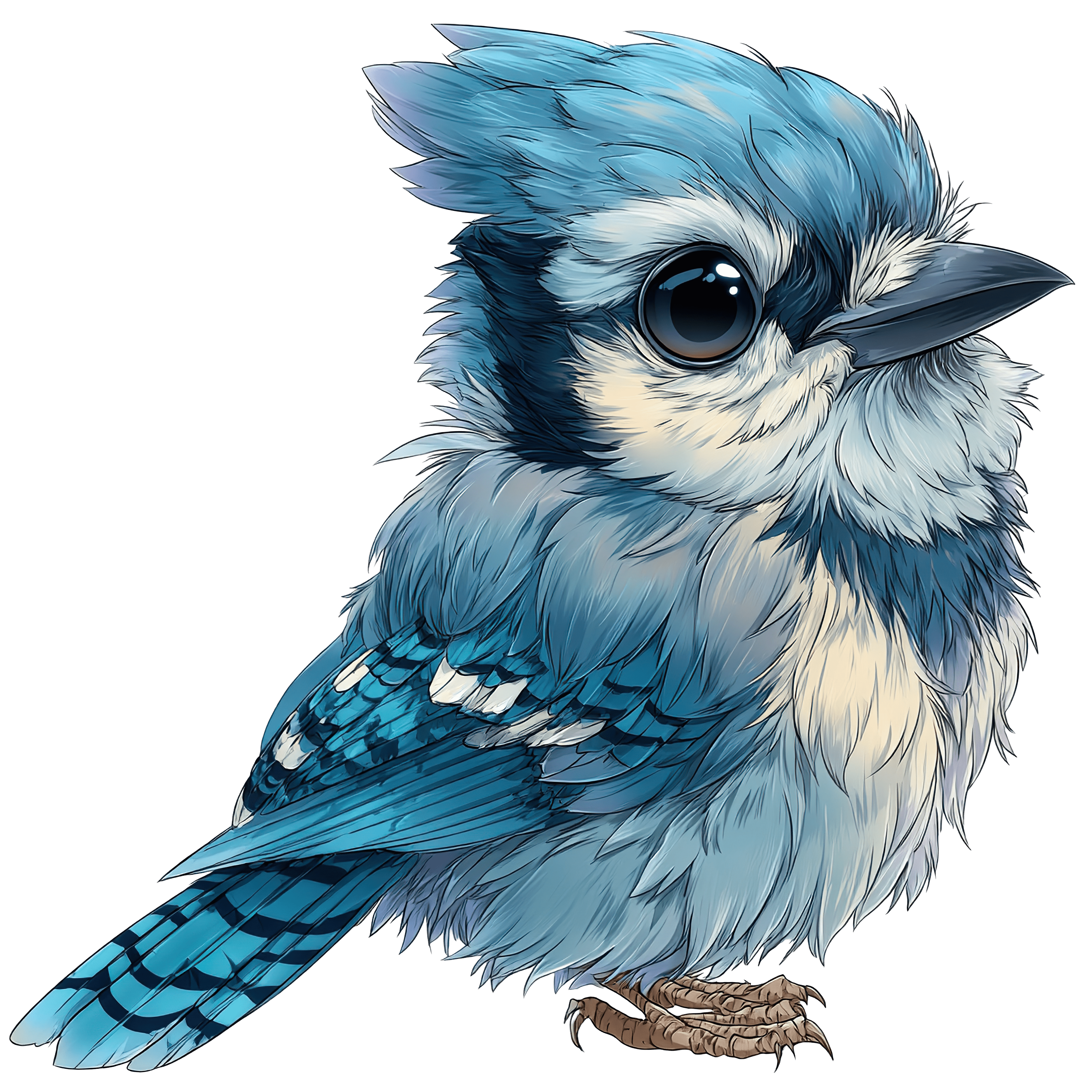 This charming clipart features a fluffy blue jay, depicted in a cute and cartoonish style. Its vibrant blue and white feathers and large, expressive eyes give it a playful and whimsical appearance. Ideal for creative projects that need a touch of nature or cuteness.