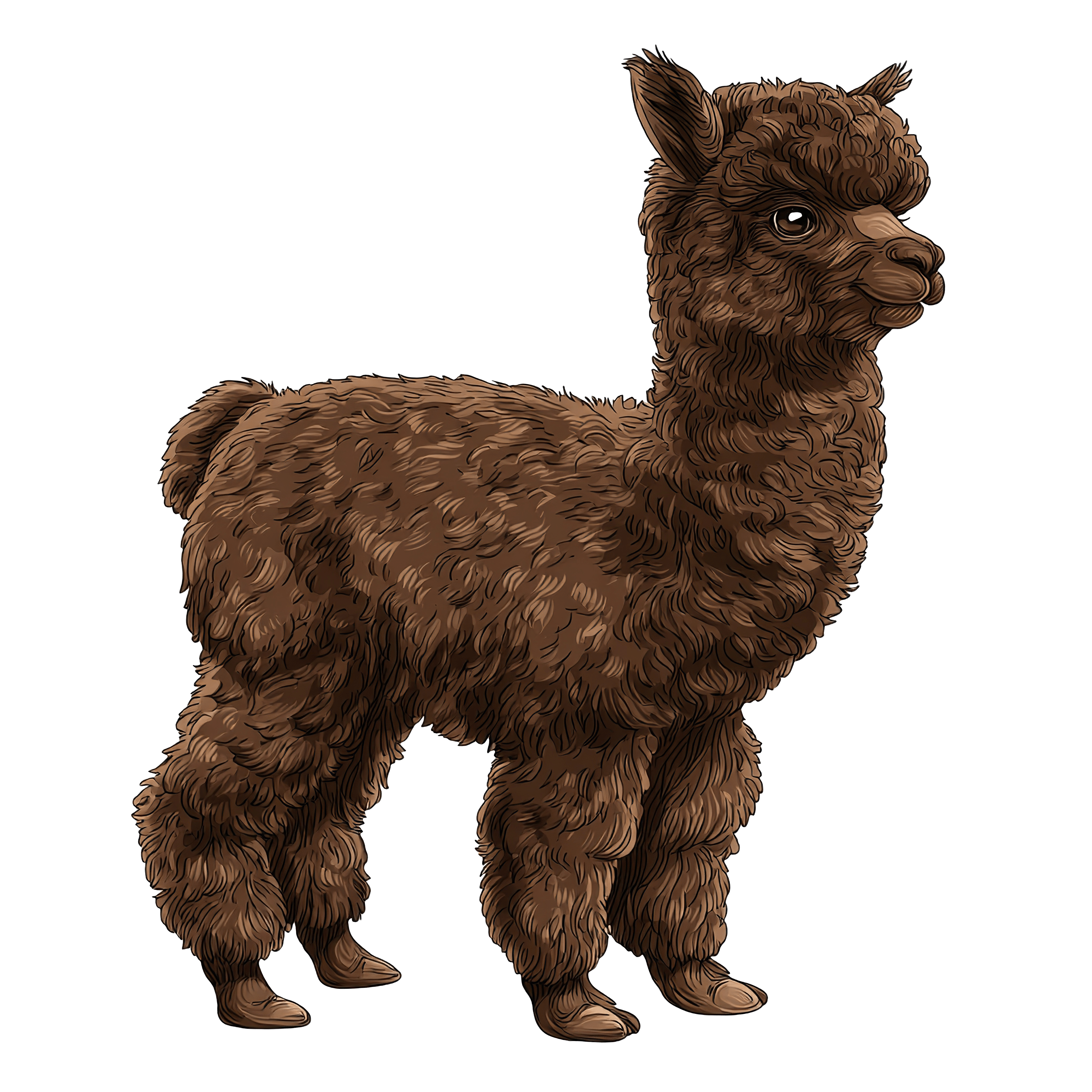 This charming clipart features a brown alpaca with textured, fluffy fur. Its detailed illustration highlights the animal’s expressive eyes and whimsical pose. Perfect for use in educational materials, farm-themed graphics, or crafting projects needing a touch of nature's charm.