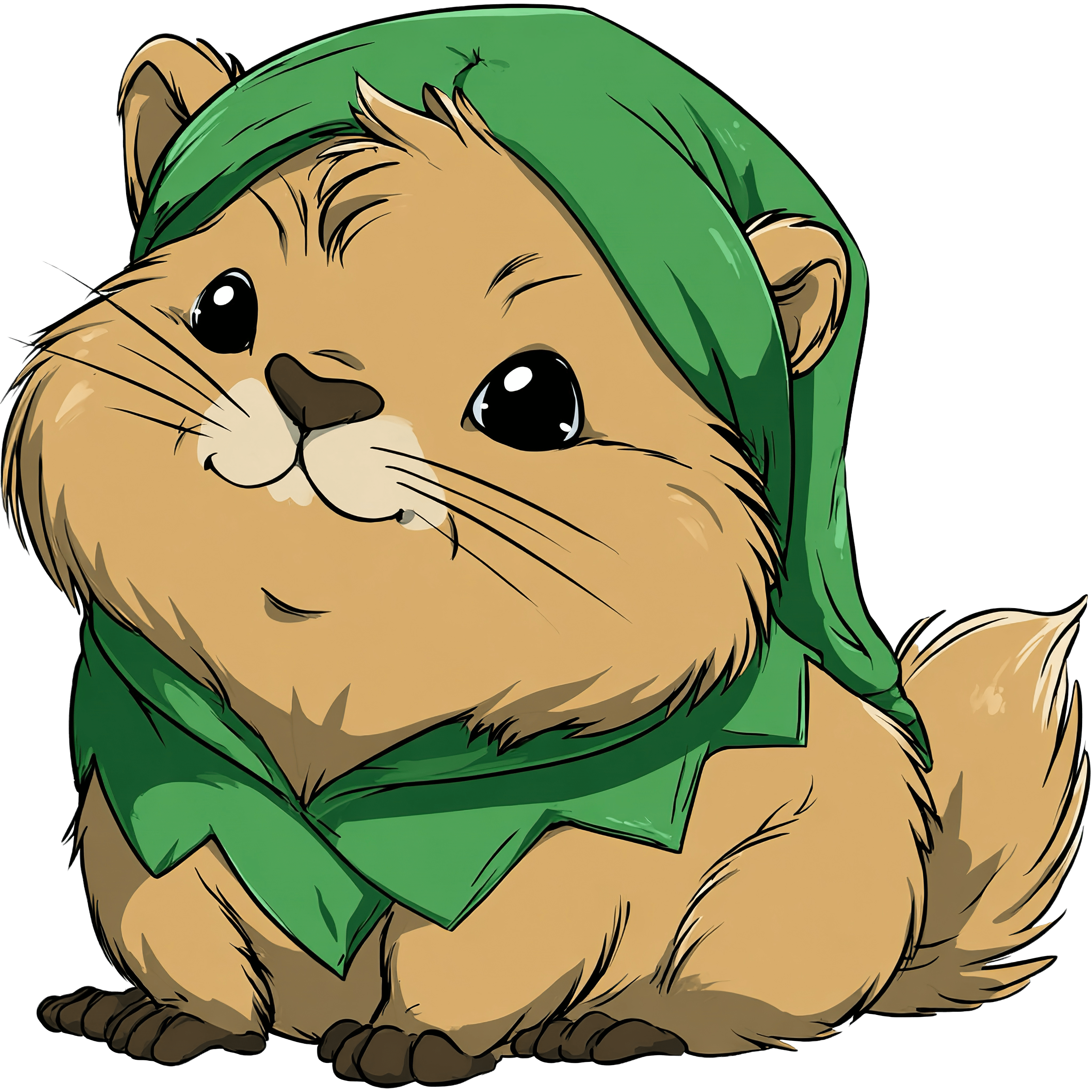 This charming illustration features a cute brown hamster with large, expressive eyes, wearing a green hooded scarf. The detailed fur and playful expression add a whimsical touch. Ideal for children's projects and animal-loving themes, this clipart captures a sense of warmth and friendliness.