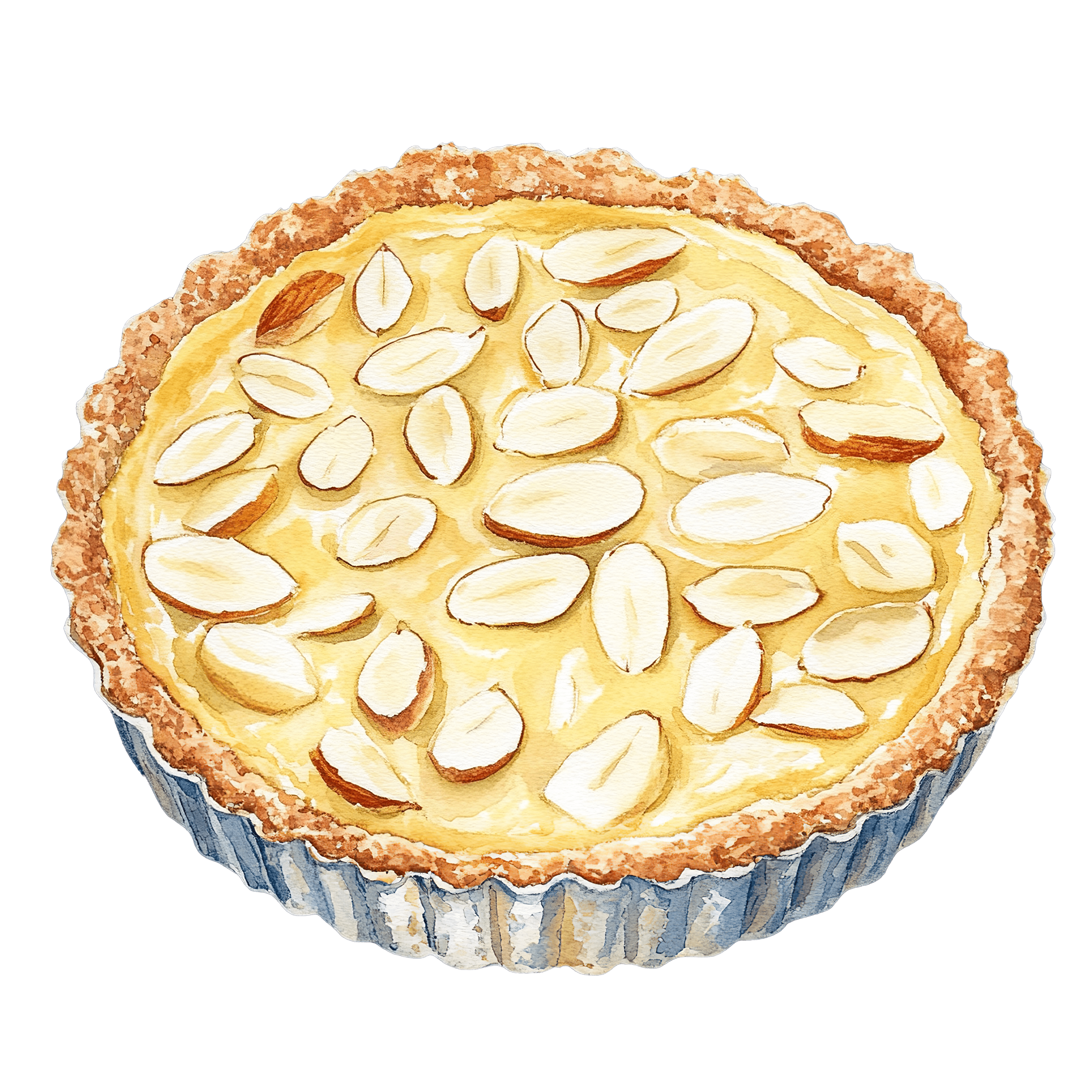 Almond Tart with Sliced Almonds in Metal Tin Almond tart topped with sliced almonds in a metal baking tin.Download PNG ▼Download JPG ▼Related posts:Sheep illustration with festive lightsWatercolor Oranges with Leaves and Sliced HalfVibrant Butterfly With Multicolored Wings Illustration SymmetricalFestive Lantern Surrounded by Red Flowers and Greenery ClipartFresh Bok Choy Bunch with Green Leaves and White StemsChocolate Glazed Eclair with Golden Pastry Base dessert food sweet bakery glazeChocolate Cake Slice with Rich Frosting and LayersWatercolor Illustration of Orange Poppy Flower with Green LeavesVibrant Green And Yellow Butterfly Showcasing Intricate WingChinchilla with Orange Bow Clipart IllustrationColorful Go-Kart Racer in Helmet Driving Animated VehicleRed Steam Locomotive Decorated With Christmas Wreaths and Lights