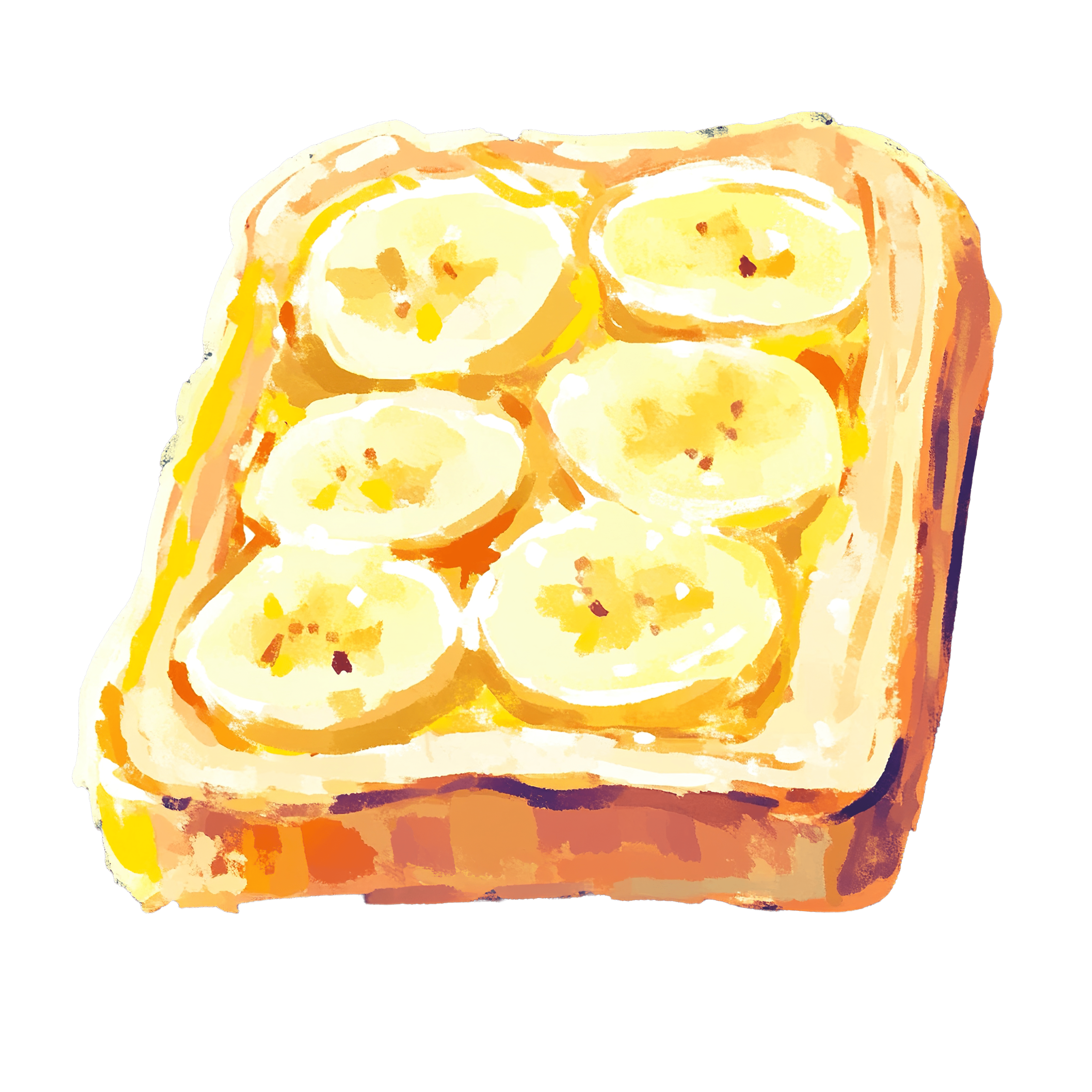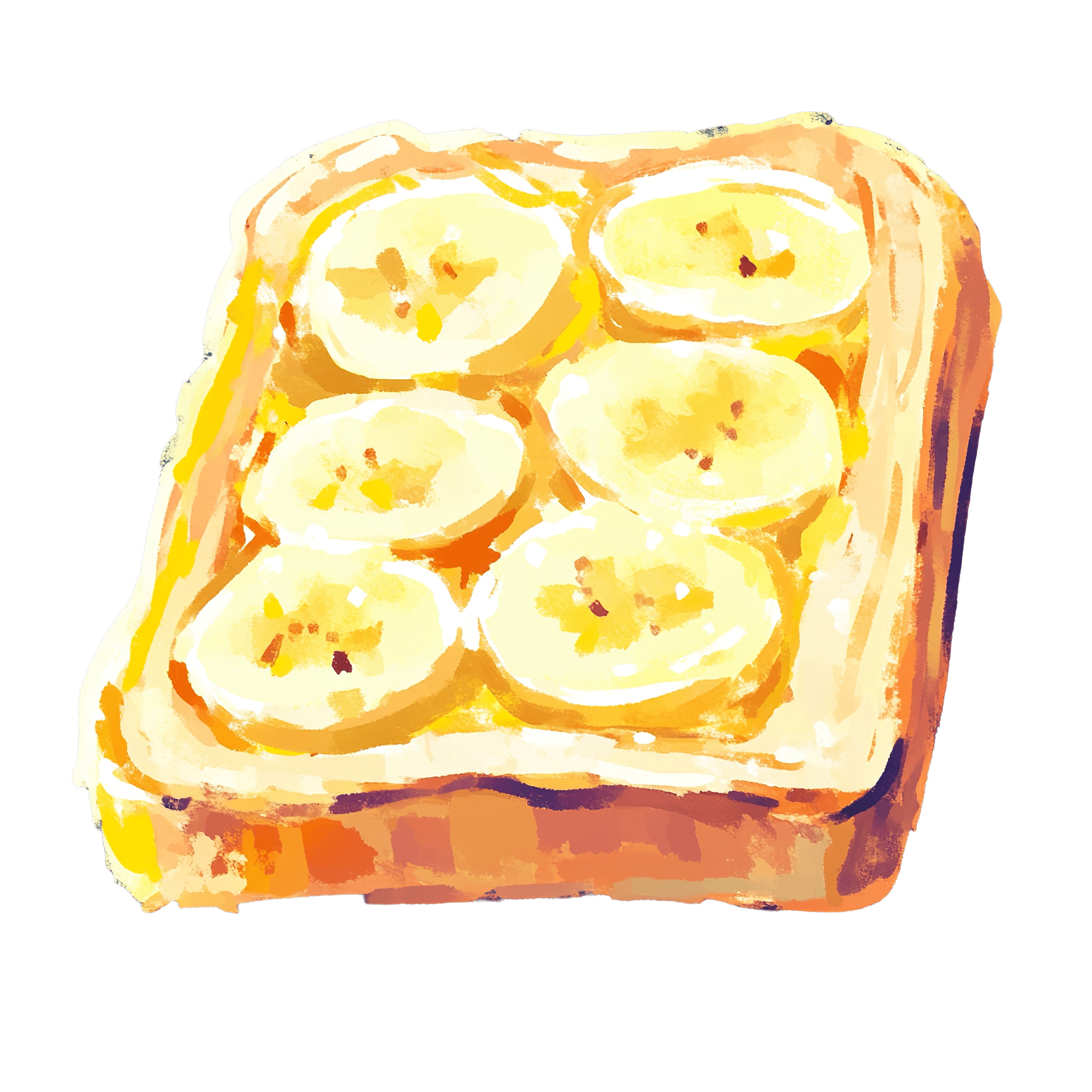 Banana Slices on Toasted Bread with Honey Drizzle Toasted bread topped with banana slices and honey drizzle.Download PNG ▼Download JPG ▼Related posts:Pastel Macaron Delight Vector Art ClipartCupcake with Cream Frosting and Cherry on TopColorful cartoon giraffe blowing bubbles clipartPurple Butterfly With Glowing Heart Patterns On WingsQuokka on Scooter Clipart IllustrationMojito Drink Featuring Lime and Mint LeavesWatercolor Collard Green Leaf with Detailed Veins vegetable clipart food plant botanicalDetailed Butterfly Illustration With Vibrant Yellow And BlackFamily Portrait Illustration with Winter Clothing and Bright HatsFestive Candles with Pinecones and Evergreen Branches ArrangementGlass of Chocolate Milk in Transparent Tumbler drink beverage brown clipart vectorStack of Vintage Books Wrapped with Festive Red Ribbon