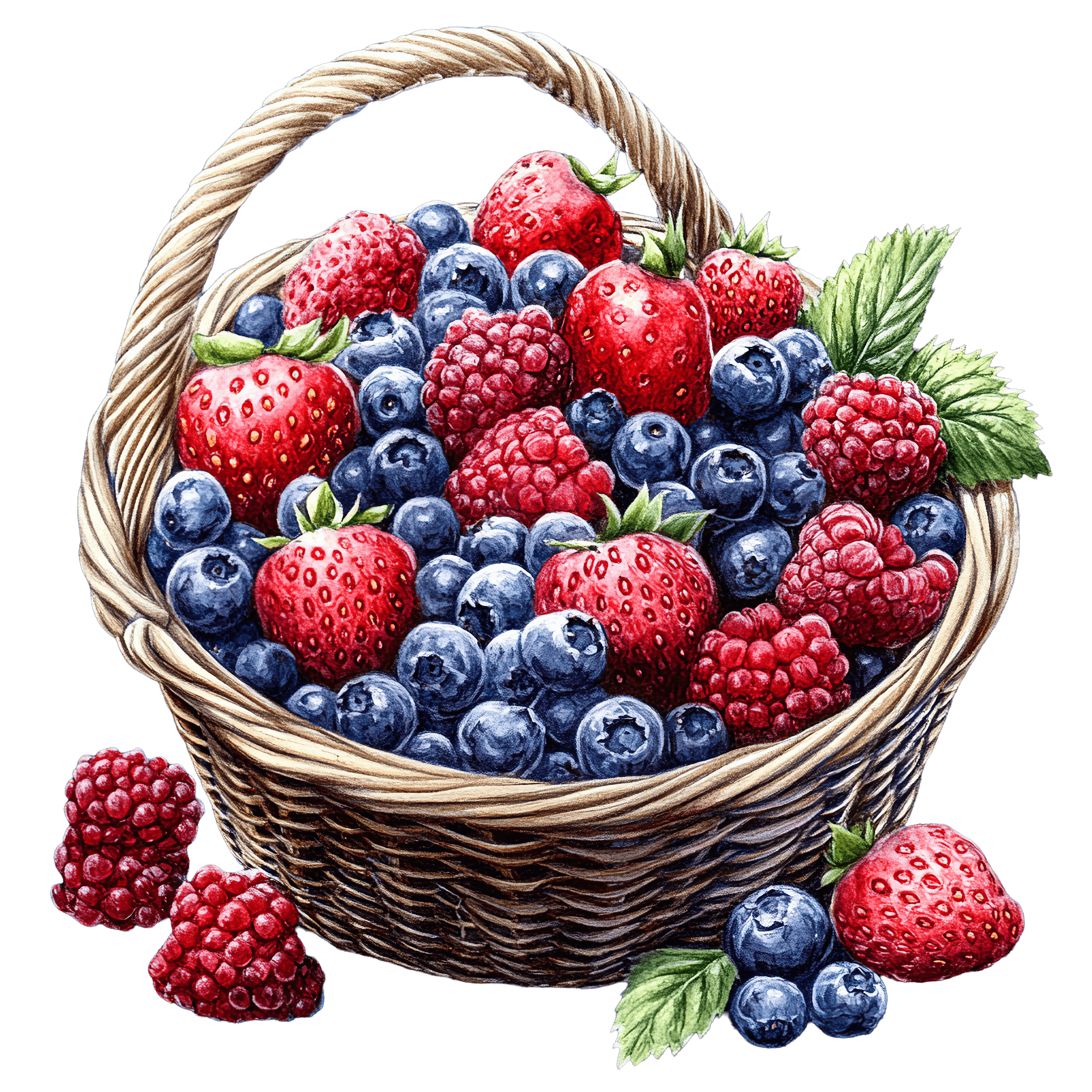 Basket Filled with Fresh Strawberries, Raspberries, and Blueberries Basket overflowing with strawberries, raspberries, and blueberries on display.Download PNG ▼Download JPG ▼Related posts:Glass of Iced Cherry Cola with Fresh CherriesVibrant Blue And Orange Butterfly Showcasing Intricate WingGlass Pitcher Filled with Refreshing Red Fruit PunchGreen Octopus Tentacle Clipart with Detailed TextureVintage Red Lantern with Candle and Christmas Holly DecorationsColorful Butterfly With Brightly Patterned Wings In FlightStack of Colorful Books with Teacup on Top IllustrationVibrant Red and White Poinsettia with Green Leaves and BerriesRipe Red Raspberries with Green Leaves on BranchVibrant Butterfly With Multicolored Wings IllustrationSpiral Cinnamon Pastry with Sugar DustingWatercolor Passion Fruit with Leaves and Halved View