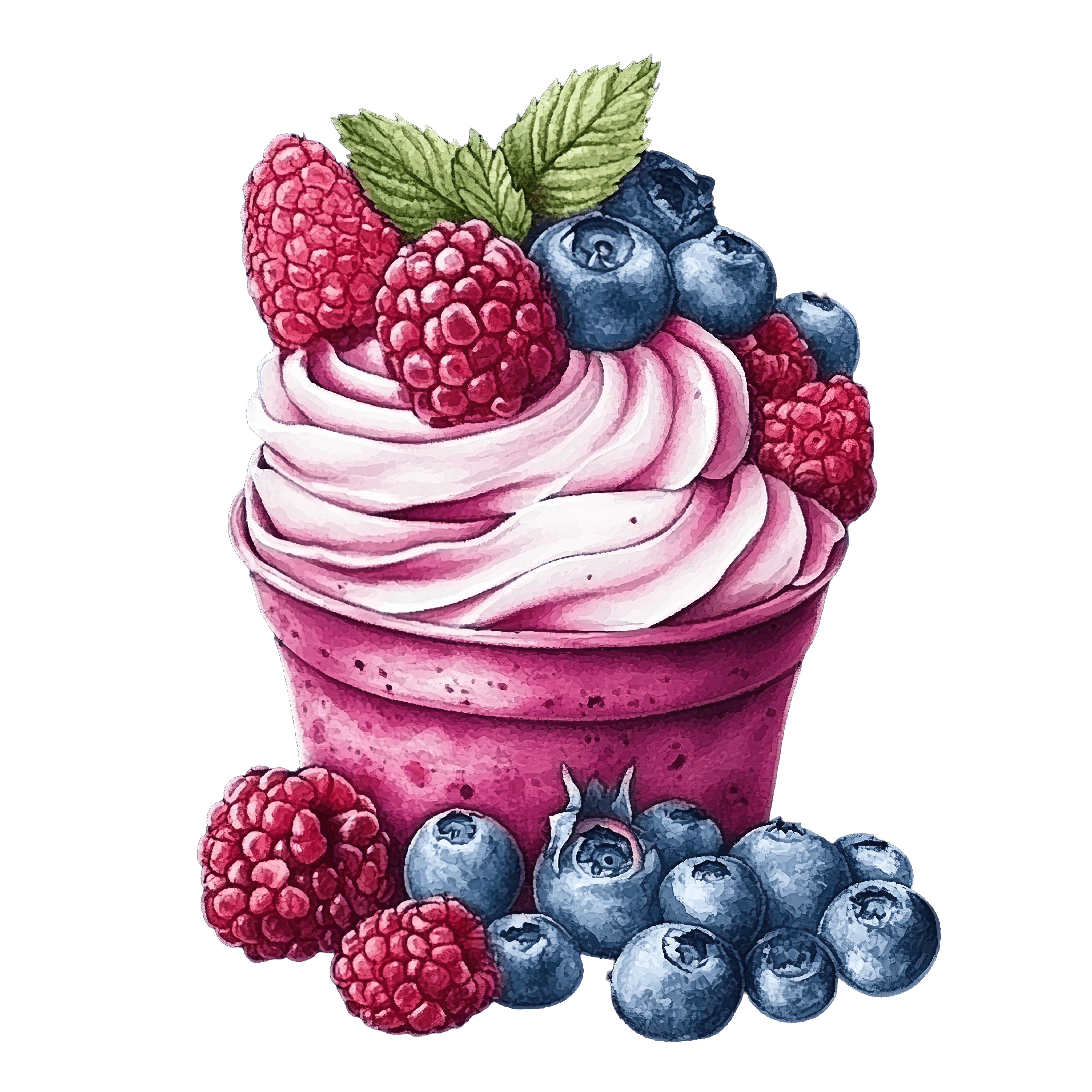 Berry Topped Frozen Yogurt Cup with Raspberries and Blueberries Frozen yogurt cup adorned with fresh raspberries and blueberries.Download PNG ▼Download JPG ▼Related posts:Detailed Watercolor Illustration of a Purple Orchid FlowerBright Sun with Radiating Rays Behind Fluffy Clouds IllustrationThree Clusters of White Currants with Green LeavesFestive Gingerbread House with Snow and Holiday DecorationsWatercolor Broccoli Stalks with Detailed Green Florets vegetable clipart food vector artOtter holding colorful balls clipart illustrationVibrant Butterfly With Pink And Orange WingsFresh Green Celery Stalks and Leaves Vector ArtWoman in Historical Red Outfit with Festive AccessoriesThree whole durians with one cut open showing fleshColorful Geometric Patterned Bell Pendant on Black BackgroundGolden Brown Croissant with Flaky Layers pastry bread food breakfast bakery clipart