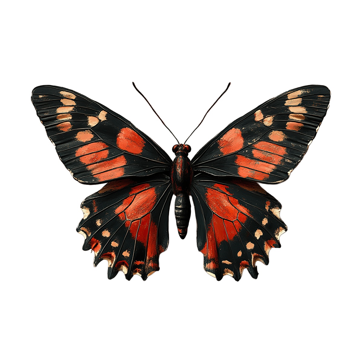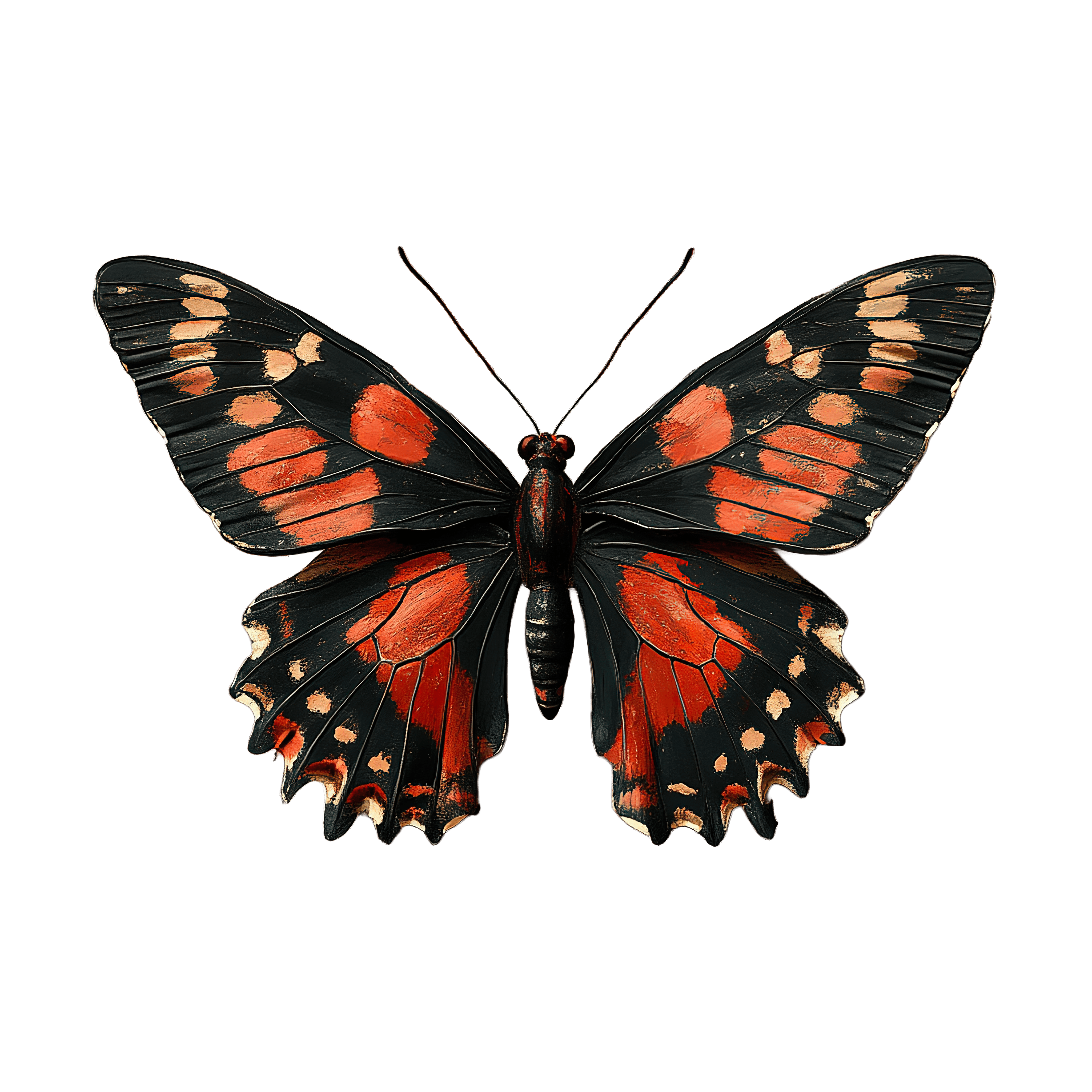 Black And Red Butterfly With Detailed Wing Patterns Black butterfly features striking red and orange wing patterns.Download PNG ▼Download JPG ▼Related posts:Pink Ice Cream Cone with Cherry on TopWatercolor oranges with leaves and a sliced sectionGlittery Golden Butterfly With Sparkling WingsDetailed Yellow Daffodil Flower with Orange Center ClipartWoman with Glasses and Hair Bun Clipart DesignElephant in pumpkin-themed outfit illustrationFestive Portrait of Girl with Poinsettia Holiday Floral CrownWoman with Festive Red Bow and Christmas DecorationsCaramel Drizzled Cheesecake with Whipped Cream and HazelnutsYoung girl in blue leotard performing a gymnastics poseVictorian Woman Wearing Elegant Red Hat with Lace DressElf in Green Attire Holding a Gift Box