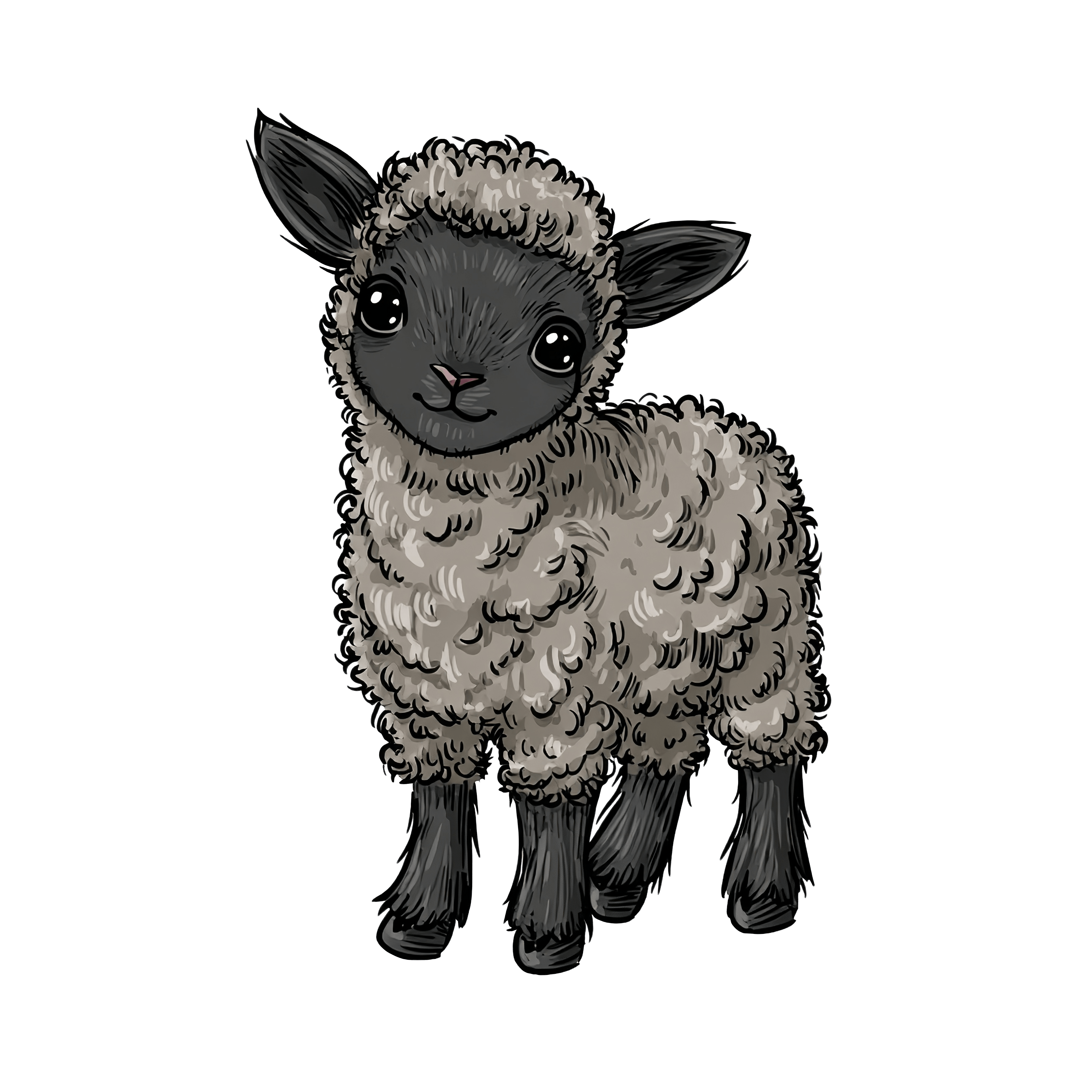 Clipart image of a fluffy lamb with a black face and legs. The lamb’s wool is textured and white with gray shading. Its ears are upright, and its tail is barely visible. The illustration is stylized and lacks a background.