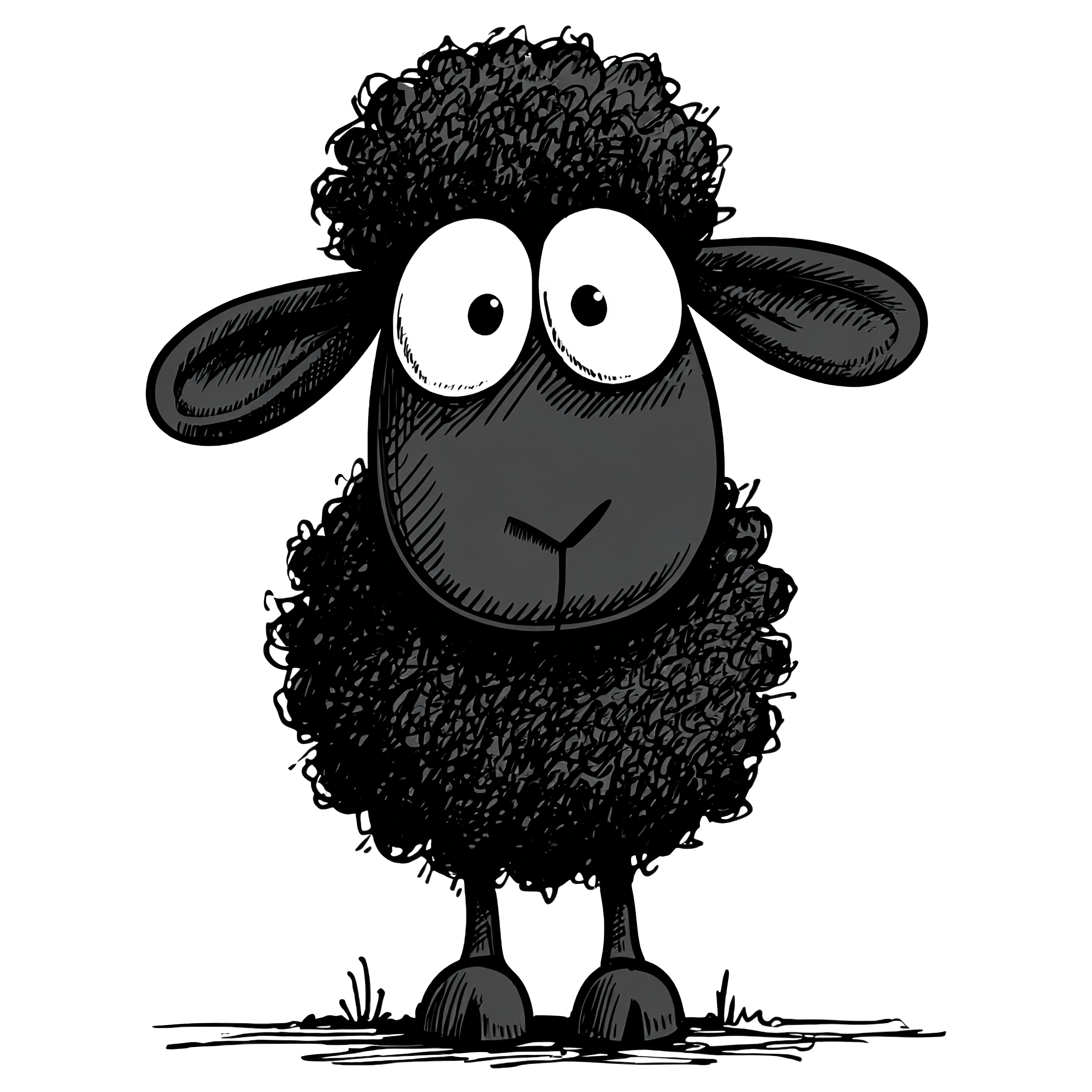 Black sheep standing with curly wool and large eyes. Stylized features include exaggerated facial expressions and detailed fur texture, emphasizing contrast with lighter facial tones. Ears appear symmetrical and curve outward. Legs and hooves are simplified with minimal detailing, enhancing the overall cartoon style. The design uses a monochrome palette to highlight the sheep's woolly texture, fitting for themed projects or educational materials.