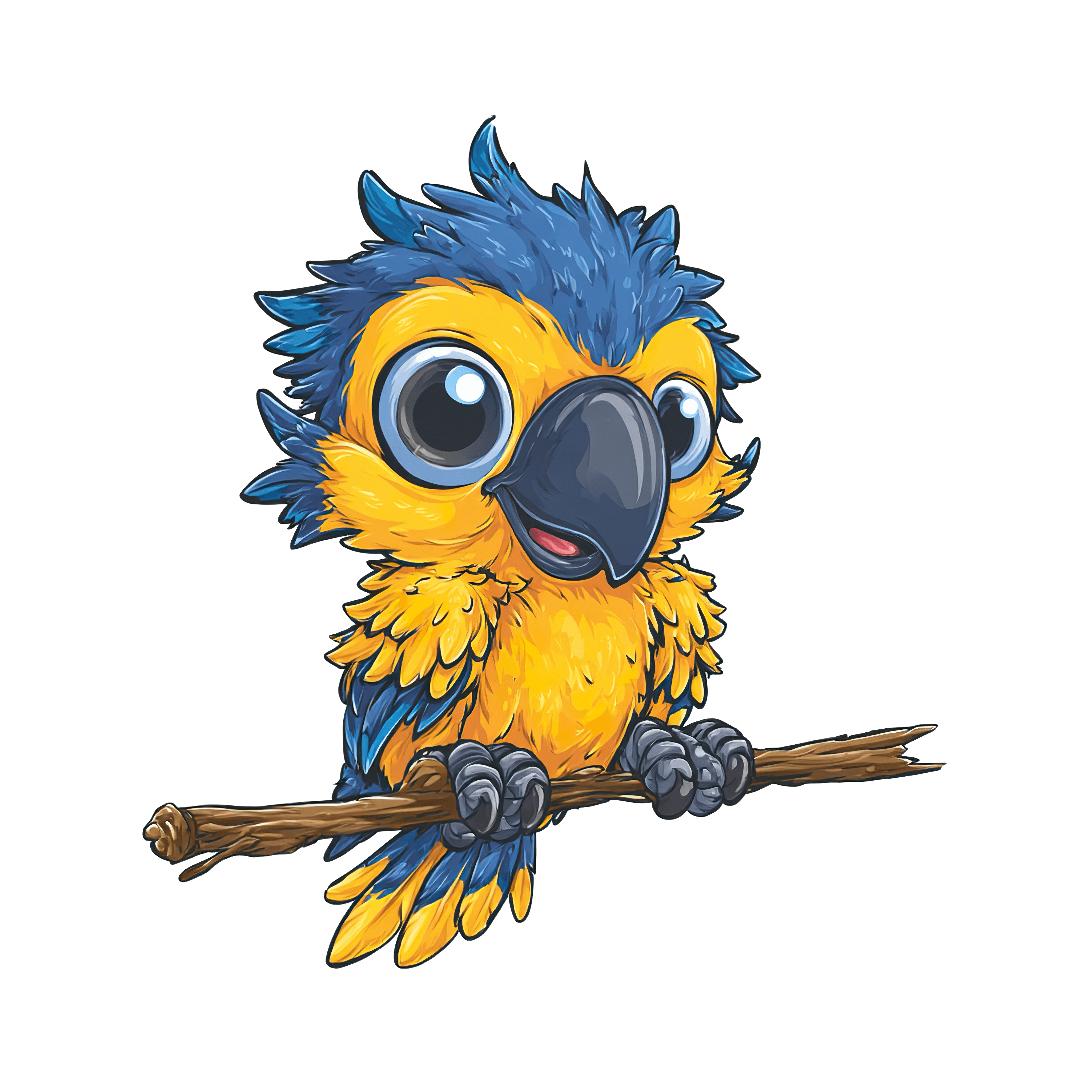Blue and yellow parrot illustration with large eyes and detailed feathers. The parrot is perched on a wooden branch, featuring vibrant blue plumage on its head and wings, with contrasting yellow feathers on its chest. The large beak is prominently displayed, adding to the artistic depiction of the bird. This clipart combines detailed color contrasts and stylized character design, suitable for various digital projects.