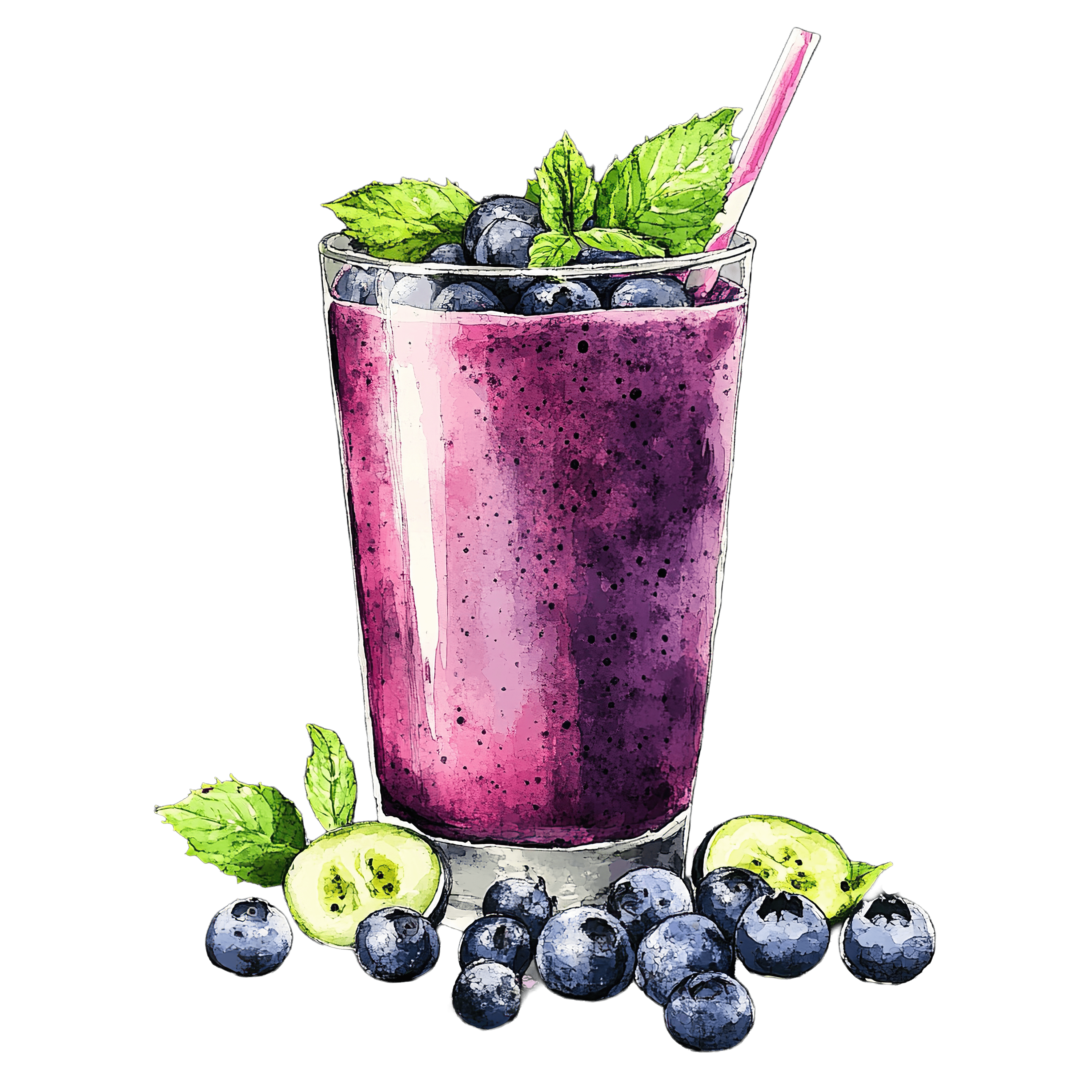 Blueberry Smoothie in Glass with Fresh Mint Garnish Blueberry smoothie in a glass with mint leaves and straw.Download PNG ▼Download JPG ▼Related posts:Sun Face with Radiating Leaves on Blue Tile ArtworkFresh green bok choy vegetable with detailed leafy textureTwo Plaid Wrapped Gift Boxes with Large RibbonsTall Glass of Orange Juice with Straw drink beverage watercolor clipart vectorChocolate Brownie with Swirled Caramel Frosting Clipart dessert sweet food vector artCartoon goldfish with bubbles in black backgroundDetailed Butterfly Illustration With Vibrant Multicolored WingsWatercolor striped pumpkin with green and yellow huesFestive Owl Surrounded by a Christmas Wreath with BerriesSanta Claus Holding Wrapped Christmas Presents in Snowy SceneStrawberry Delight Cupcake in Pink Frosting ClipartOrange snail clipart with spiral shell