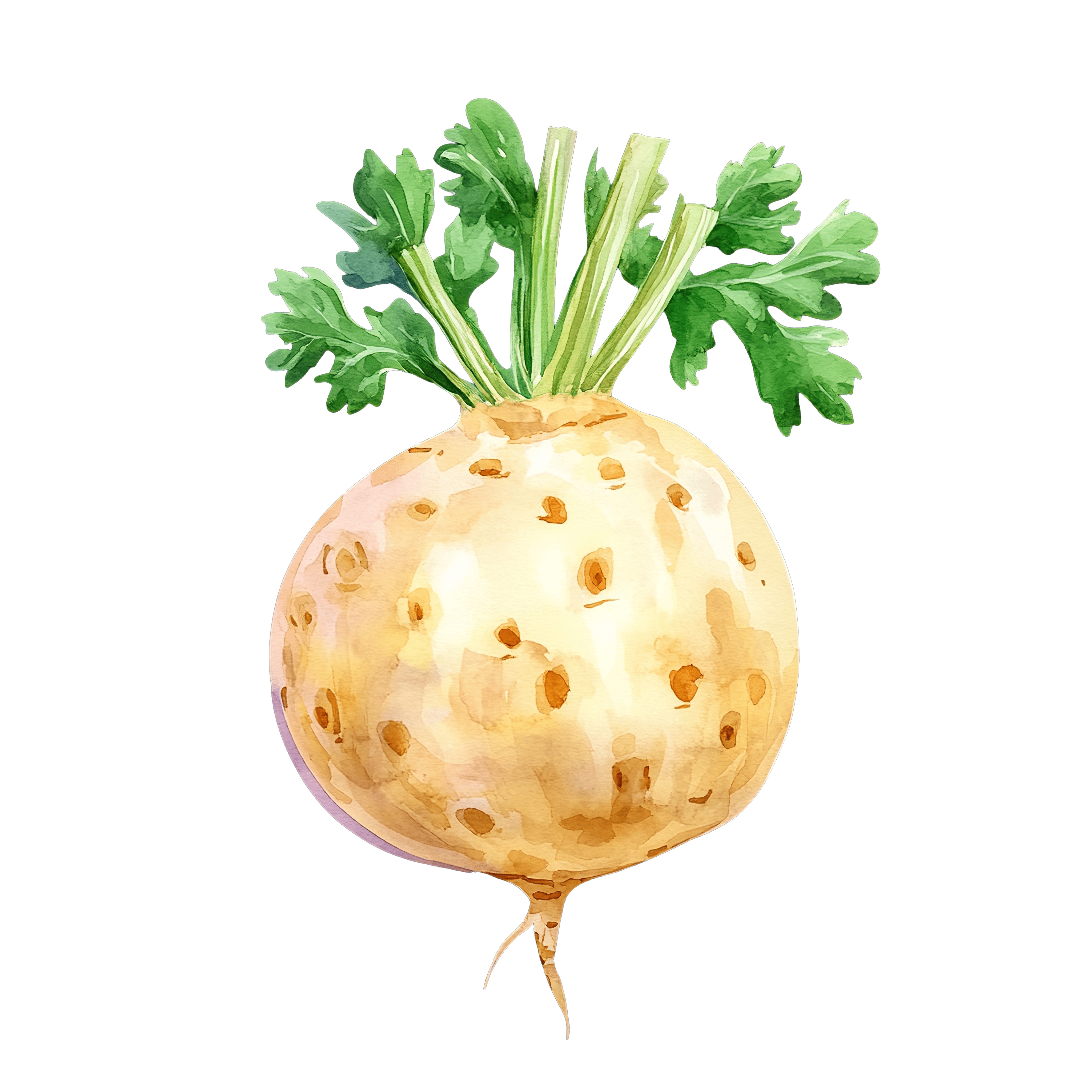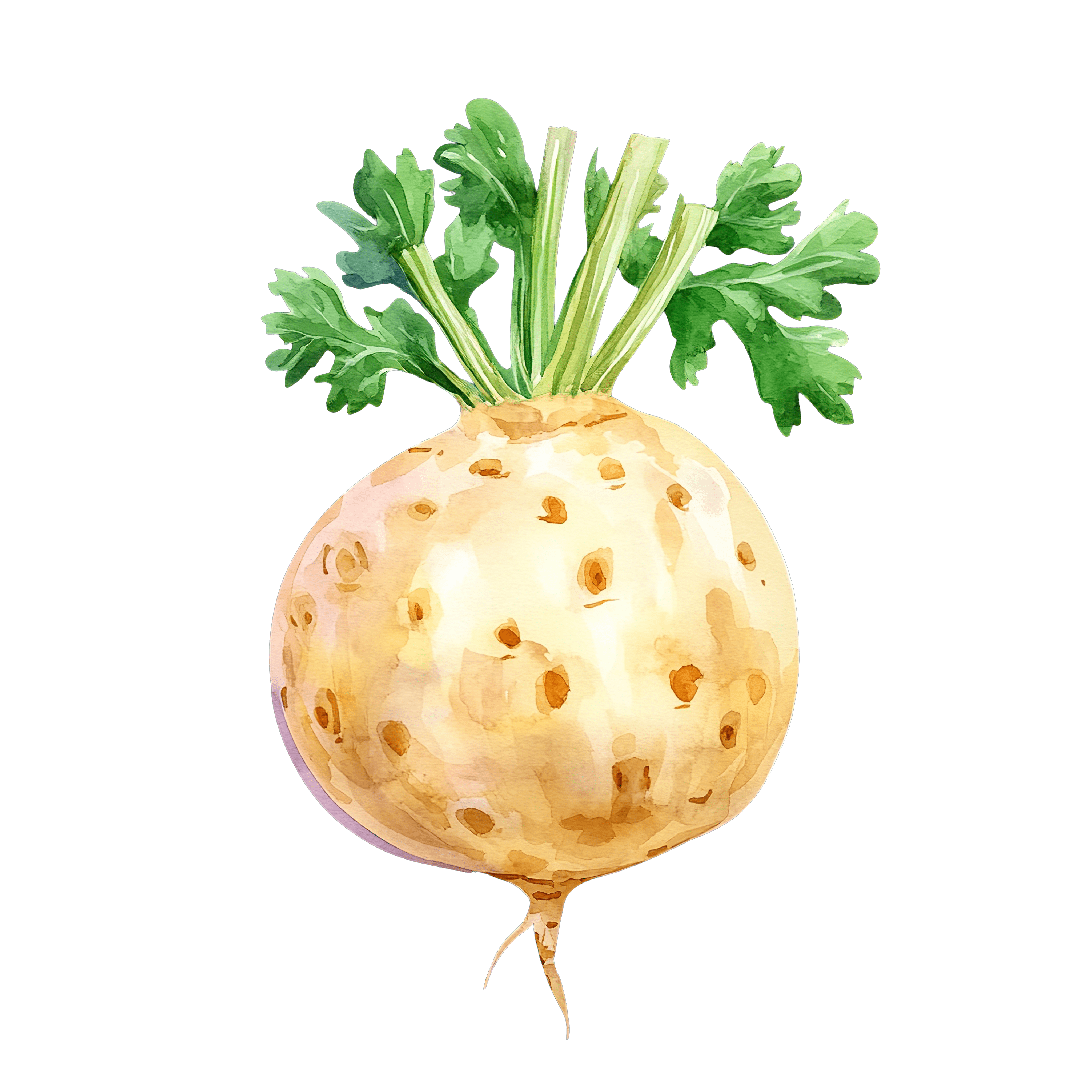 Botanical Art of Celeriac Root and Leaves Celeriac root depicted in watercolor style with vibrant green leaves.Download PNG ▼Download JPG ▼Related posts:Watercolor Cocoa Pods with Green Leaves vibrant clipart vector art printable foodToucan on a Wooden Swing ClipartKoala Wearing a Festive Elf Outfit ClipartVibrant Cranberry Harvest with Leaf DetailVibrant Butterfly With Striking Blue And Pink WingsTall Glass of Green Smoothie with Mint GarnishHazelnut Tart with Chocolate Filling and Crust pastry dessert food clipart vectorThree Vibrant Red Maple Leaves on a Black BackgroundVibrant Butterfly With Pink And Orange Wings FlutteringChocolate Brownie with Swirled Caramel Frosting Clipart dessert sweet food vector artFestive Christmas Floral Design with Green Leaves and Red AccentsBright Sun Illustration with Fiery Orange and Yellow Rays
