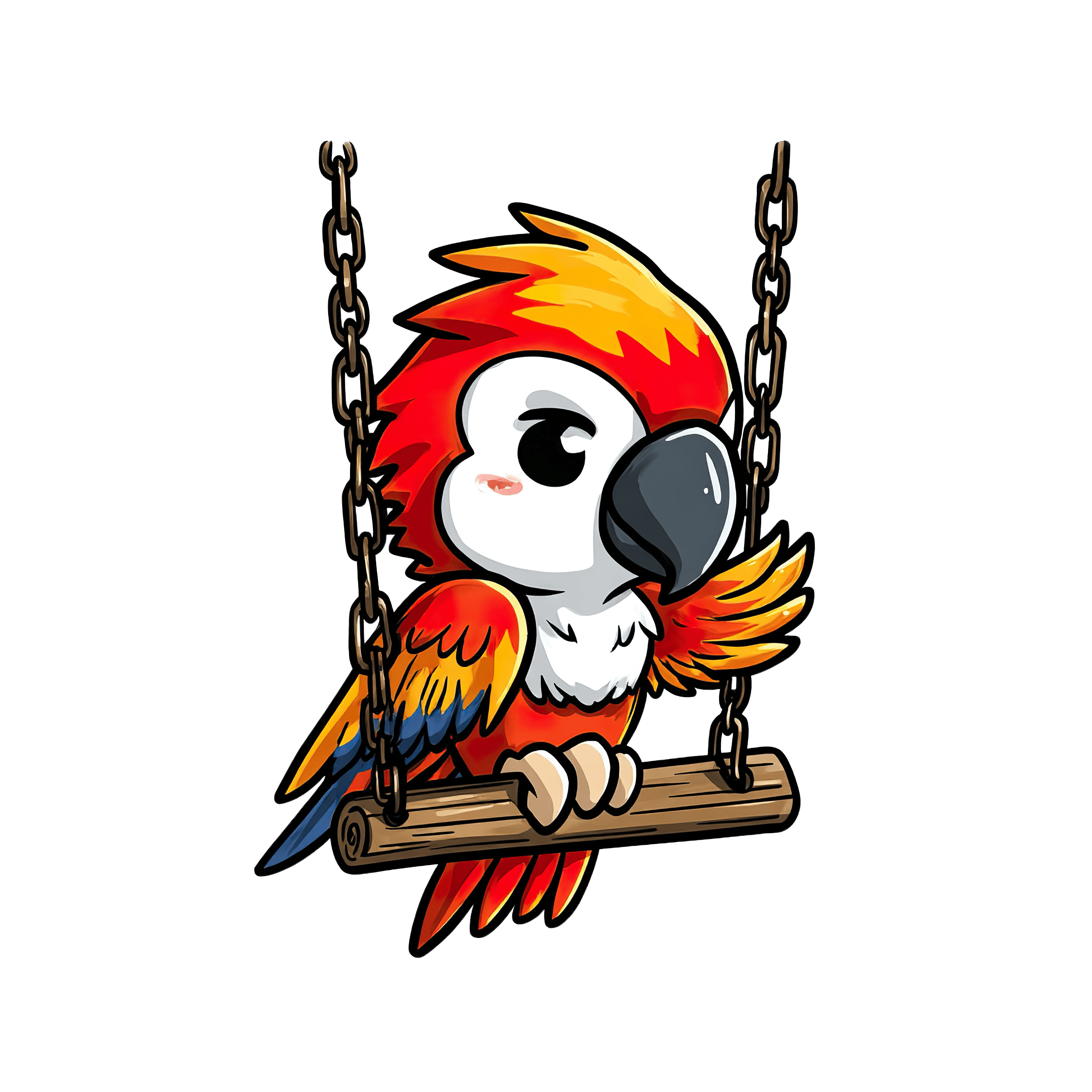 Brightly colored parrot with orange and yellow feathers perched on a wooden swing. The parrot's beak is prominently black, and its wings are detailed with vivid hues. Chains on either side of the swing frame the bird symmetrically, creating a balanced composition in the illustration style.
