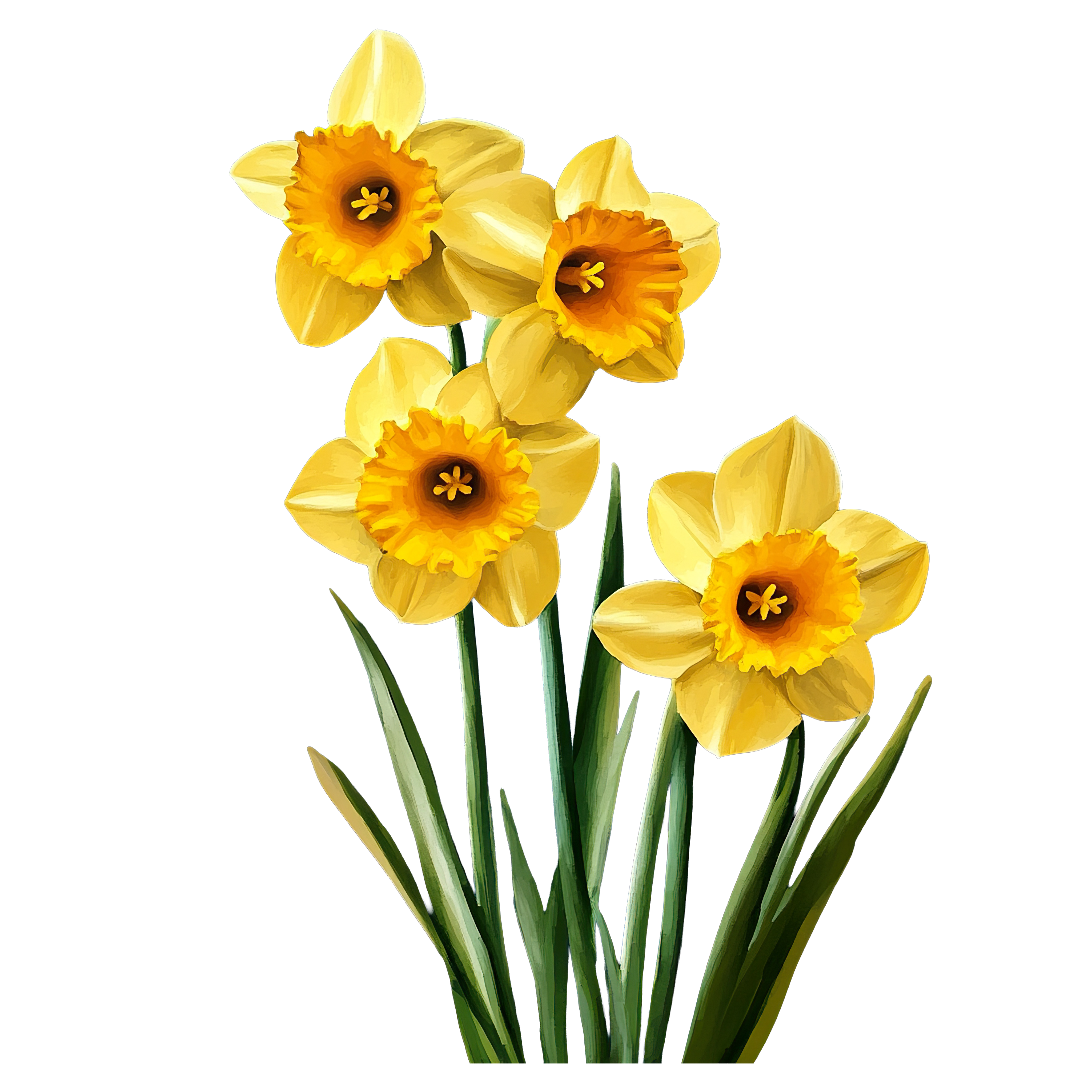 Bright Yellow Daffodil Flowers with Green Stems Illustration Yellow daffodil flowers with vibrant petals depicted in a clipart style.Download PNG ▼Download JPG ▼Related posts:Cluster of Pink Yucca FlowersPowdered Sugar-Dusted Raisin Bread Slices on Black BackgroundWatercolor Pear and Leaves Clipart Green Fruit Vector ArtYellow And Black Butterfly With Outstretched Wings DisplayChocolate Glazed Eclair with Golden Pastry Base dessert food sweet bakery glazeBlue Broccoli Clipart with Watercolor Style and TextureBlack Forest Cake Slice with Cherries and CreamSitting tiger clipart with orange and black stripesWatercolor Gingerbread Cookie with Icing and Bow TieYoung Child Surrounded by Festive Holly and PoinsettiaGlass Bowl Filled with Mixed Berries and CreamSliced Potatoes with Vibrant Orange Flesh sweet vegetable food clipart vector art