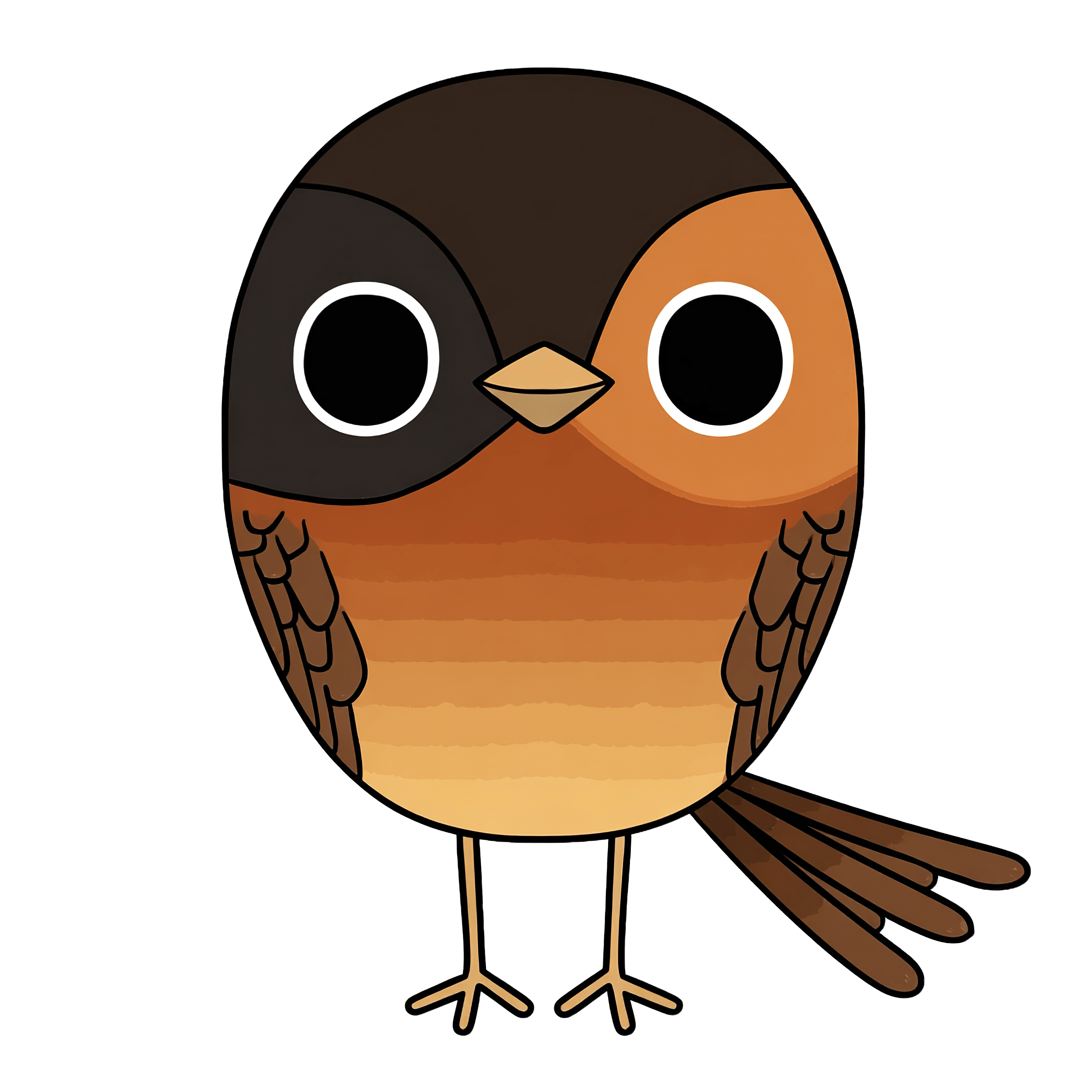 Circular bird illustration with distinct black and orange markings and large round eyes. The body features gradient shades from dark brown to orange, complemented by patterned wings and a layered tail. Legs are thin and simplistic, enhancing the design's minimal style.