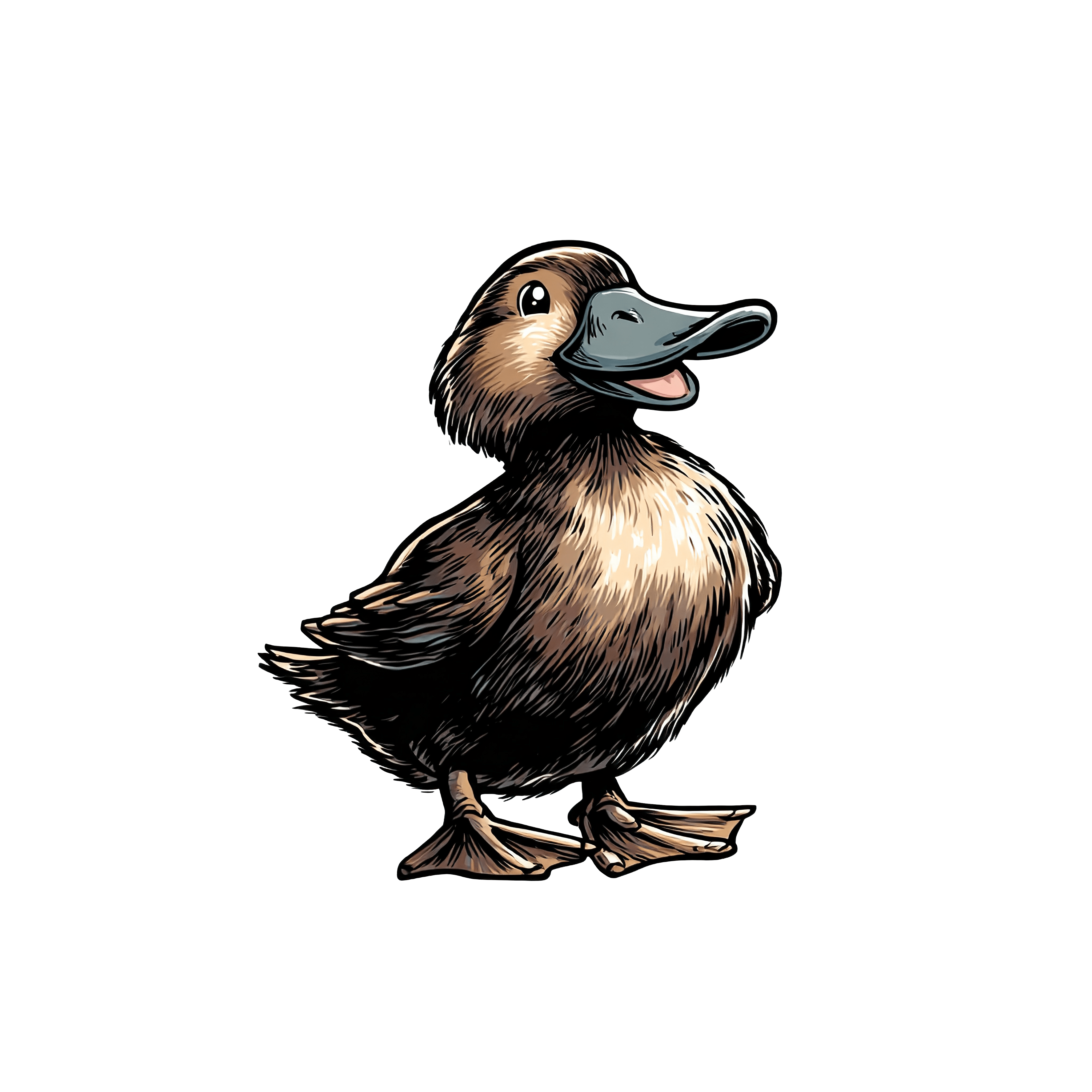Brown duck illustration with prominent feather details and a light brown body. Its blue beak stands out against the rich feather texture, showcasing a detailed, polished style. The duck's webbed feet and rounded body convey a realistic, simple design. Ideal for educational or decorative purposes, this vector art offers an engaging depiction of a common waterbird species.