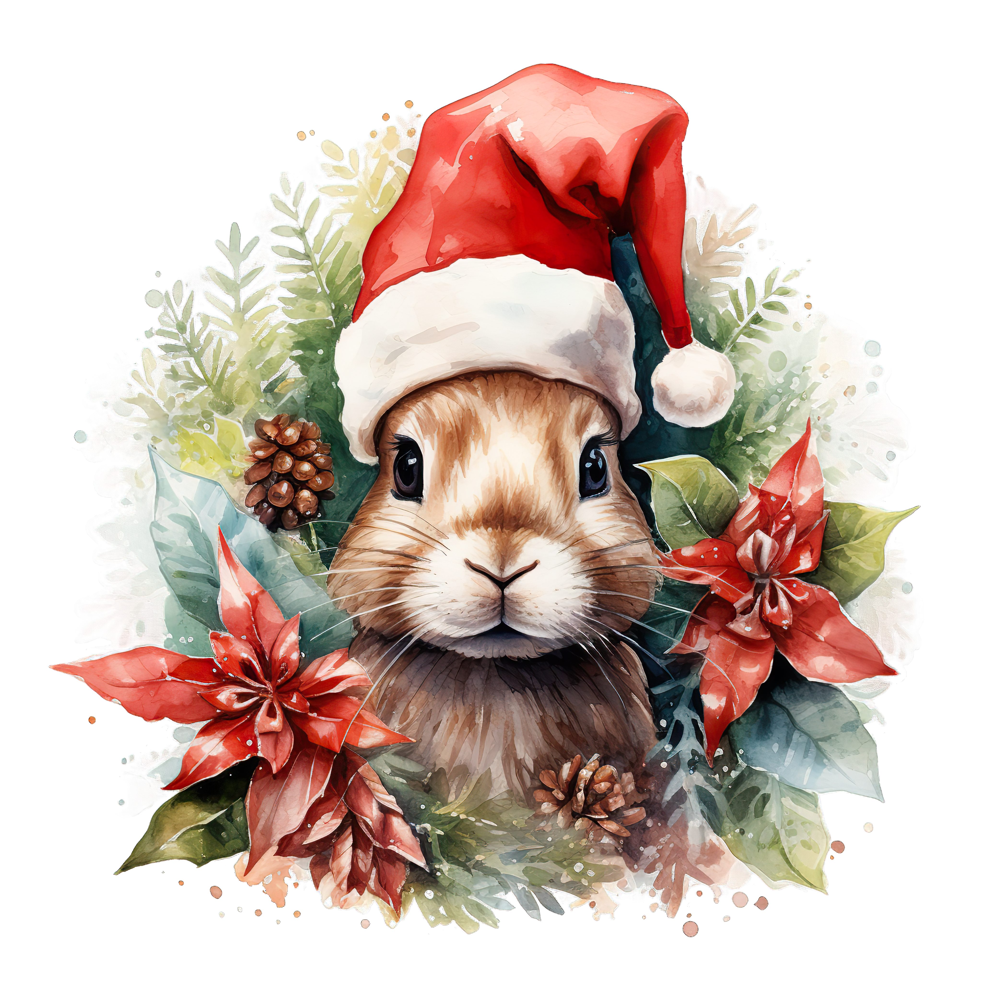 Bunny with Santa Hat Surrounded by Festive Greenery and Flowers Rabbit wearing a Santa hat amid festive foliage and red flowers.Download PNG ▼Download JPG ▼Related posts:Stack of Four Slices of Brown Bread ClipartYellow monkey holding a bananaStack of Colorful Books with a Red Apple on TopWatercolor Broccoli Clipart with Detailed Green Florets vegetable food art digital printableChocolate Chip Cookie with Rich Brown Chips dessert baked snack sweet foodChocolate Cake with Strawberries on a White PlateOrange Slice with Leaf in Vibrant Clipart StyleRed Christmas Cracker Illustration with Ribbon and Gold AccentsRed And Black Butterfly With Detailed Clipart Png X56Blue High Heels Decorated with Holly and Red BerriesColorful cartoon giraffe blowing bubbles clipartGlass Dessert Bowl with Berries and Cream Layers