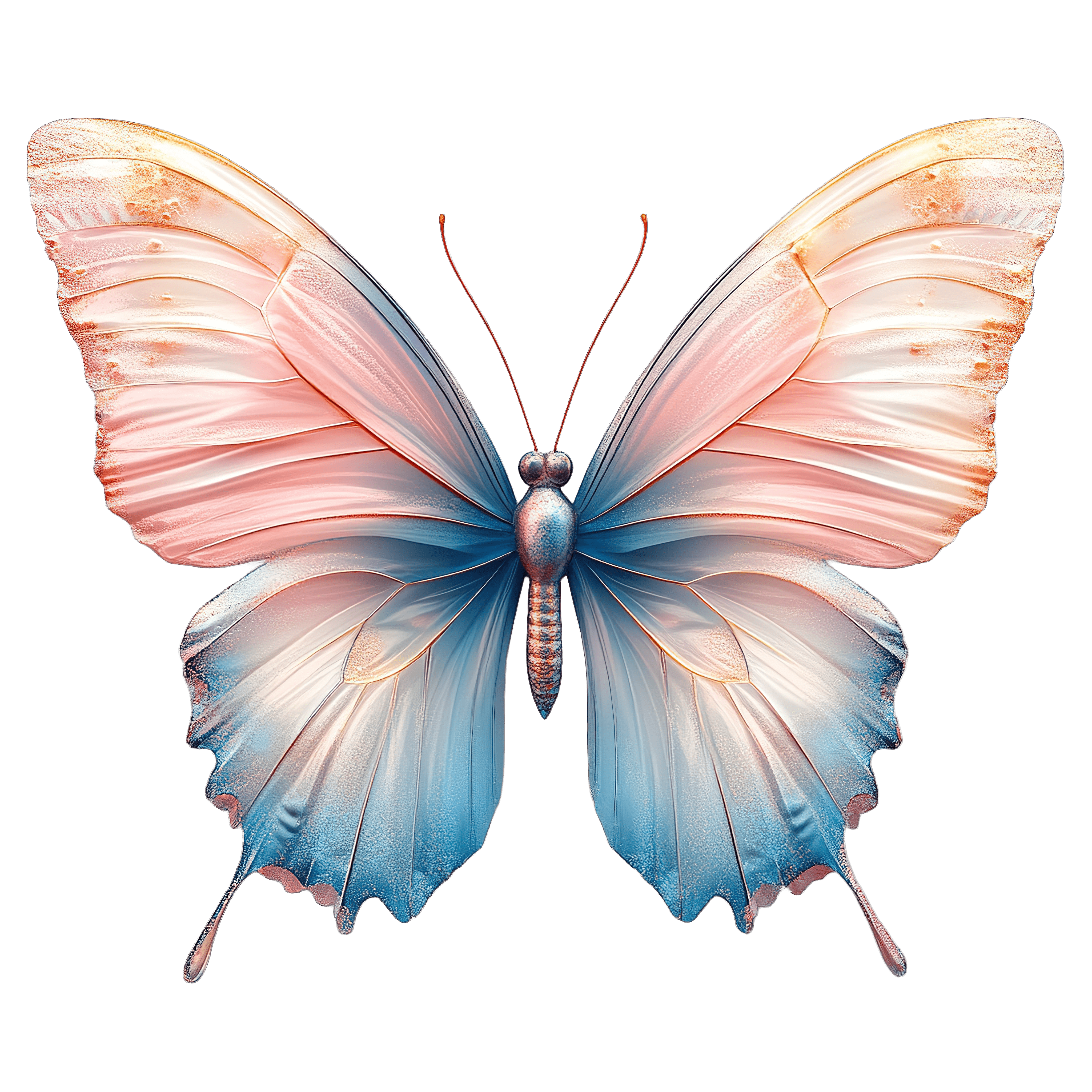 Butterfly With Gradient Pink And Blue Wings Illustration Butterfly features gradient pink and blue wings with detailed patterns.Download PNG ▼Download JPG ▼Related posts:Colorful Snapdragons Watercolor Illustration on Black BackgroundCute Blue Jay Clipart Wearing a Cozy Winter HatPink Dogwood Flowers with Lush Green Leaves on BranchElegant Red Floral Bouquet with Roses and Lilies ClipartChild Portrait with Red Poinsettia Flowers in Watercolor StyleWatercolor Cloud with Hanging Heart Shapes on Black BackgroundVibrant Butterfly With Red And Black Patterned WingsVibrant Orange and Yellow Sun with Radiating FlamesGlass of Apple Juice with Whole and Sliced ApplesColorful Orange And Blue Winged Butterfly IllustrationTwo Fresh Fennel Bulbs with Green Stalks and LeavesWatercolor Pear with Green Leaves on Stem fruit clipart vector art food