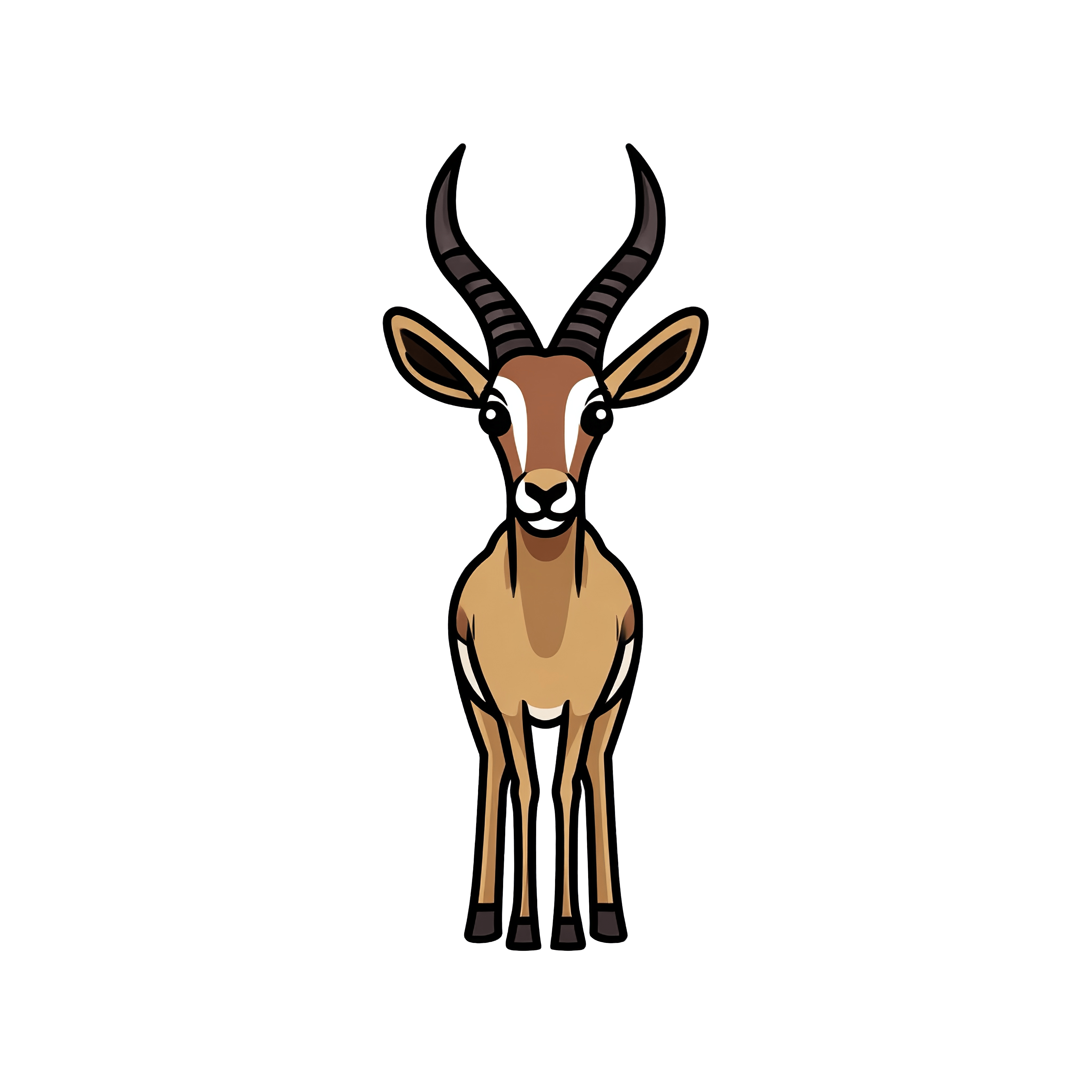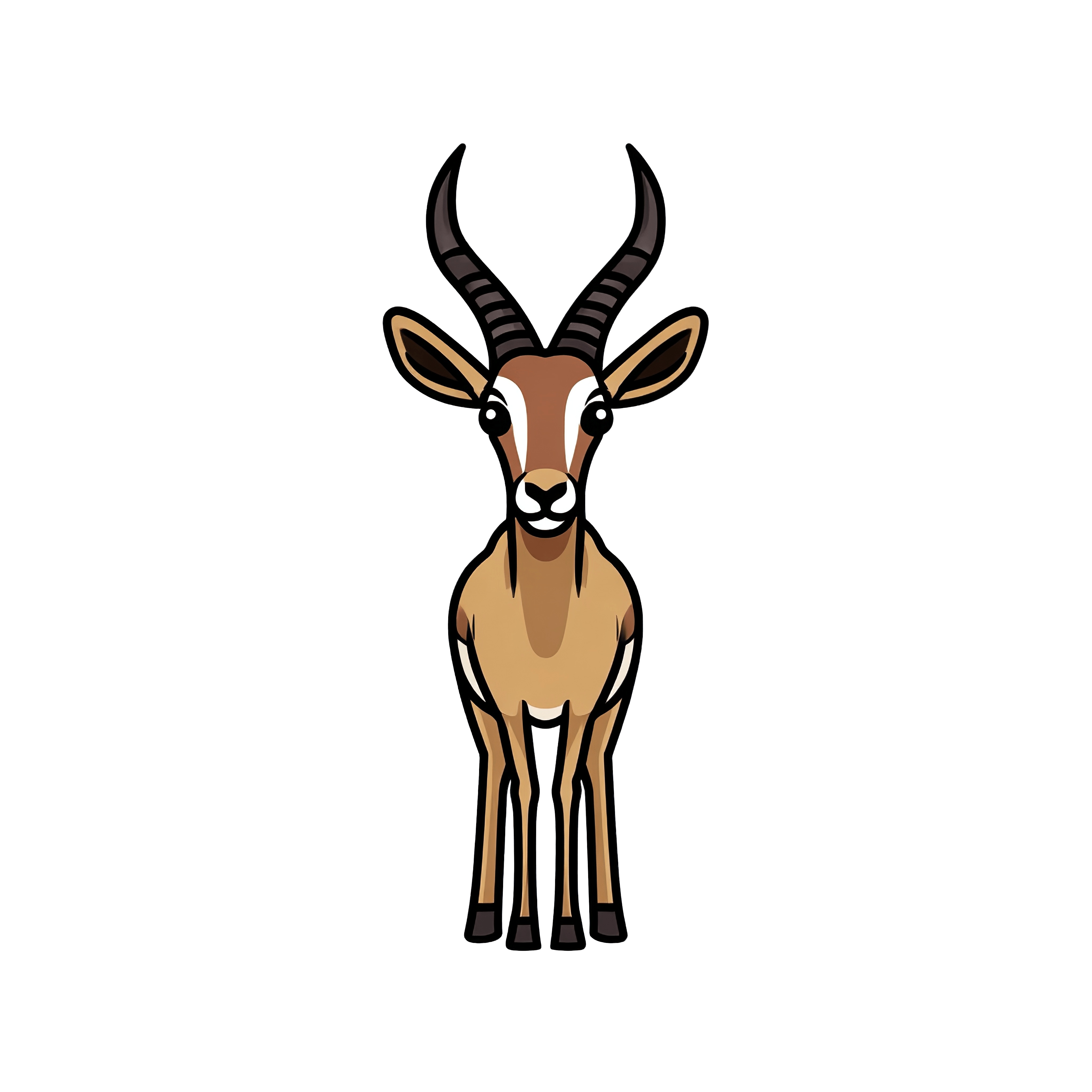This clipart image features a cartoon-style antelope with distinctive black horns and a tawny-colored body. The symmetrical design uses bold lines and simple shading, creating a playful yet elegant look. The antelope faces forward against a transparent background, ideal for diverse uses.