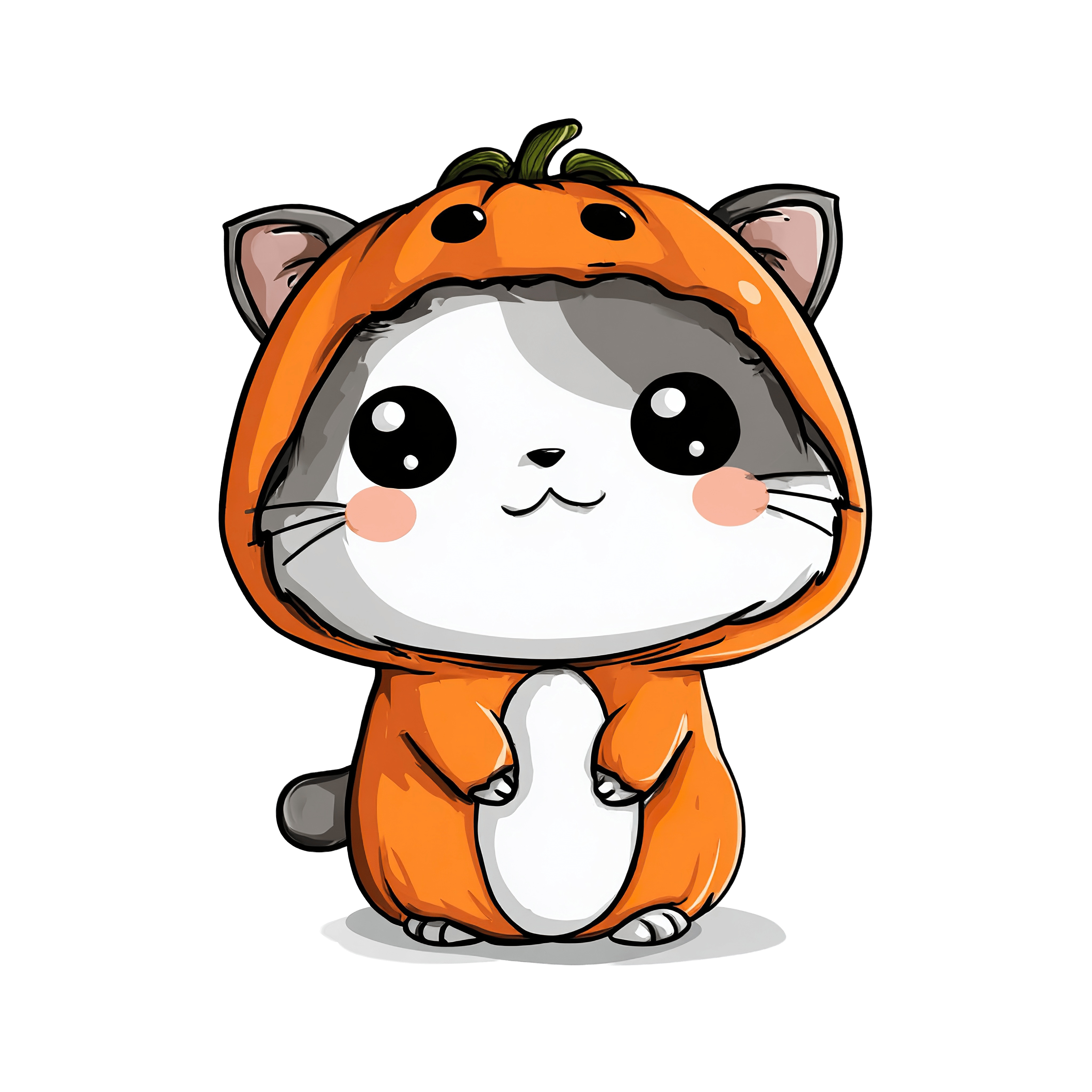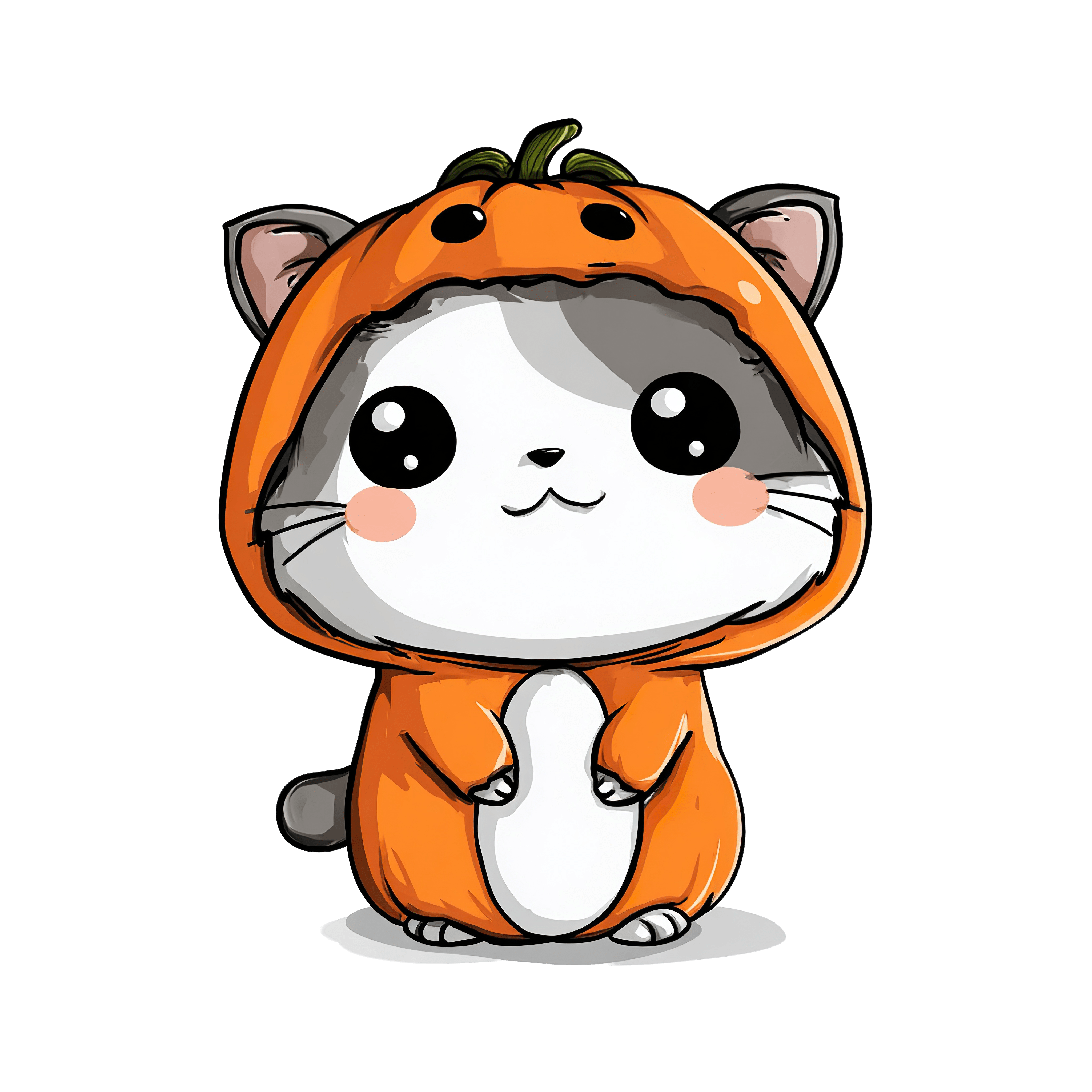 Illustrated cartoon cat wearing an orange pumpkin-themed hoodie. The cat has a white and gray face with bright, expressive eyes. Its ears are visible through the hood, which is decorated to resemble a pumpkin with a green stem at the top. The background is plain, emphasizing the character and outfit. This clipart is ideal for Halloween-themed projects or animal illustrations.
