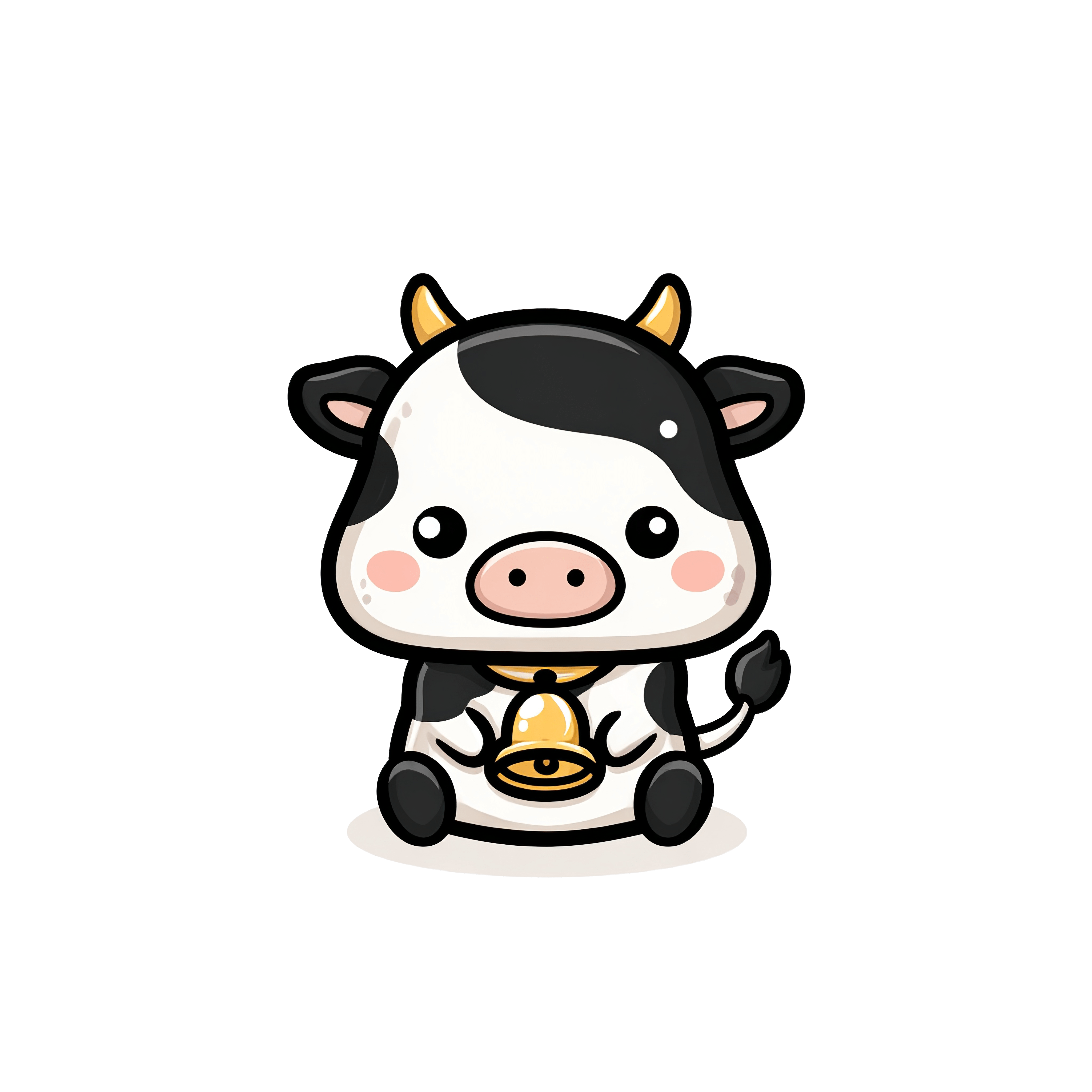 A cartoon-style cow sits centered in the image. It features distinct black spots on its body and wears a prominent bell around its neck. The cow's stylized horns and tail contribute to its simple but clear depiction. The image uses smooth lines and solid colors, common in clipart design.