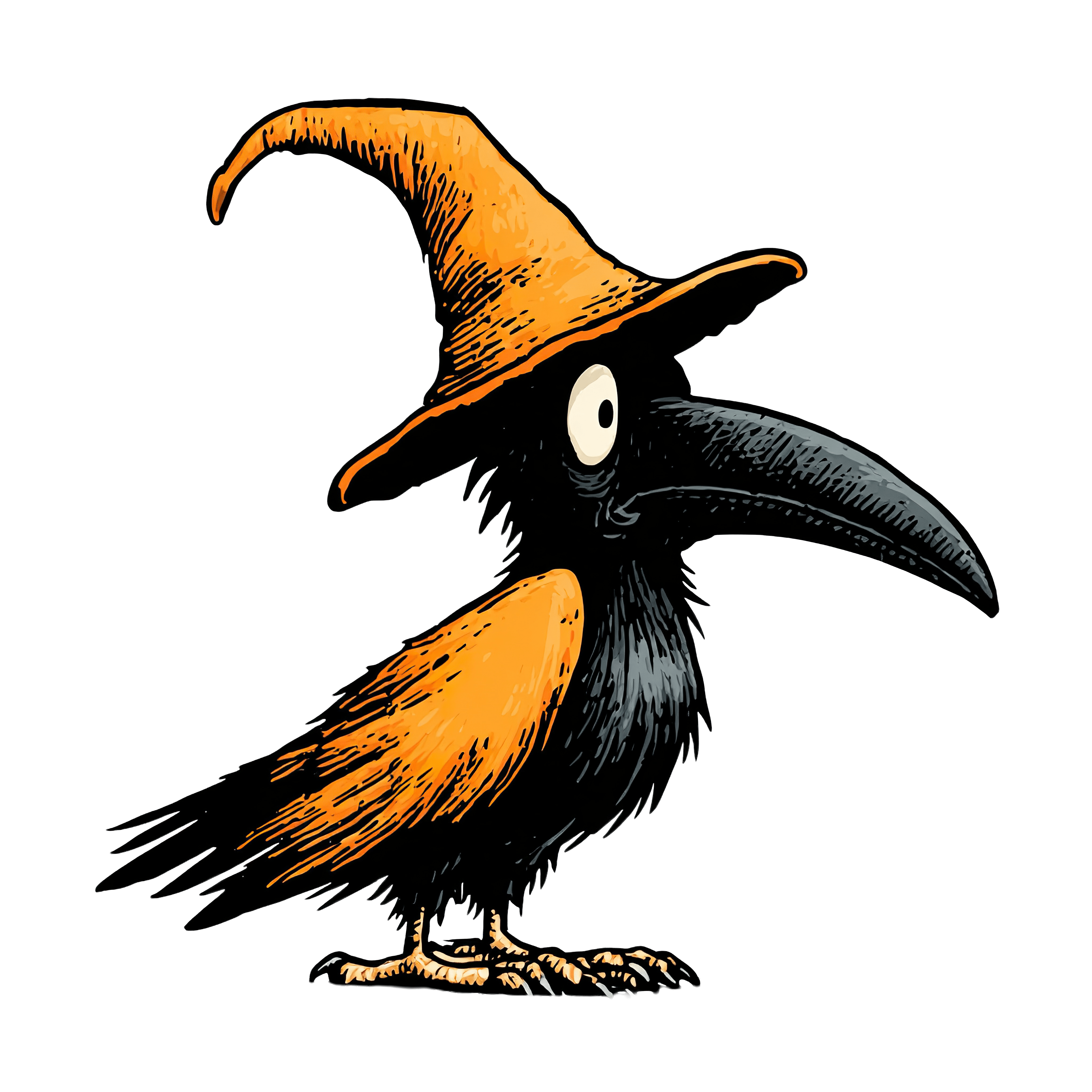 This clipart image depicts a cartoon crow with black feathers and an oversized orange witch hat. The crow stands on the ground, showcasing its prominent dark beak and white eye. The style is simple and bold, emphasizing the contrast between the crow’s black body and the bright orange hat. This illustration captures a whimsical theme, suitable for various creative projects or decorations.