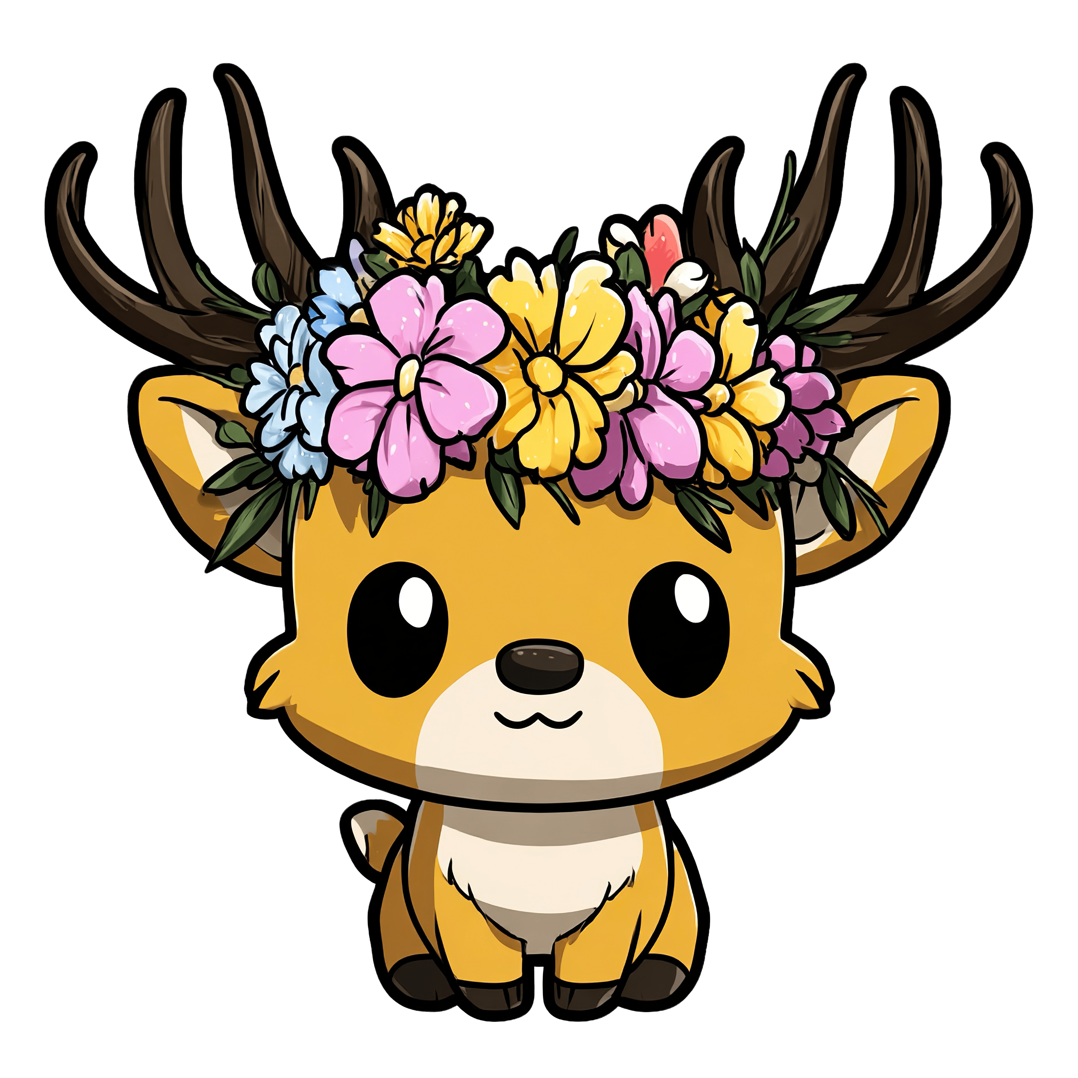 A cartoon deer is depicted with large antlers adorned with a colorful flower crown. The deer is illustrated in a vector art style, featuring neutral brown and yellow tones. Its simplistic design makes it ideal for use as an animal mascot or icon in various projects. This image is available as clipart for creative purposes.