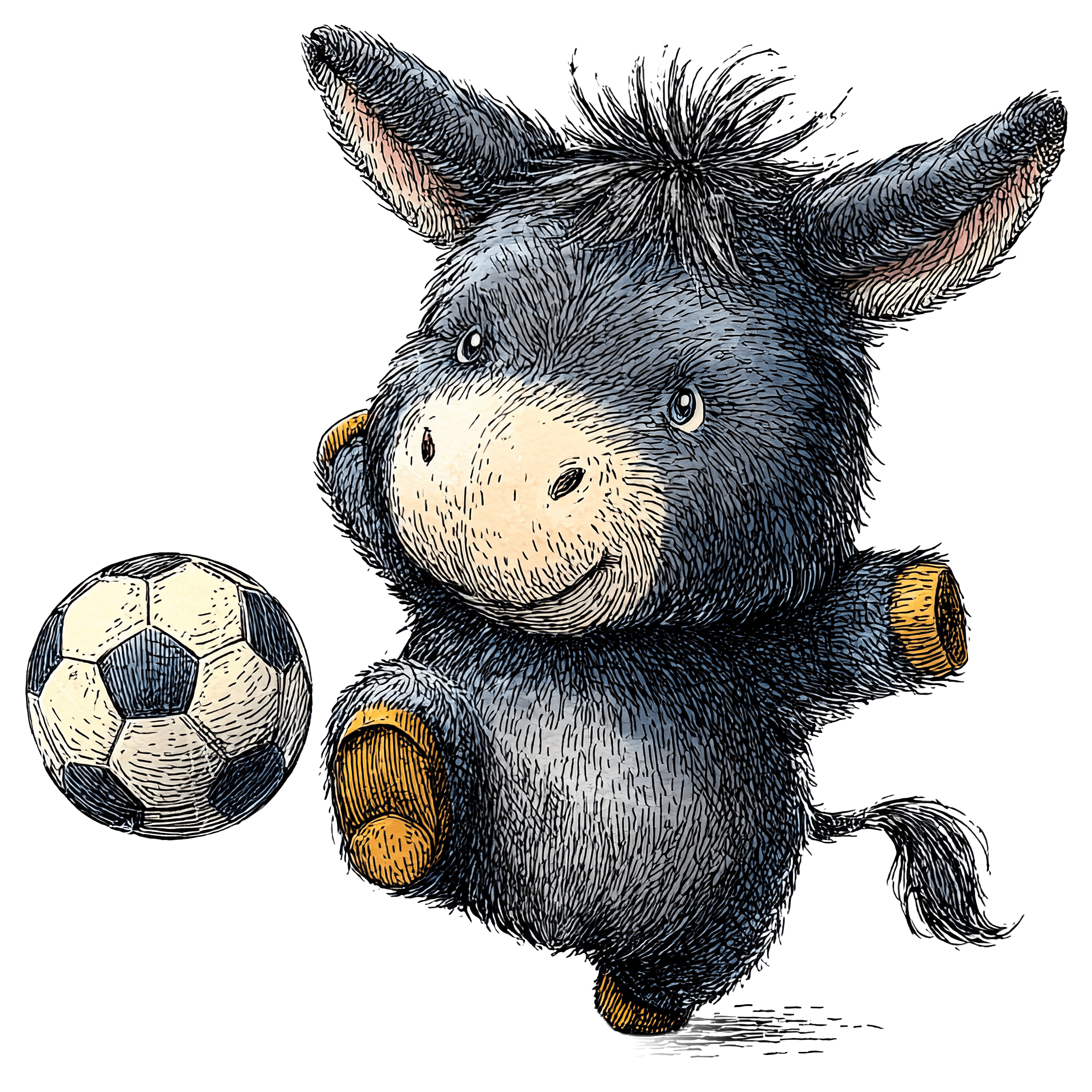 Image shows a cartoon donkey kicking a soccer ball. The donkey has dark gray and white fur and wears orange accents on its hooves. The soccer ball is detailed with black and white panels, showcasing a classic design. This illustration is styled in a hand-drawn, detailed manner, focusing on the playful interaction between the donkey and the ball.