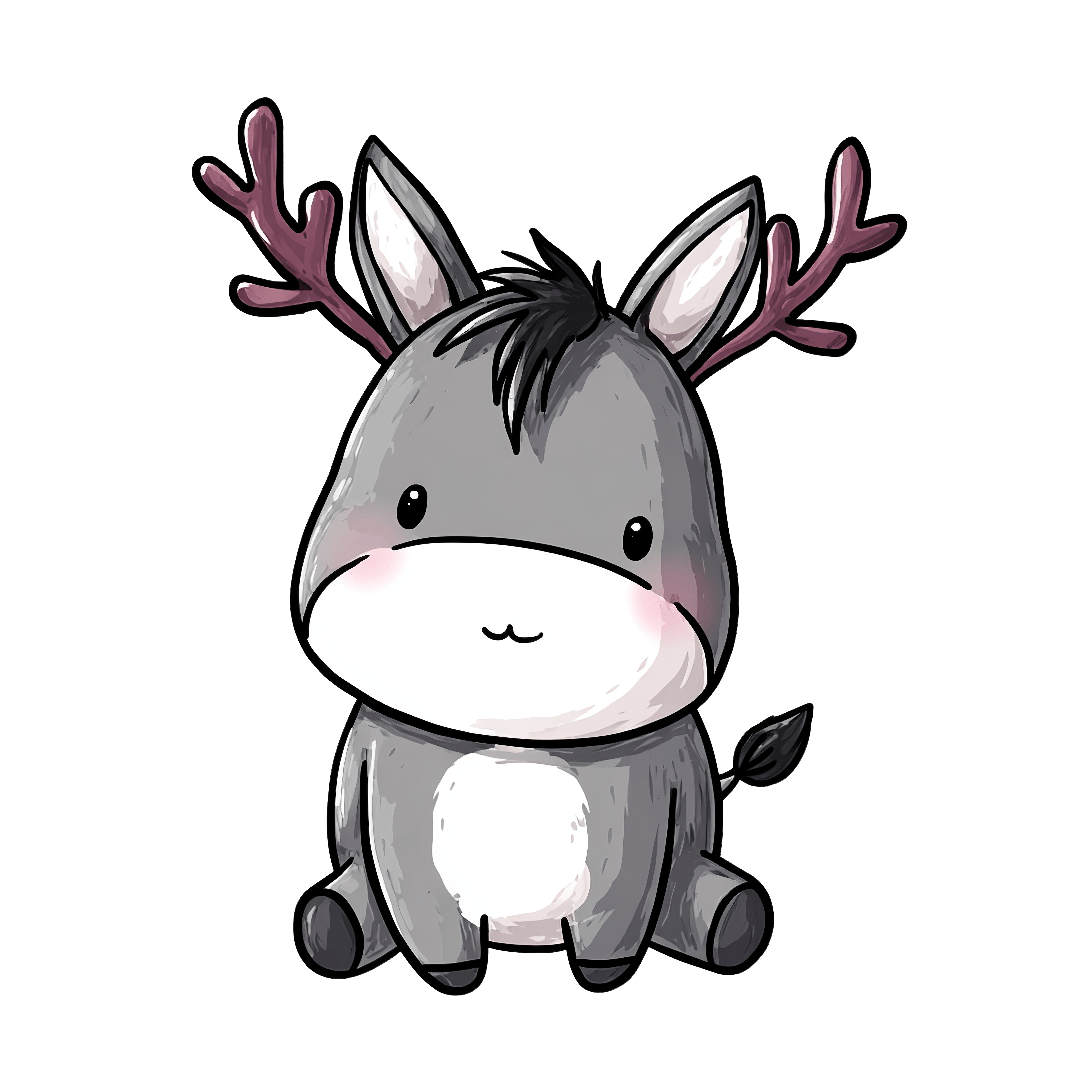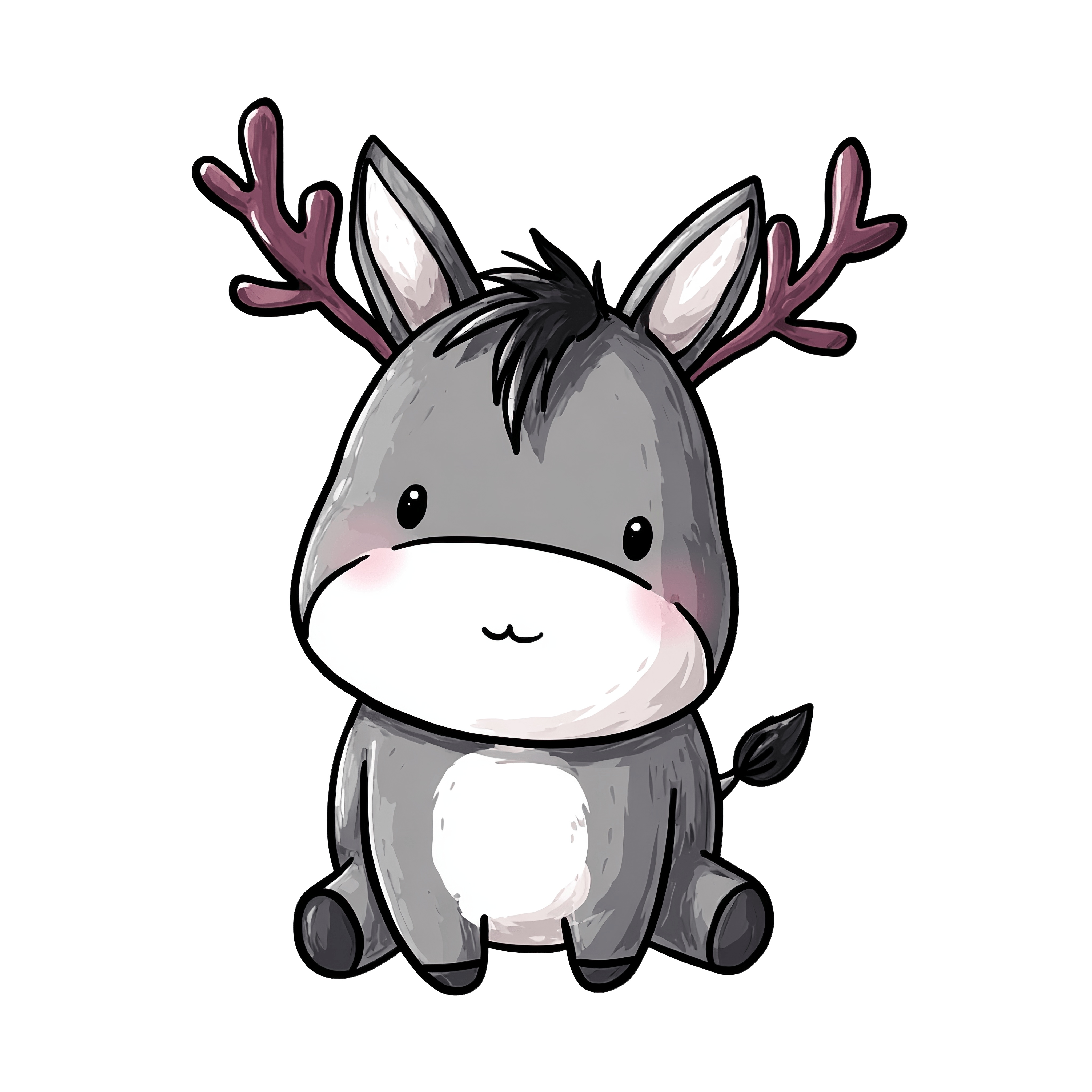 A digital illustration of a donkey with antlers, grey and white fur, and a black tail. It features large ears and simple facial features, sitting in a relaxed pose. The illustration is created in a cartoon style, isolated on a black background, with subtle shading to add depth. The unusual combination of donkey and antlers adds a unique touch to the artwork, making it distinct and engaging.