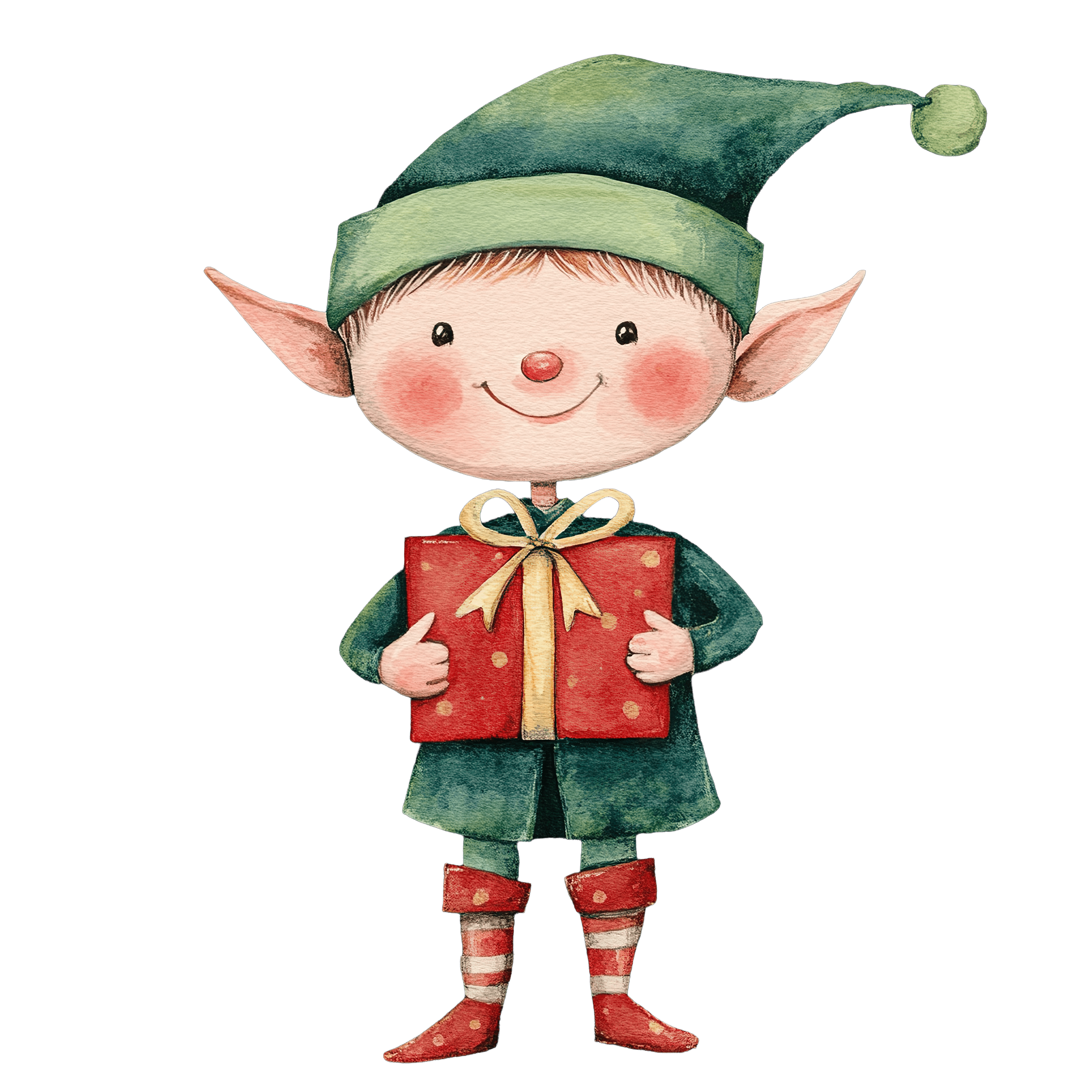 Cartoon elf holding a wrapped gift with festive attire and hat Elf in festive attire holding a red gift tied with a yellow ribbon.Download PNG ▼Download JPG ▼Related posts:Pink And Orange Butterfly With Detailed Wing PatternsRaspberry Chocolate Cake Slice with Cream Layers dessert clipart vector art printableLychee Drink with Fresh Lychees and Lemon SliceGlass Bowl of Creamy Risotto with Fresh Basil LeavesSkunk wearing a festive party hatWoman in Santa Hat with Snowflakes and Red Dress AccentVampire Character in Classic Black and Red CapeBlue and White Watercolor Snowflake with Intricate Leaf PatternsCartoon Elephant Large Ears Tusks Clipart PngKoala Clipart Illustration on BranchFestive Holiday Doorway with Wreaths and Red BowsPenguin wearing a green patterned sweater