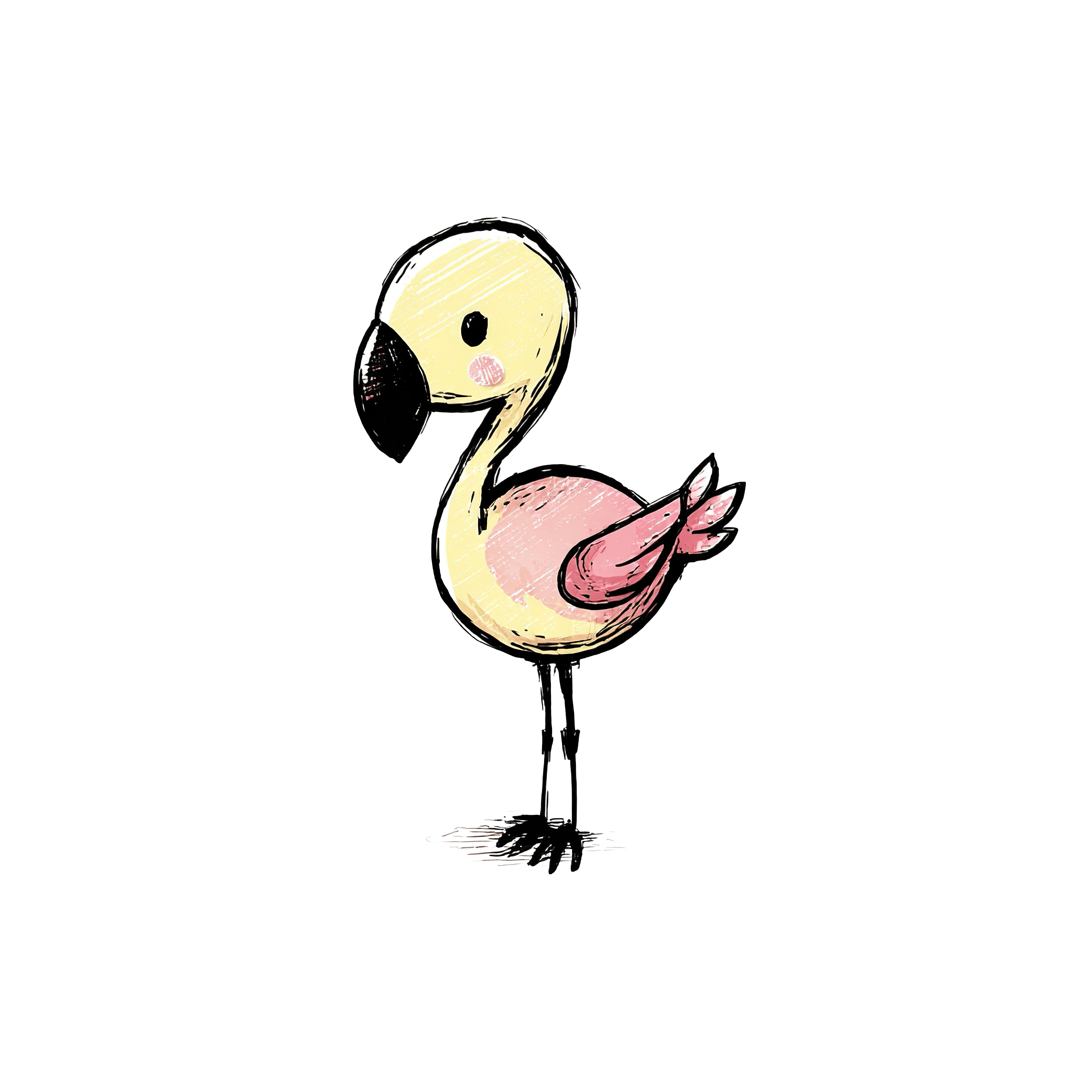 Illustration of a flamingo in a cartoon style. The bird features a yellow head and body with pink highlights on its wings and belly, and a black beak. The drawing is simple, with minimal details, accentuated by bold outlines. The posture shows the flamingo standing upright, with its attention forward. This clipart is suitable for educational materials, children's books, or decorations, offering a playful animal depiction.