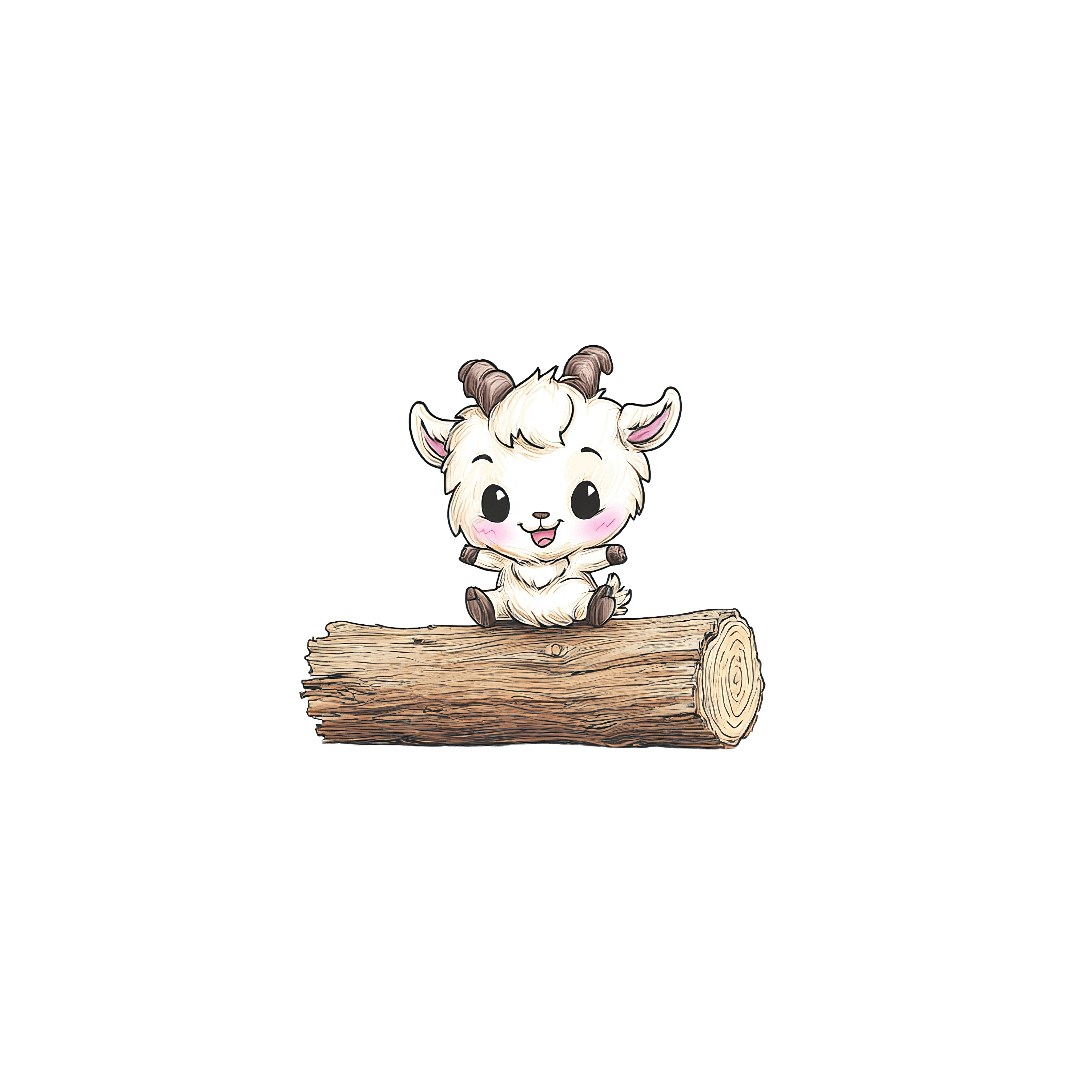 The image features a cartoon-style goat seated atop a horizontal wooden log. The goat has small horns and is predominantly white with some brown details. It is positioned facing forward, centered on the log, with a simple expression. This illustration is suitable for use as a children's clipart or other decorative purposes.