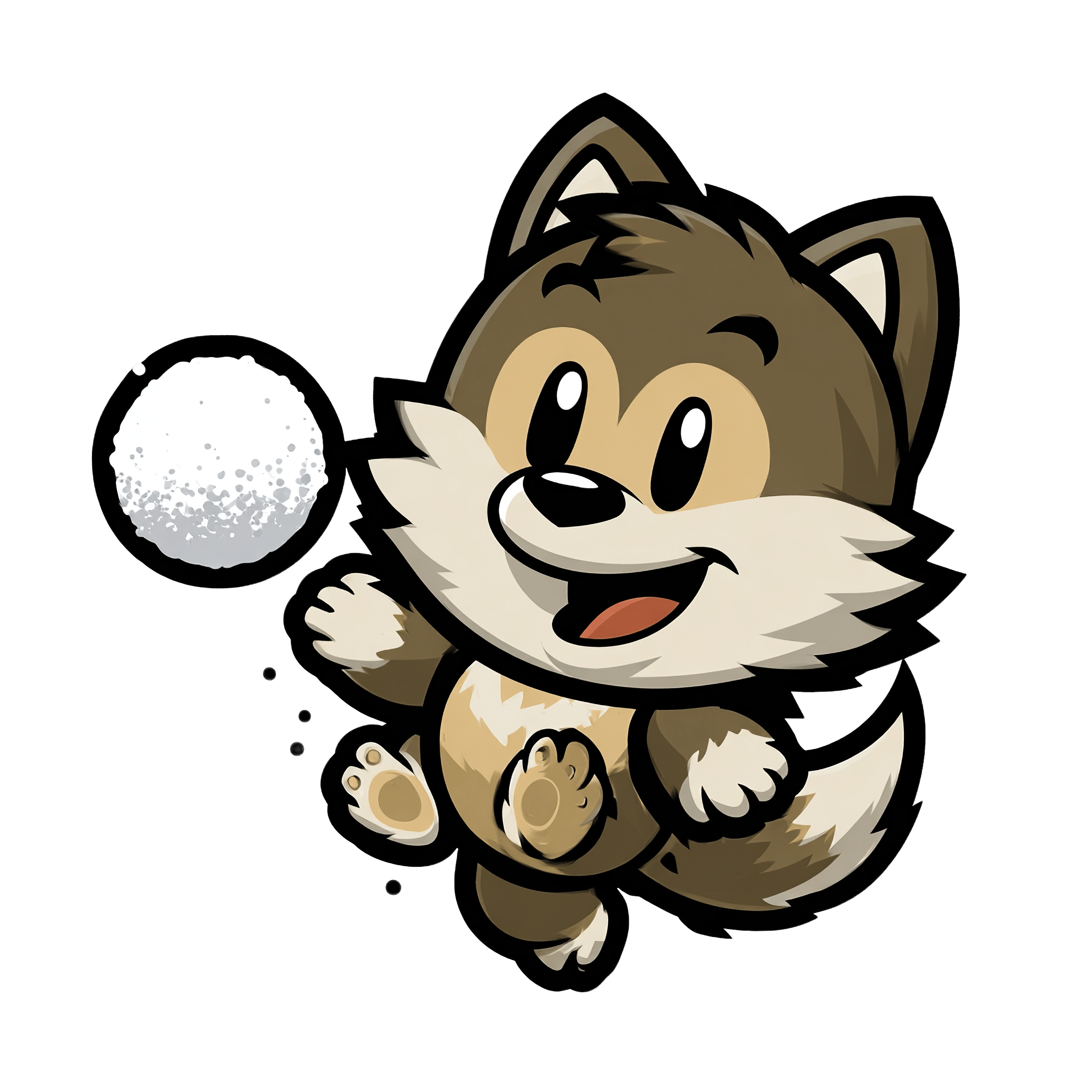 Husky illustration with dark brown and cream fur holding a snowball. Both paws extended and mouth open in a dynamic pose. Includes detailed fur markings and expressive eyes, capturing a lively winter theme with minimalistic styling.