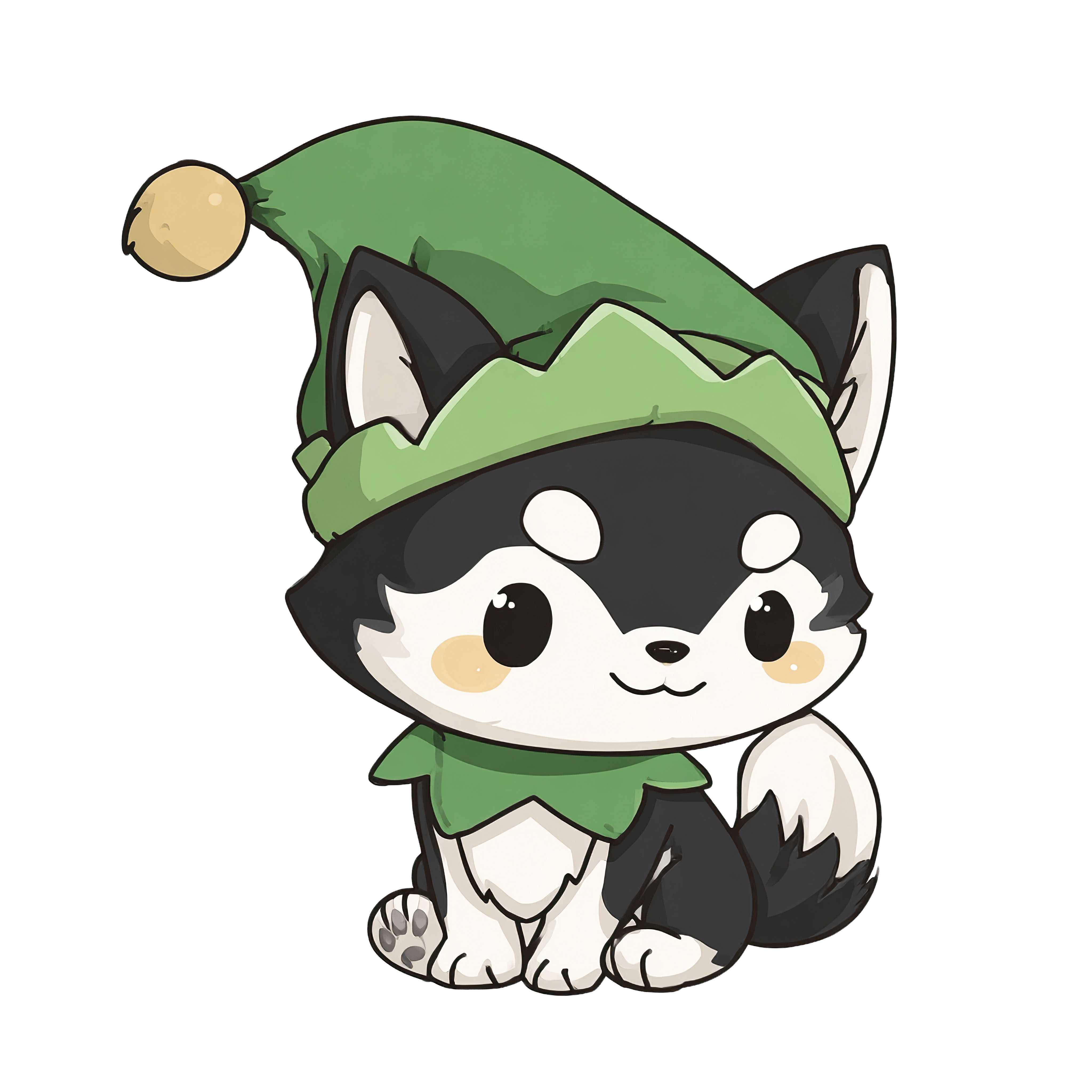 This clipart image features a cartoon depiction of a husky dog wearing a green elf hat. The husky sits in a simple, stylized form with notable black and white fur patterns. Its facial features are exaggerated to fit the cartoon style. The hat is green with a distinct design resembling an elf hat. The image is a vector illustration, making it suitable for various uses, including printing and digital projects.