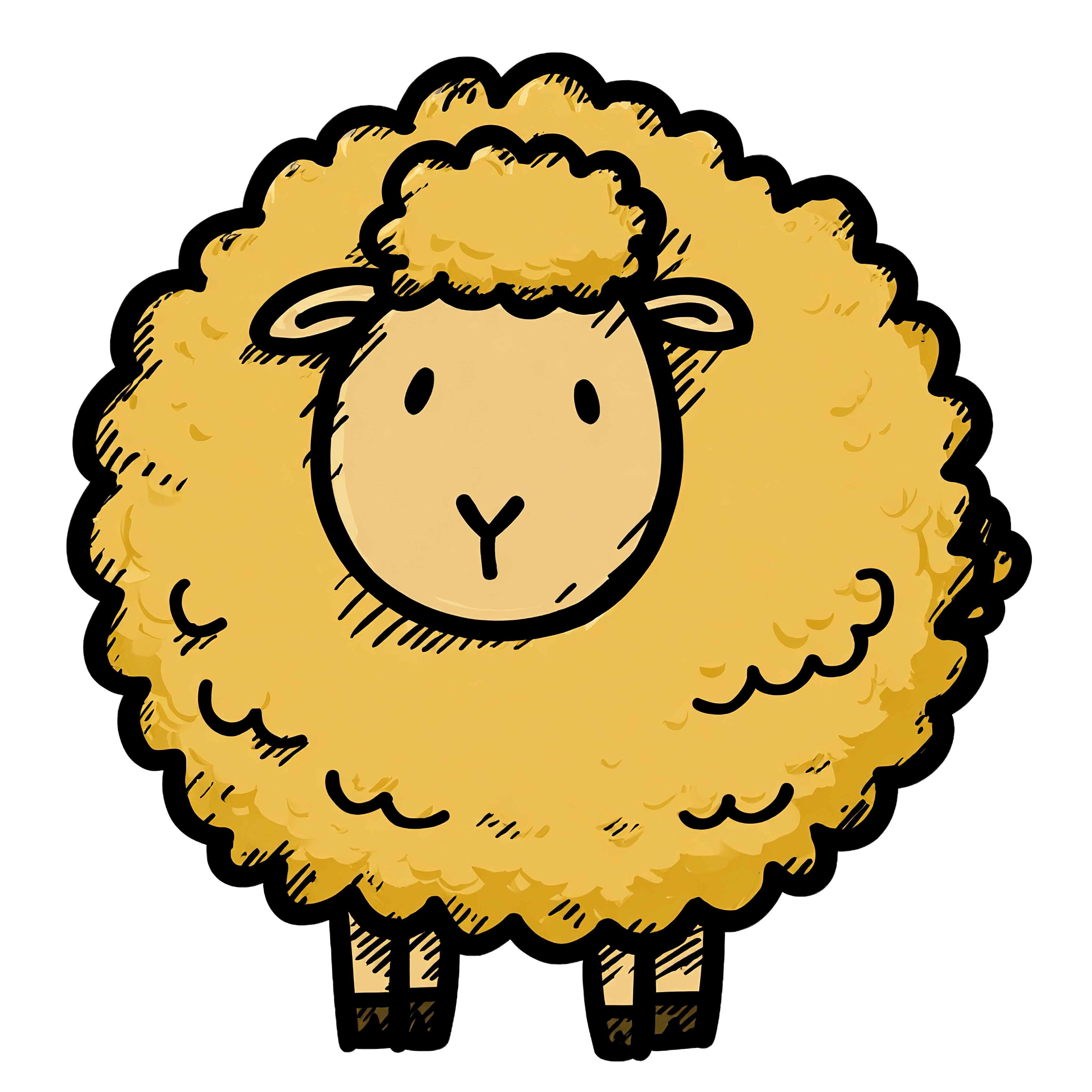 Yellow woolly sheep depicted in a cartoon style with simple features. The image focuses on the sheep's round body, small face, and fluffy wool. Legs and ears are minimalistic, enhancing the simplistic design. Outlined in bold, dark lines, this clipart is suitable for educational materials, farm-related projects, or children's books.