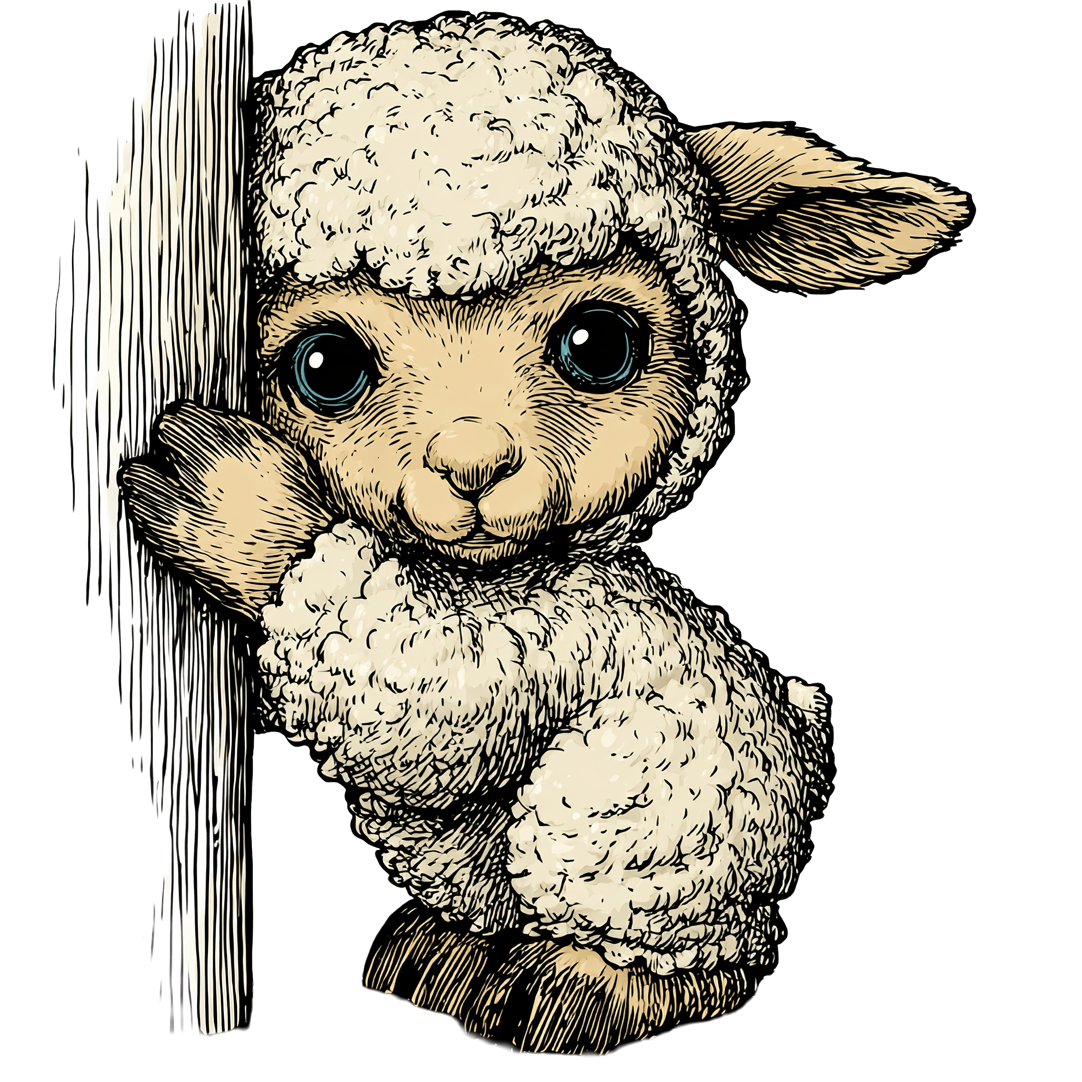 This clipart features a cartoon lamb peeking from behind a wooden fence. The lamb has textured, woolly fur and attentive large eyes, sketched in detailed lines. The design is clear and simple, suitable for various creative uses. The black background makes the figure stand out, highlighting its features effectively.