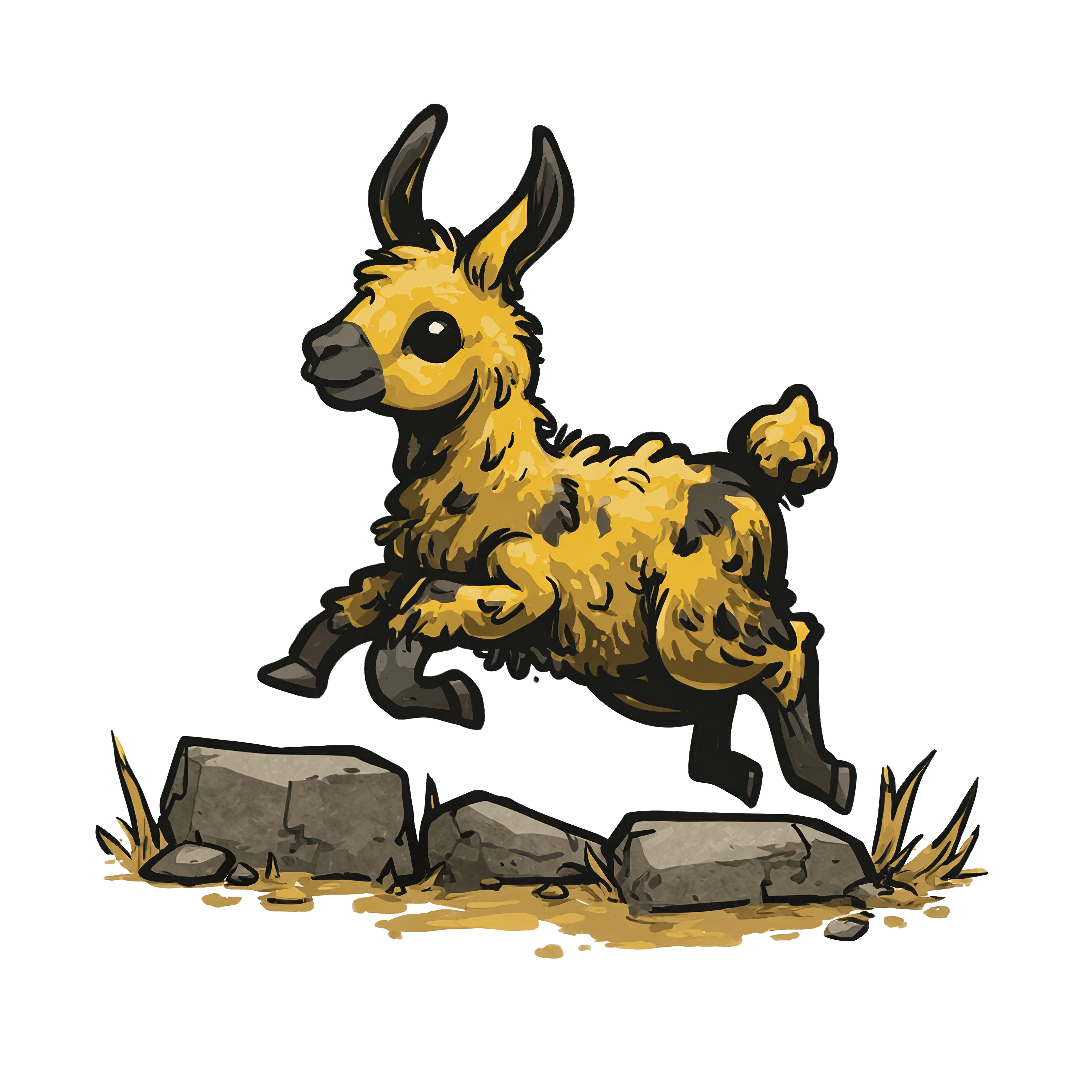 This image features a cartoon llama jumping over rocks. The illustration uses a yellow and black color scheme with bold outlines, capturing the llama mid-air. The style is simplistic and ideal for clipart collections. The setting focuses solely on the llama's action, making it suitable for projects requiring a lively animal depiction.