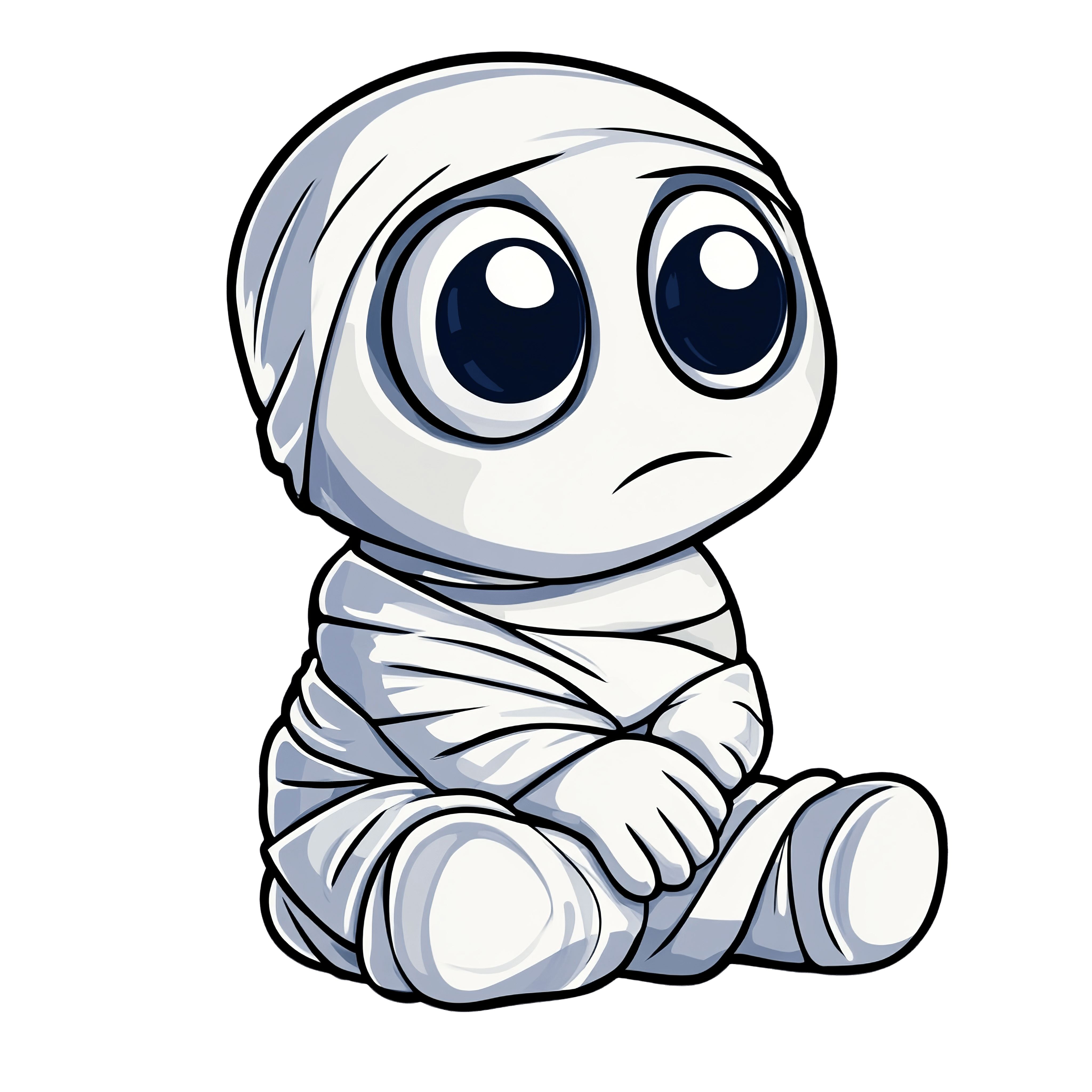Cartoon Mummy Character with Large Eyes Sitting Down Cartoon mummy character with large eyes wrapped in white bandages.Download PNG ▼Download JPG ▼Related posts:Pecan Pie with Slice Removed Showing Nut ToppingWhole and Halved Green Pumpkin with Seeds holiday clipart vegetable food harvestTiger cub playing with a yellow ballRed and White Glittery Christmas Ornament with Silver CapButterfly With Vibrant Wings And Eye Like Patterns InsectFamily Portrait in Winter Clothing with Santa HatWatercolor Illustration of Snowy Mountains with a Bright Yellow SunCartoon Witch Character Riding a Broomstick for HalloweenWatercolor Mizuna Greens with Varied Leaf ShapesGeometric Heart Shape with Colorful Triangular PatternsRed and Green Poinsettia with Dewdrops on Leaves IllustrationCeramic Teacup with Festive Christmas Holly and Berry Pattern