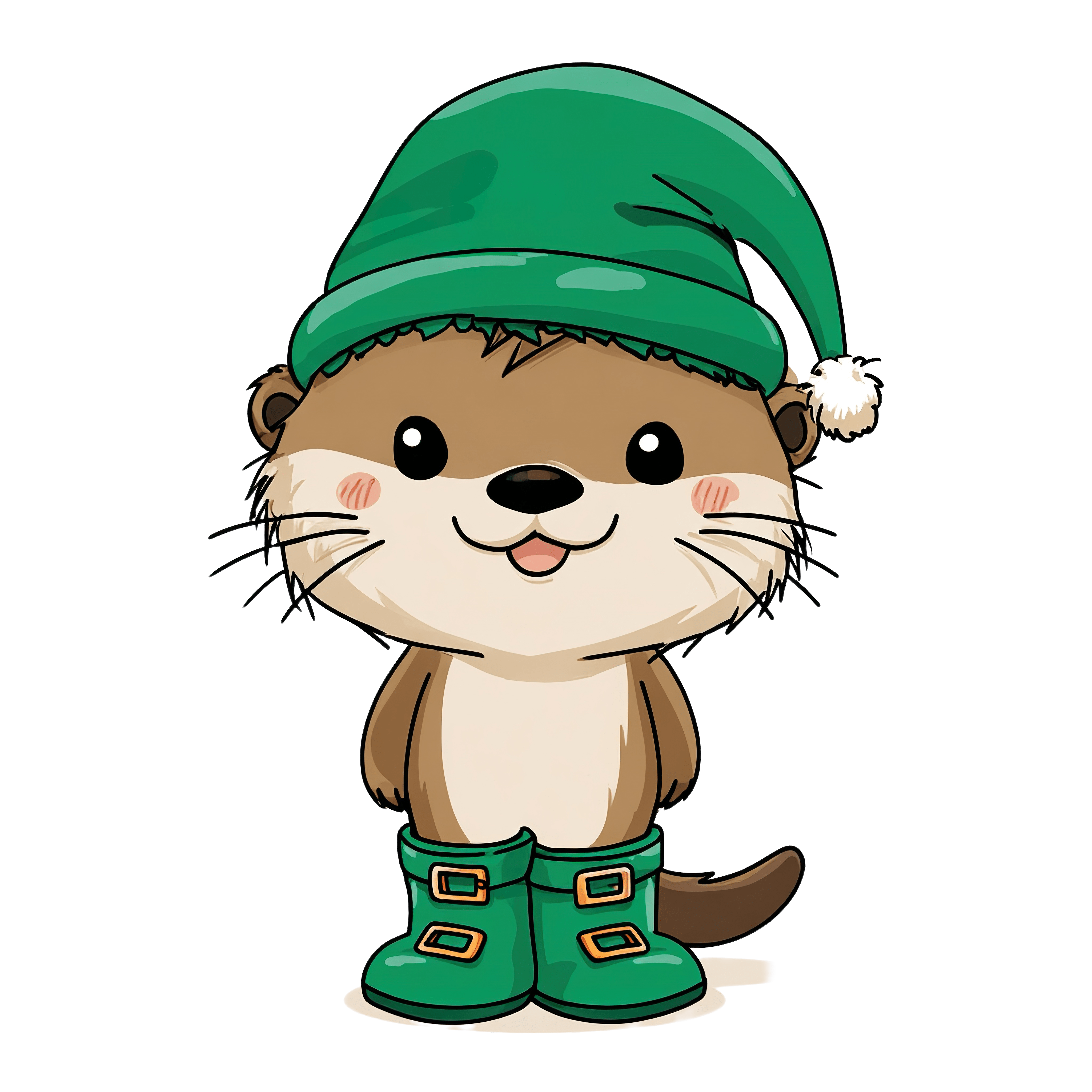 Cartoon otter wearing a playful green elf hat with a white pom-pom and matching green boots. The otter's simple design features brown fur, a soft cream front, and a friendly expression. Perfect for holiday-themed projects or animal illustrations, this character can add whimsy to any creation with its festive accessories.