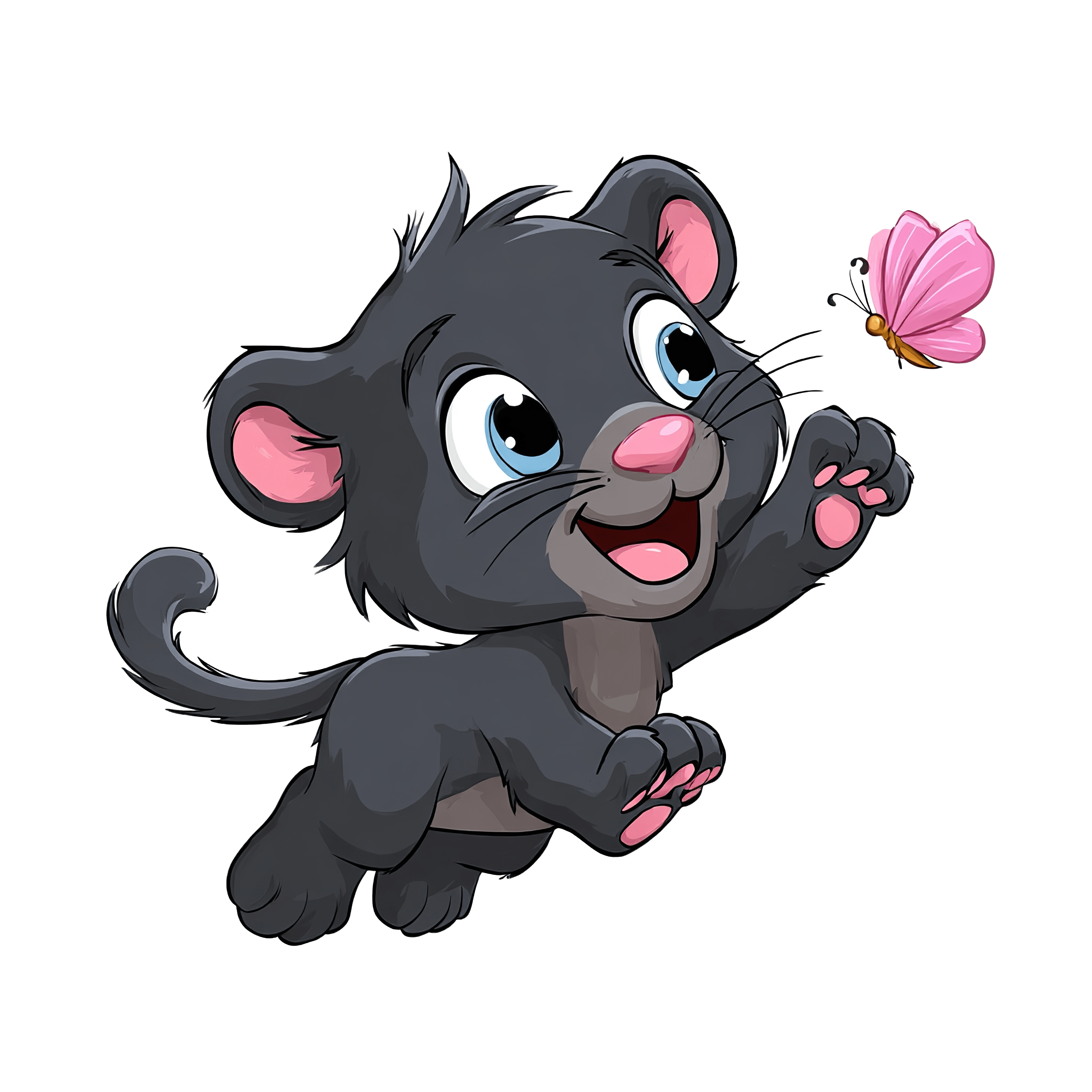 Panther cub with black fur and blue eyes reaching for a pink butterfly, showcasing a playful interaction. Its small, rounded ears and expressive face are highlighted. The illustration uses a cartoon style, emphasizing the panther's youthful energy and the vibrant pink of the butterfly's wings. A simple and clean design suitable for various applications.