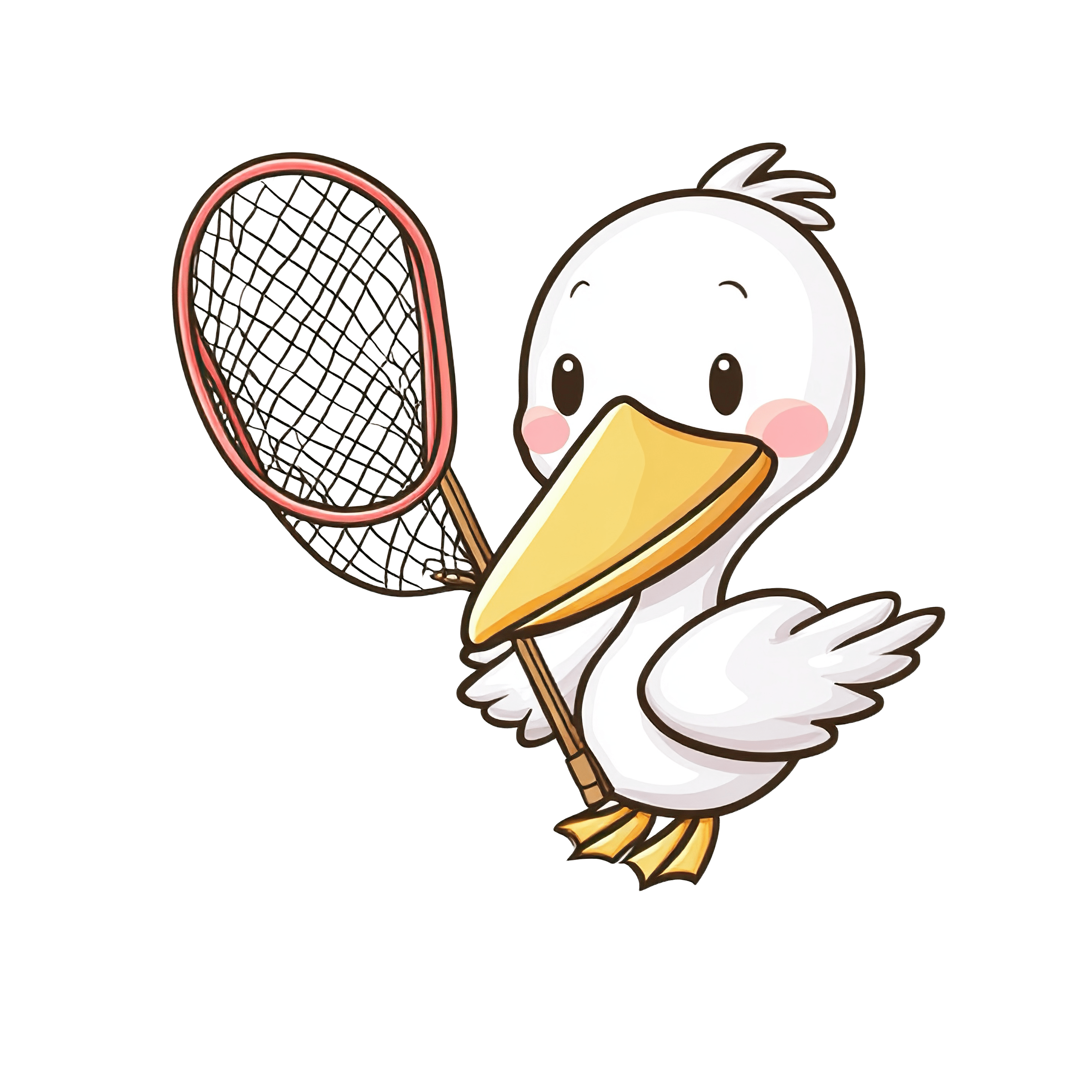 Pelican depicted with a large yellow bill and small eyes, clutching a fishing net. The pelican's body showcases white feathers, highlighted by subtle shading, and the net features a red frame with a black mesh. This vector art style clipart has a clean, simplified design ideal for educational materials or playful illustrations.