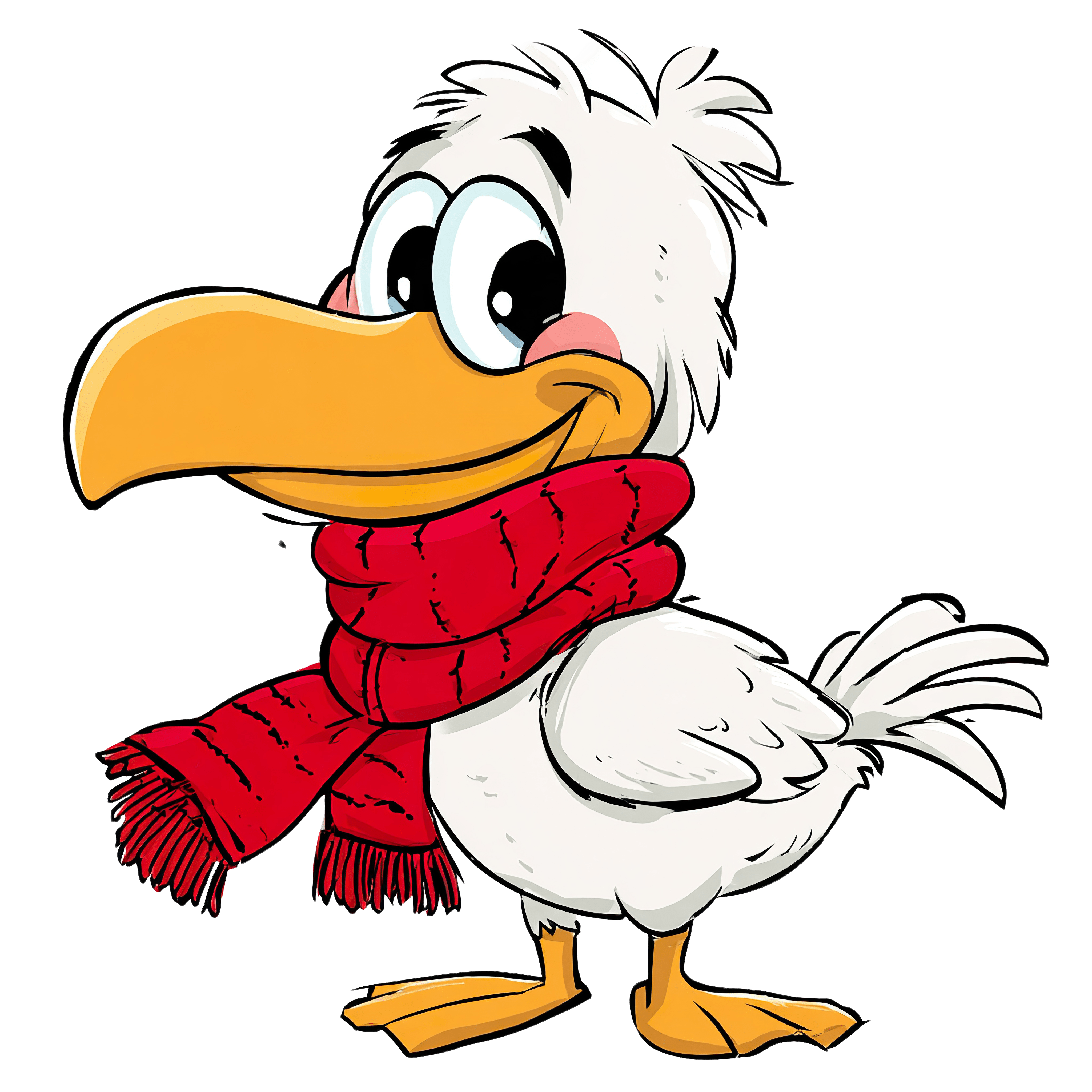 Pelican in a cartoon style, featuring a large yellow beak and big eyes. Its white feathers are complemented by a bright red scarf wrapped around its neck. The bird stands upright engagingly, with defined lines and shading creating a friendly, approachable look. Ideal for use in various art projects and design applications, this character is presented with a clean, simple style that highlights its colorful elements.