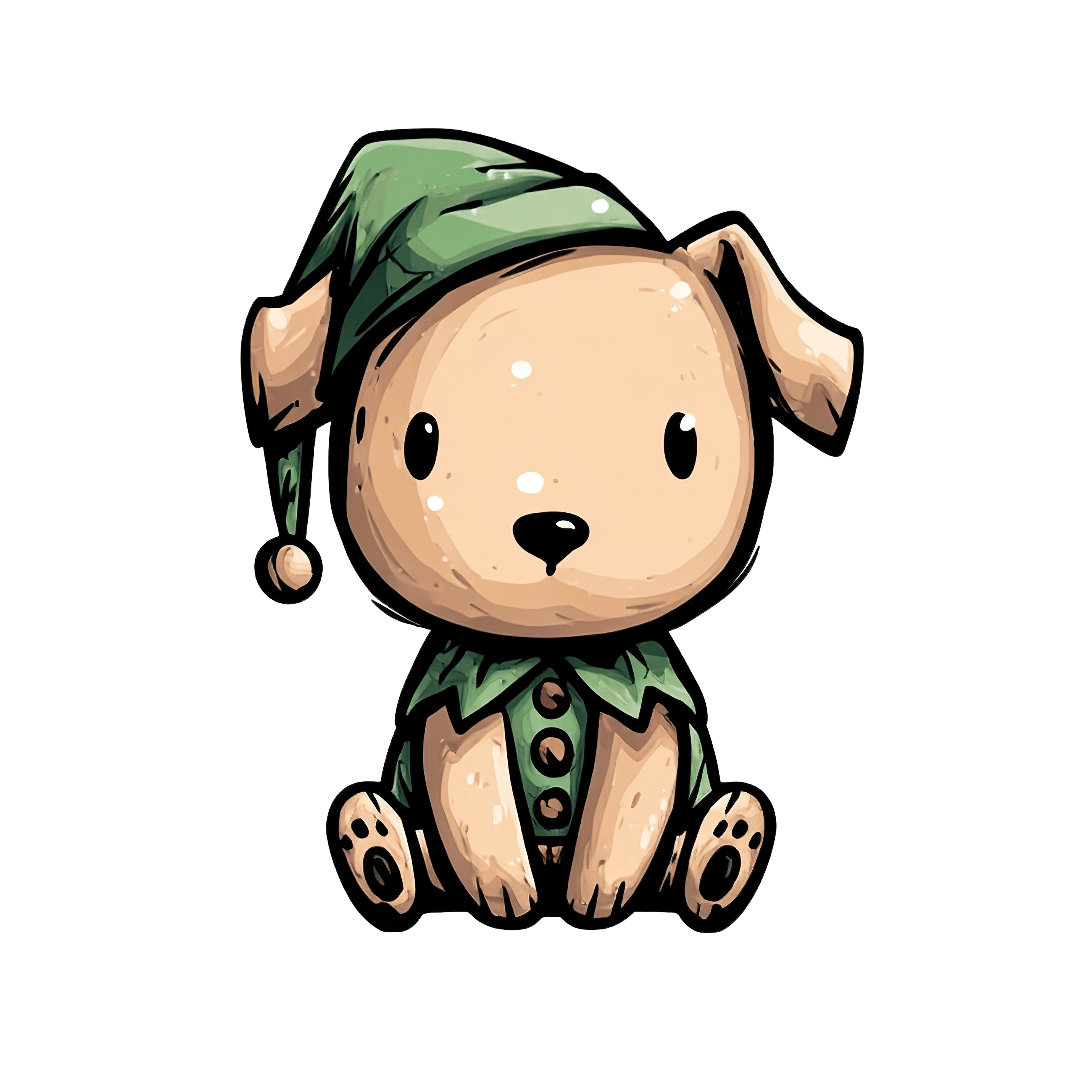 Cartoon illustration of a light brown puppy sitting, wearing a green elf costume complete with a pointed hat and collar. The design is simple, focusing on basic shapes and colors, suitable for decorative or educational purposes. Black outlines emphasize the character's features, making it stand out as a stylized graphic element.